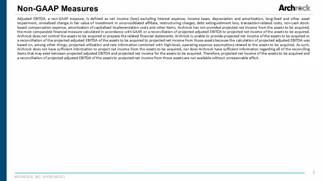 ARCHROCK, INC. (NYSE:AROC) 3 Non - GAAP Measures Adjusted EBITDA, a non - GAAP measure, is defined as net income (loss) excluding interest expense, income taxes, depreciation and amortization, long - lived and other asset impairment, unrealized change in fair value of investment in unconsolidated affiliate, restructuring charges, debt extinguishment loss, transaction - related costs, non - cash stock - based compensation expense, amortization of capitalized implementation costs and other items . Archrock has not provided projected net income from the assets to be acquired, the most comparable financial measure calculated in accordance with GAAP, or a reconciliation of projected adjusted EBITDA to projected net income of the assets to be acquired . Archrock does not control the assets to be acquired or prepare the related financial statements . Archrock is unable to provide projected net income of the assets to be acquired or a reconciliation of the projected adjusted EBITDA of the assets to be acquired to projected net income from those assets because the calculation of projected adjusted EBITDA was based on, among other things, projected utilization and rate information combined with high - level, operating expense assumptions related to the assets to be acquired . As such, Archrock does not have sufficient information to project net income from the assets to be acquired, nor does Archrock have sufficient information regarding all of the reconciling items that may exist between projected adjusted EBITDA and projected net income for the assets to be acquired . Therefore, projected net income of the assets to be acquired and a reconciliation of projected adjusted EBITDA of the assets to projected net income from those assets are not available without unreasonable effort .