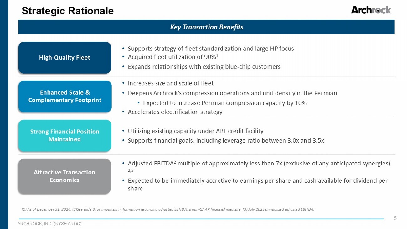 ARCHROCK, INC. (NYSE:AROC) 4 Transaction Overview Acquisition Highlights ▪ Archrock to acquire Natural Gas Compression Systems, Inc. and NGCSE, Inc. (collectively “NGCS”) for approximately $357 million: ▪ $298 million cash, funded with existing capacity on ABL credit facility ▪ Up to 2.312 2 million Archrock common shares issued to the sellers ▪ 351,000 1 primarily large compression horsepower (HP): ▪ 316,000 operating HP ▪ 35,000 HP backlog of new equipment to be delivered ▪ Transaction multiple of less than 7.0x expected run - rate of annualized July 2025 adjusted EBITDA 3 , exclusive of any anticipated synergies ▪ Expected to close in the second quarter of 2025, subject to customary closing conditions (1) 316,000 operating HP as of December 31, 2024, with the remaining as backlog to be delivered. (2) Based on 10 - day VWAP through 3/7/25 . (3) See slide 3 for important information regarding adjusted EBITDA, a non - GAAP financial measure. (4) AROC and NGCS as of December 31, 2024. ▪ 4.5 million operating HP ▪ 815k HP electric motor drive compression ▪ 2.5 million operating HP in Permian ▪ 96% fleet utilization Adding to Leading Contract Compression Position 4