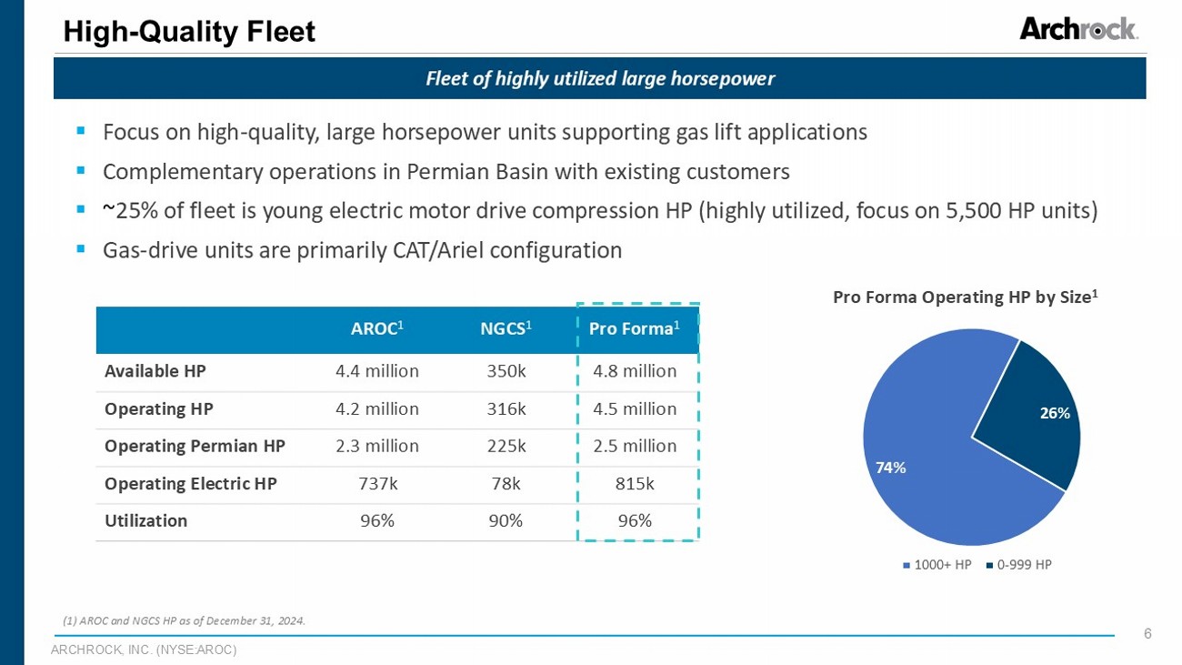ARCHROCK, INC. (NYSE:AROC) 5 Strategic Rationale Key Transaction Benefits Enhanced Scale & Complementary Footprint • Increases size and scale of fleet • Deepens Archrock’s compression operations and unit density in the Permian • Expected to increase Permian compression capacity by 10% • Accelerates electrification strategy High - Quality Fleet • Supports strategy of fleet standardization and large HP focus • Acquired fleet utilization of 90% 1 • Expands relationships with existing blue - chip customers Strong Financial Position Maintained • Utilizing existing capacity under ABL credit facility • Supports financial goals, including leverage ratio between 3.0x and 3.5x Attractive Transaction Economics • Adjusted EBITDA 2 multiple of approximately less than 7x (exclusive of any anticipated synergies) 2,3 • Expected to be immediately accretive to earnings per share and cash available for dividend per share (1) As of December 31, 2024. (2)See slide 3 for important information regarding adjusted EBITDA, a non - GAAP financial measure. (3) July 2025 annualized adjusted EBITDA.