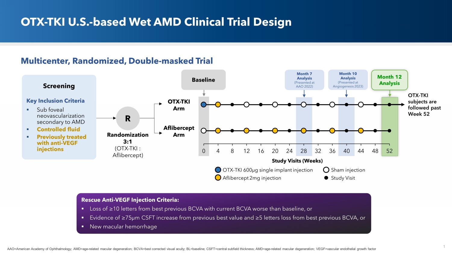Month 10 Analysis (Presented at Angiogenesis 2023) Month 7 Analysis (Presented at AAO 2022) 1 OTX - TKI U.S. - based Wet AMD Clinical Trial Design OTX - TKI Arm Aflibercept Arm OTX - TKI 600µg single implant injection Aflibercept 2mg injection Sham injection Study Visit Multicenter, Randomized, Double - masked Trial Screening Key Inclusion Criteria ▪ Sub foveal neovascularization secondary to AMD ▪ Controlled fluid ▪ Previously treated with anti - VEGF injections Rescue Anti - VEGF Injection Criteria: ▪ Loss of ≥10 letters from best previous BCVA with current BCVA worse than baseline, or ▪ Evidence of ≥75µm CSFT increase from previous best value and ≥5 letters loss from best previous BCVA, or ▪ New macular hemorrhage Baseline Month 12 Analysis 0 4 8 12 16 20 24 28 32 36 40 44 48 52 Study Visits (Weeks) AAO=American Academy of Ophthalmology; AMD=age - related macular degeneration; BCVA=best corrected visual acuity; BL=baseline; CSF T=central subfield thickness; AMD=age - related macular degeneration; VEGF=vascular endothelial growth factor OTX - TKI subjects are followed past Week 52 Randomization 3:1 (OTX - TKI : Aflibercept) R