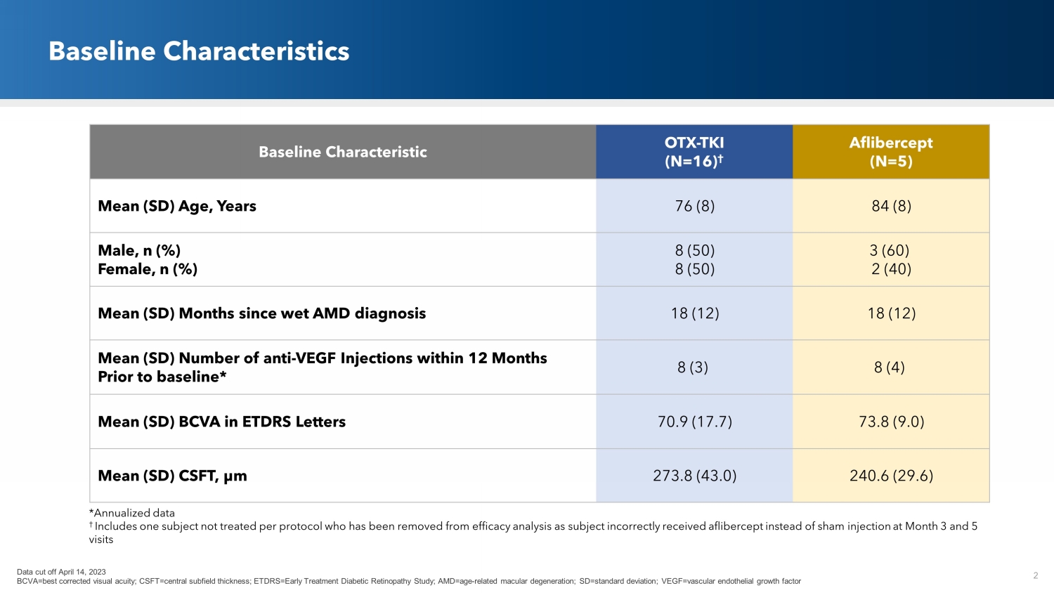 2 Baseline Characteristics Baseline Characteristic OTX - TKI (N=16) † Aflibercept (N=5) Mean (SD) Age, Years 76 (8) 84 (8) Male, n (%) Female, n (%) 8 (50) 8 (50) 3 (60) 2 (40) Mean (SD) Months since wet AMD diagnosis 18 (12) 18 (12) Mean (SD) Number of anti - VEGF Injections within 12 Months Prior to baseline* 8 (3) 8 (4) Mean (SD) BCVA in ETDRS Letters 70.9 (17.7) 73.8 (9.0) Mean (SD) CSFT, µm 273.8 (43.0) 240.6 (29.6) *Annualized data † Includes one subject not treated per protocol who has been removed from efficacy analysis as subject incorrectly received afl ibe rcept instead of sham injection at Month 3 and 5 visits Data cut off April 14, 2023 BCVA=best corrected visual acuity; CSFT =c entral subfield thickness; ETDRS = Early Treatment Diabetic Retinopathy Study; AMD = age - related macular degeneration; SD = standard deviation; VEGF = vascular endothelial growth factor