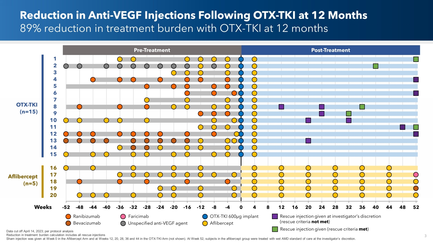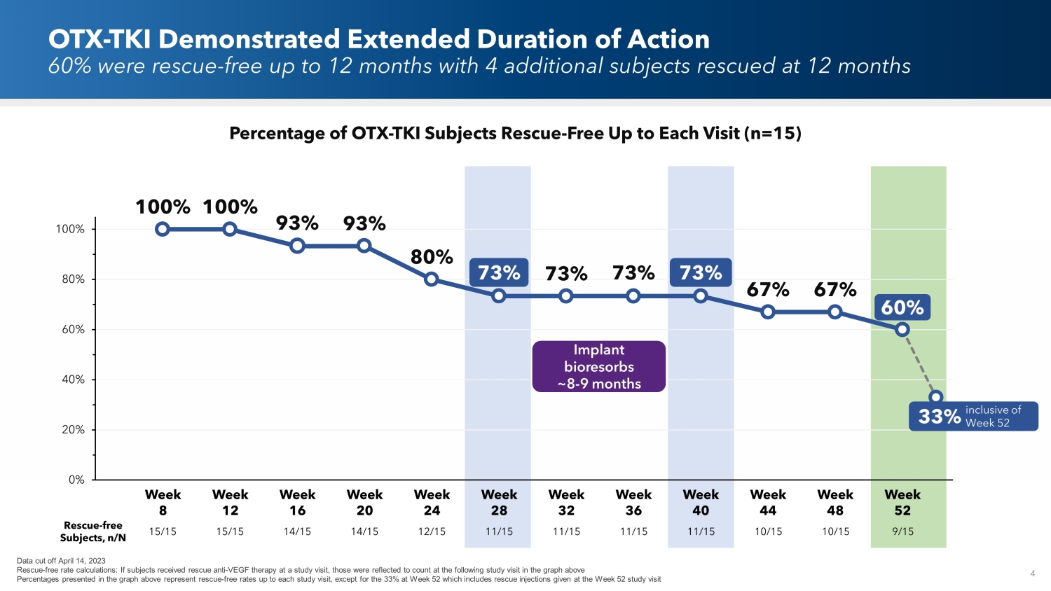 -52 -48 -44 -40 -36 -32 -28 -24 -20 -16 -12 -8 -4 0 4 8 12 16 20 24 28 32 36 40 44 48 52 Weeks OTX - TKI (n=15) Aflibercept (n=5) 1 2 3 4 5 6 7 8 9 10 11 12 13 14 15 16 17 18 19 20 Reduction in Anti - VEGF Injections Following OTX - TKI at 12 Months 89% reduction in treatment burden with OTX - TKI at 12 months Ranibizumab Faricimab OTX - TKI 600µg implant Unspecified anti - VEGF agent Bevacizumab Rescue injection given at investigator’s discretion (rescue criteria not met ) Post - Treatment Pre - Treatment 3 Data cut off April 14, 2023; per protocol analysis Reduction in treatment burden calculation includes all rescue injections Sham injection was given at Week 0 in the Aflibercept Arm and at Weeks 12, 20, 28, 36 and 44 in the OTX - TKI Arm (not shown). At Week 52, subjects in the aflibercept group were treated with wet AMD standard of care at the investigator’s discretion. Rescue injection given (rescue criteria met ) Aflibercept