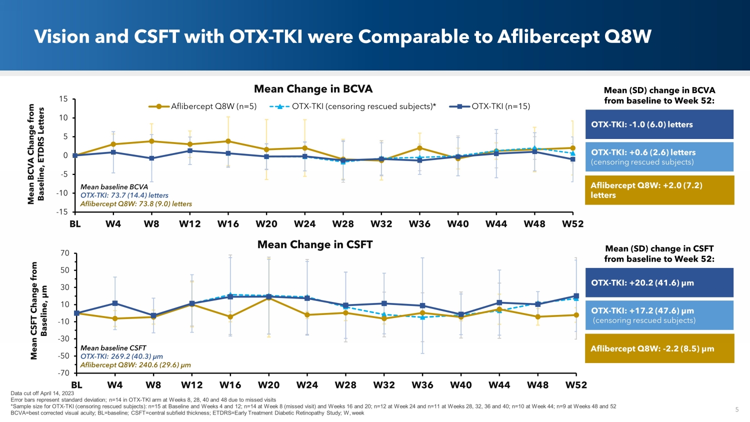 100% 100% 93% 93% 80% 73% 73% 73% 73% 67% 67% 60% 0% 20% 40% 60% 80% 100% Percentage of OTX - TKI Subjects Rescue - Free Up to Each Visit (n=15) 4 OTX - TKI Demonstrated Extended Duration of Action 60% were rescue - free up to 12 months with 4 additional subjects rescued at 12 months Data cut off April 14, 2023 Rescue - free rate calculations: If subjects received rescue anti - VEGF therapy at a study visit, those were reflected to count at the following study visit in the graph above Percentages presented in the graph above represent rescue - free rates up to each study visit, except for the 33% at Week 52 which includes rescue injections given at the Week 52 study visit 15/15 14/15 14/15 12/15 11/15 11/15 11/15 15/15 11/15 Rescue - free Subjects, n/N 10/15 9/15 10/15 Week 8 Week 12 Week 16 Week 20 Week 24 Week 28 Week 32 Week 36 Week 40 Week 44 Week 48 Week 52 33% inclusive of Week 52 Implant bioresorbs ~8 - 9 months