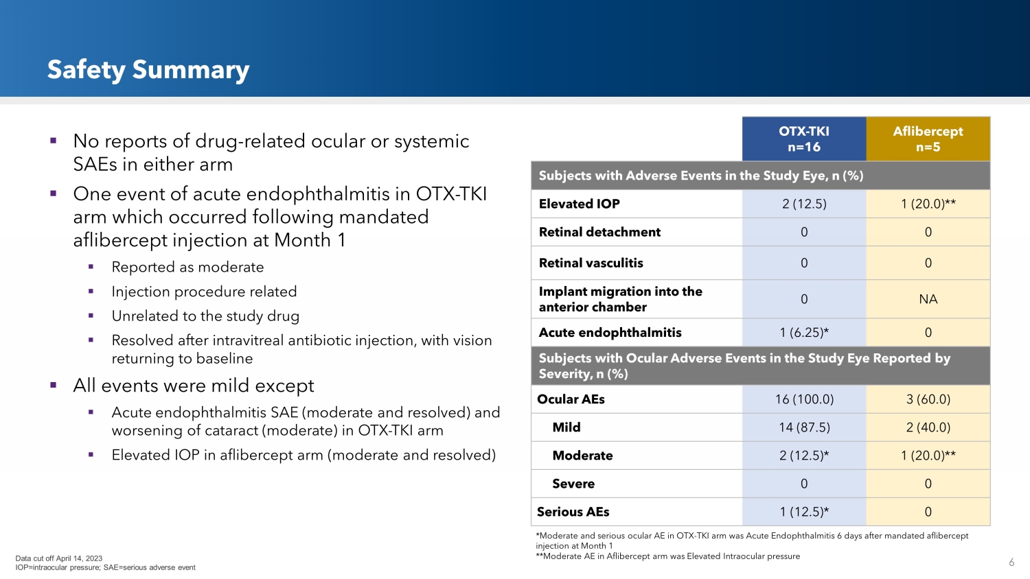 5 Vision and CSFT with OTX - TKI were Comparable to Aflibercept Q8W -70 -50 -30 -10 10 30 50 70 BL W4 W8 W12 W16 W20 W24 W28 W32 W36 W40 W44 W48 W52 Mean CSFT Change from Baseline, µm Mean Change in CSFT -15 -10 -5 0 5 10 15 BL W4 W8 W12 W16 W20 W24 W28 W32 W36 W40 W44 W48 W52 Mean BCVA Change from Baseline, ETDRS Letters Mean Change in BCVA Aflibercept Q8W (n=5) OTX-TKI (censoring rescued subjects)* OTX-TKI (n=15) Mean baseline CSFT OTX - TKI: 269.2 (40.3) µm Aflibercept Q8W: 240.6 (29.6) µm Mean baseline BCVA OTX - TKI: 73.7 (14.4) letters Aflibercept Q8W: 73.8 (9.0) letters Mean (SD) change in BCVA from baseline to Week 52: D ata cut off April 14, 2023 Error bars represent standard deviation; n=14 in OTX - TKI arm at Weeks 8, 28, 40 and 48 due to missed visits *Sample size for OTX - TKI (censoring rescued subjects): n=15 at Baseline and Weeks 4 and 12; n=14 at Week 8 (missed visit) and We eks 16 and 20; n=12 at Week 24 and n=11 at Weeks 28, 32, 36 and 40; n=10 at Week 44; n=9 at Weeks 48 and 52 BCVA=best corrected visual acuity; BL=baseline; CSFT=central subfield thickness; ETDRS=Early Treatment Diabetic Retinopathy S tud y; W, week OTX - TKI: - 1.0 (6.0) letters Aflibercept Q8W: +2.0 (7.2) letters OTX - TKI: +0.6 (2.6) letters (censoring rescued subjects) Mean (SD) change in CSFT from baseline to Week 52: OTX - TKI: +20.2 (41.6) µm Aflibercept Q8W: - 2.2 (8.5) µm OTX - TKI: +17.2 (47.6) µm (censoring rescued subjects)