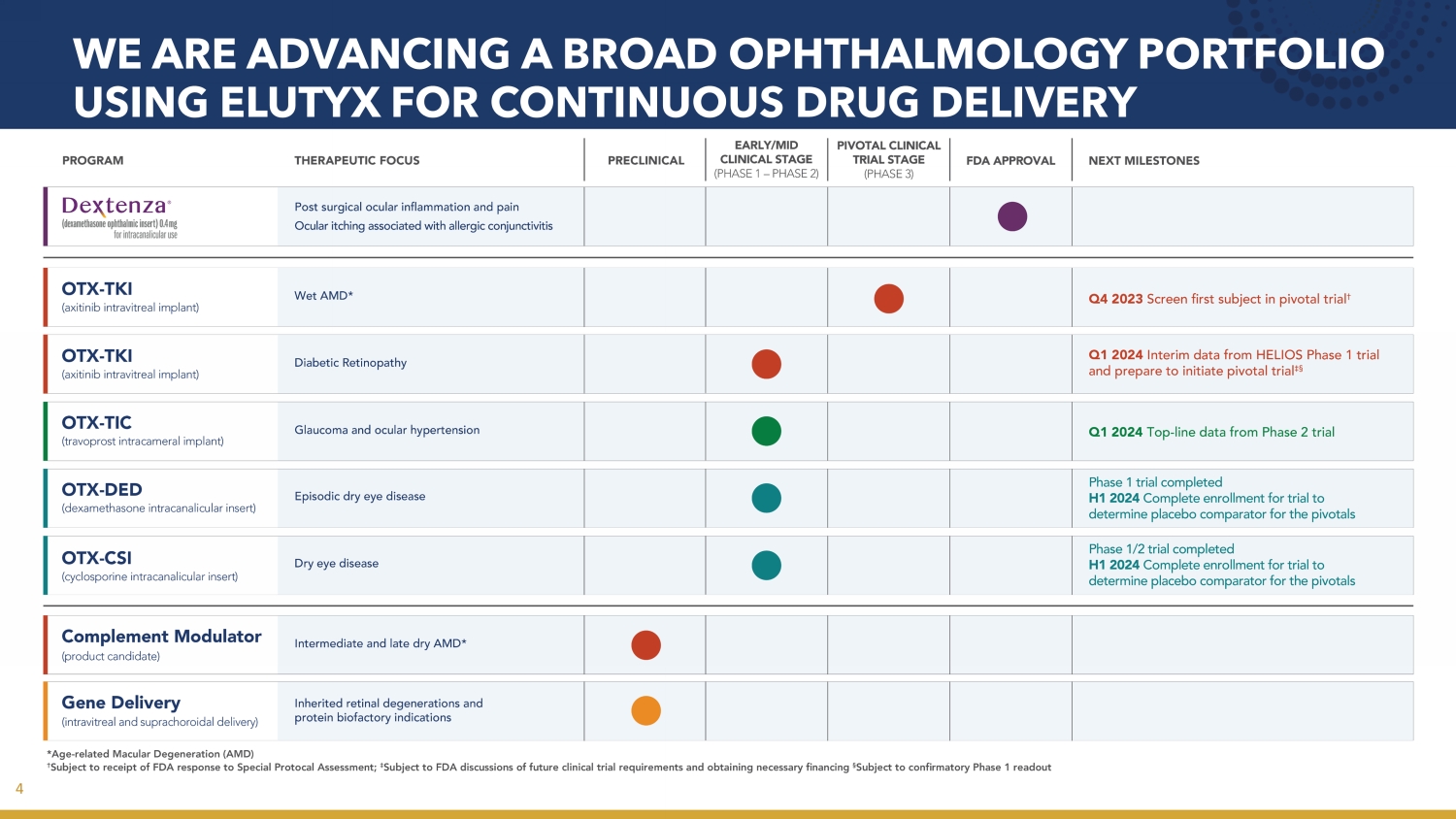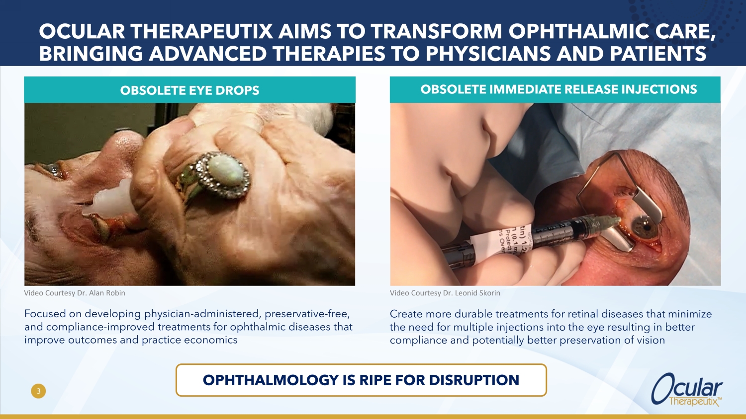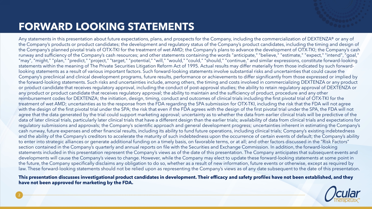 2 Any statements in this presentation about future expectations, plans, and prospects for the Company, including the commercial iza tion of DEXTENZA® or any of the Company’s products or product candidates; the development and regulatory status of the Company’s product candidates, incl udi ng the timing and design of the Company’s planned pivotal trials of OTX - TKI for the treatment of wet AMD; the Company’s plans to advance the development of OTX - TKI; the Company’s cash runway and sufficiency of the Company’s cash resources; and other statements containing the words "anticipate," "believe," "e sti mate," "expect," "intend", "goal," "may", "might," "plan," "predict," "project," "target," "potential," "will," "would," "could," "should," "continue," and simi lar expressions, constitute forward - looking statements within the meaning of The Private Securities Litigation Reform Act of 1995. Actual results may differ materially f rom those indicated by such forward - looking statements as a result of various important factors. Such forward - looking statements involve substantial risks and uncer tainties that could cause the Company’s preclinical and clinical development programs, future results, performance or achievements to differ significantly fro m those expressed or implied by the forward - looking statements. Such risks and uncertainties include, among others, the timing and costs involved in commerciali zing DEXTENZA or any product or product candidate that receives regulatory approval, including the conduct of post - approval studies; the ability to retain re gulatory approval of DEXTENZA or any product or product candidate that receives regulatory approval; the ability to maintain and the sufficiency of product, p roc edure and any other reimbursement codes for DEXTENZA; the initiation, design, timing, conduct and outcomes of clinical trials including the first pi votal trial of OTX - TKI for the treatment of wet AMD; uncertainties as to the response from the FDA regarding the SPA submission for OTX - TKI, including the risk that the FDA will not agree with the design of the first pivotal trial under the SPA; the risk that even if the FDA agrees with the design of the first p ivo tal trial under the SPA, the FDA will not agree that the data generated by the trial could support marketing approval; uncertainty as to whether the data from earlier cli nical trials will be predictive of the data of later clinical trials, particularly later clinical trials that have a different design than the earlier trials; avail abi lity of data from clinical trials and expectations for regulatory submissions and approvals; the Company’s scientific approach and general development progress; uncertainties inher ent in estimating the Company’s cash runway, future expenses and other financial results, including its ability to fund future operations, including clinical tr ials; Company’s existing indebtedness and the ability of the Company’s creditors to accelerate the maturity of such indebtedness upon the occurrence of certain eve nts of default; the Company’s ability to enter into strategic alliances or generate additional funding on a timely basis, on favorable terms, or at all; and other fac tors discussed in the “Risk Factors” section contained in the Company’s quarterly and annual reports on file with the Securities and Exchange Commission. In addit ion , the forward - looking statements included in this presentation represent the Company’s views as of the date of this presentation. The Company antic ipa tes that subsequent events and developments will cause the Company’s views to change. However, while the Company may elect to update these forward - looking stat ements at some point in the future, the Company specifically disclaims any obligation to do so, whether as a result of new information, future events or otherwise, except as required by law. These forward - looking statements should not be relied upon as representing the Company’s views as of any date subsequent to the date of this presentation. This presentation discusses investigational product candidates in development. Their efficacy and safety profiles have not be en established, and they have not been approved for marketing by the FDA. FORWARD LOOKING STATEMENTS