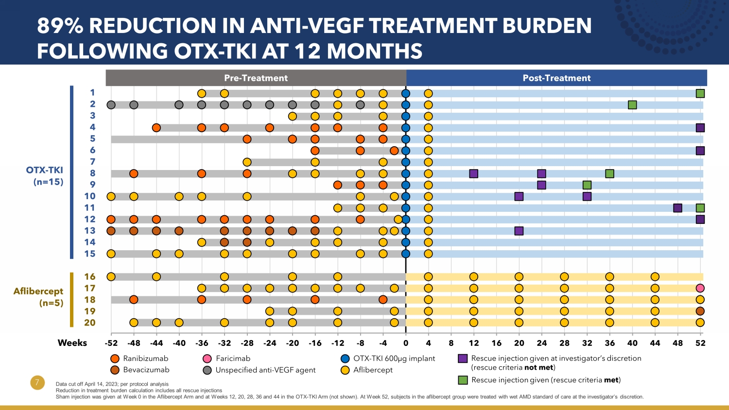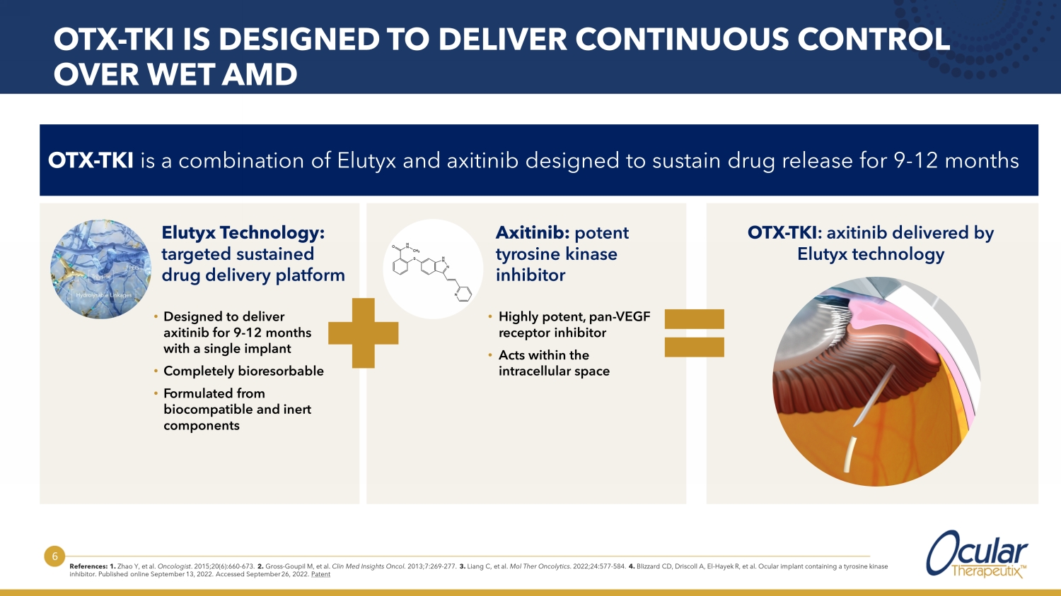 6 OTX - TKI IS DESIGNED TO DELIVER CONTINUOUS CONTROL OVER WET AMD References: 1. Zhao Y, et al. Oncologist . 2015;20(6):660 - 673. 2. Gross - Goupil M, et al. Clin Med Insights Oncol. 2013;7:269 - 277. 3. Liang C, et al. Mol Ther Oncolytics . 2022;24:577 - 584. 4. Blizzard CD, Driscoll A, El - Hayek R, et al. Ocular implant containing a tyrosine kinase inhibitor. Published online September 13, 2022. Accessed September 26, 2022. Patent Elutyx Technology: targeted sustained drug delivery platform OTX - TKI : axitinib delivered by Elutyx technology Axitinib: potent tyrosine kinase inhibitor • H ighly potent, pan - VEGF receptor inhibitor • Acts within the intracellular space OTX - TKI is a combination of Elutyx and axitinib designed to sustain drug release for 9 - 12 months • Designed to deliver axitinib for 9 - 12 months with a single implant • C ompletely bioresorbable • Formulated from biocompatible and inert components