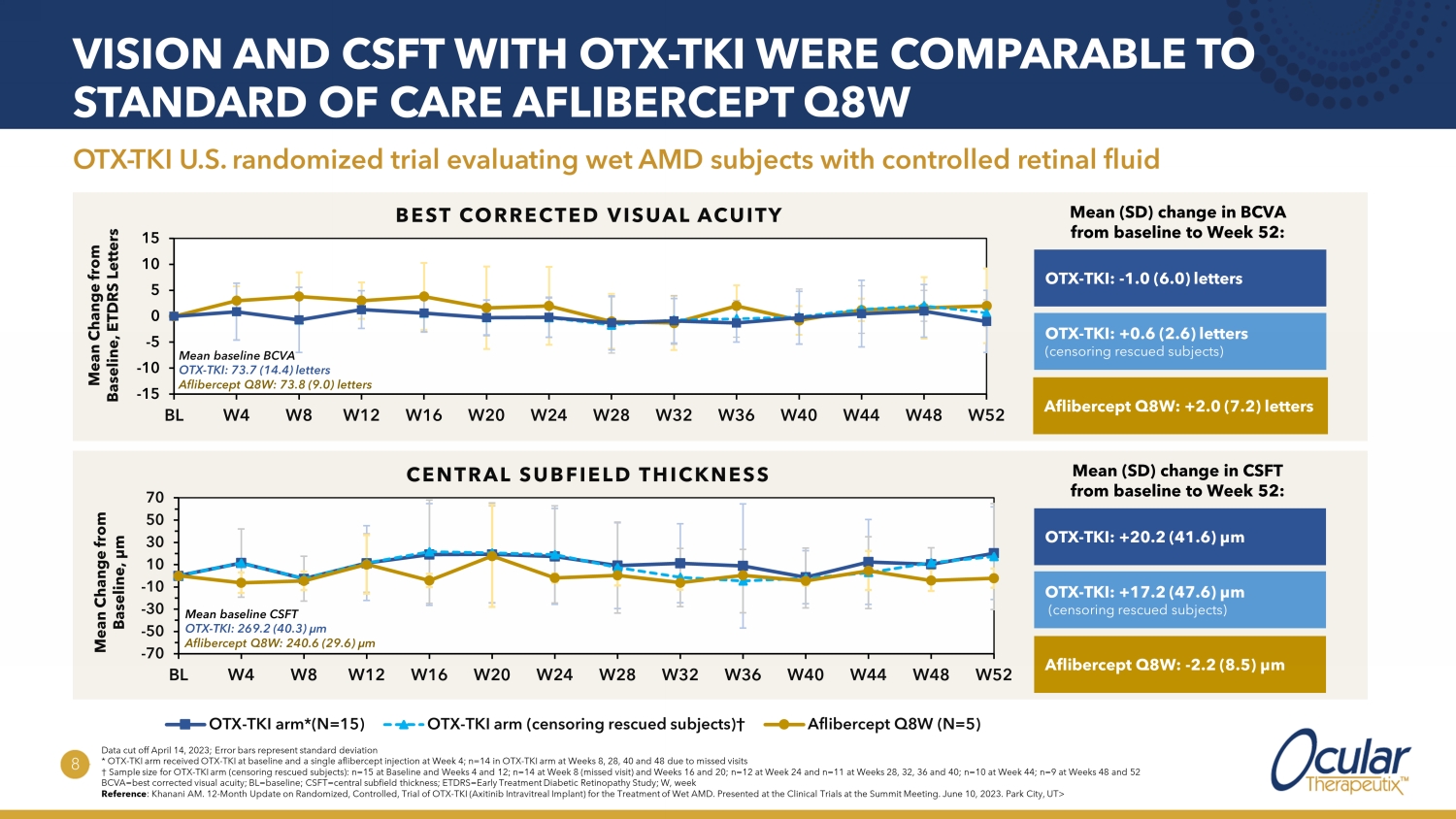 Data cut off April 14, 2023; per protocol analysis Reduction in treatment burden calculation includes all rescue injections Sham injection was given at Week 0 in the Aflibercept Arm and at Weeks 12, 20, 28, 36 and 44 in the OTX - TKI Arm (not shown). At Week 52, subjects in the aflibercept group were treated with wet AMD standard of care at the investigator’s discretion. 7 89% REDUCTION IN ANTI - VEGF TREATMENT BURDEN FOLLOWING OTX - TKI AT 12 MONTHS -52 -48 -44 -40 -36 -32 -28 -24 -20 -16 -12 -8 -4 0 4 8 12 16 20 24 28 32 36 40 44 48 52 Weeks OTX - TKI (n=15) Aflibercept (n=5) 1 2 3 4 5 6 7 8 9 10 11 12 13 14 15 16 17 18 19 20 Ranibizumab Faricimab OTX - TKI 600µg implant Unspecified anti - VEGF agent Bevacizumab Rescue injection given at investigator’s discretion (rescue criteria not met ) Post - Treatment Pre - Treatment Rescue injection given (rescue criteria met ) Aflibercept