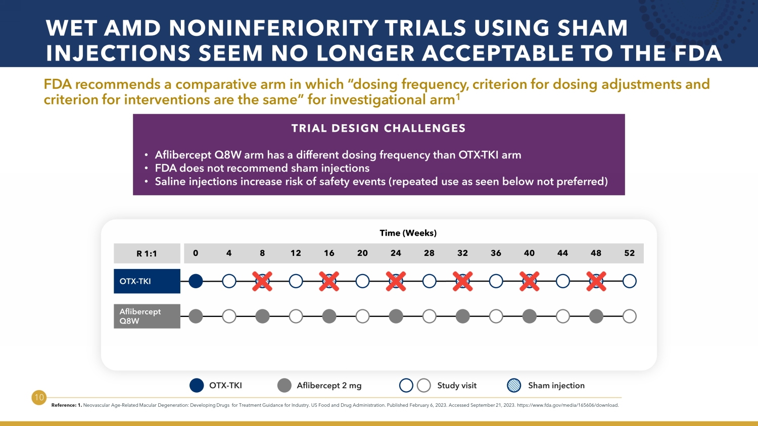 9 WET AMD NONINFERIORITY TRIALS USING SHAM INJECTIONS SEEM NO LONGER ACCEPTABLE TO THE FDA FDA recommends a comparative arm in which “dosing frequency, criterion for dosing adjustments and criterion for interventions are the same” for investigational arm 1 0 4 8 12 16 20 24 28 32 36 40 44 48 52 Time (Weeks) OTX - TKI Aflibercept Q8W R 1:1 OTX - TKI Aflibercept 2 mg Study visit Sham injection Reference: 1. Neovascular Age - Related Macular Degeneration: Developing Drugs for Treatment Guidance for Industry. US Food and Drug Administr ation. Published February 6, 2023. Accessed September 21, 2023. https://www.fda.gov/media/165606/download. TRIAL DESIGN CHALLENGES • Aflibercept Q8W arm has a different dosing frequency than OTX - TKI arm • FDA does not recommend sham injections • Saline injections increase risk of safety events (repeated use as seen below not preferred)