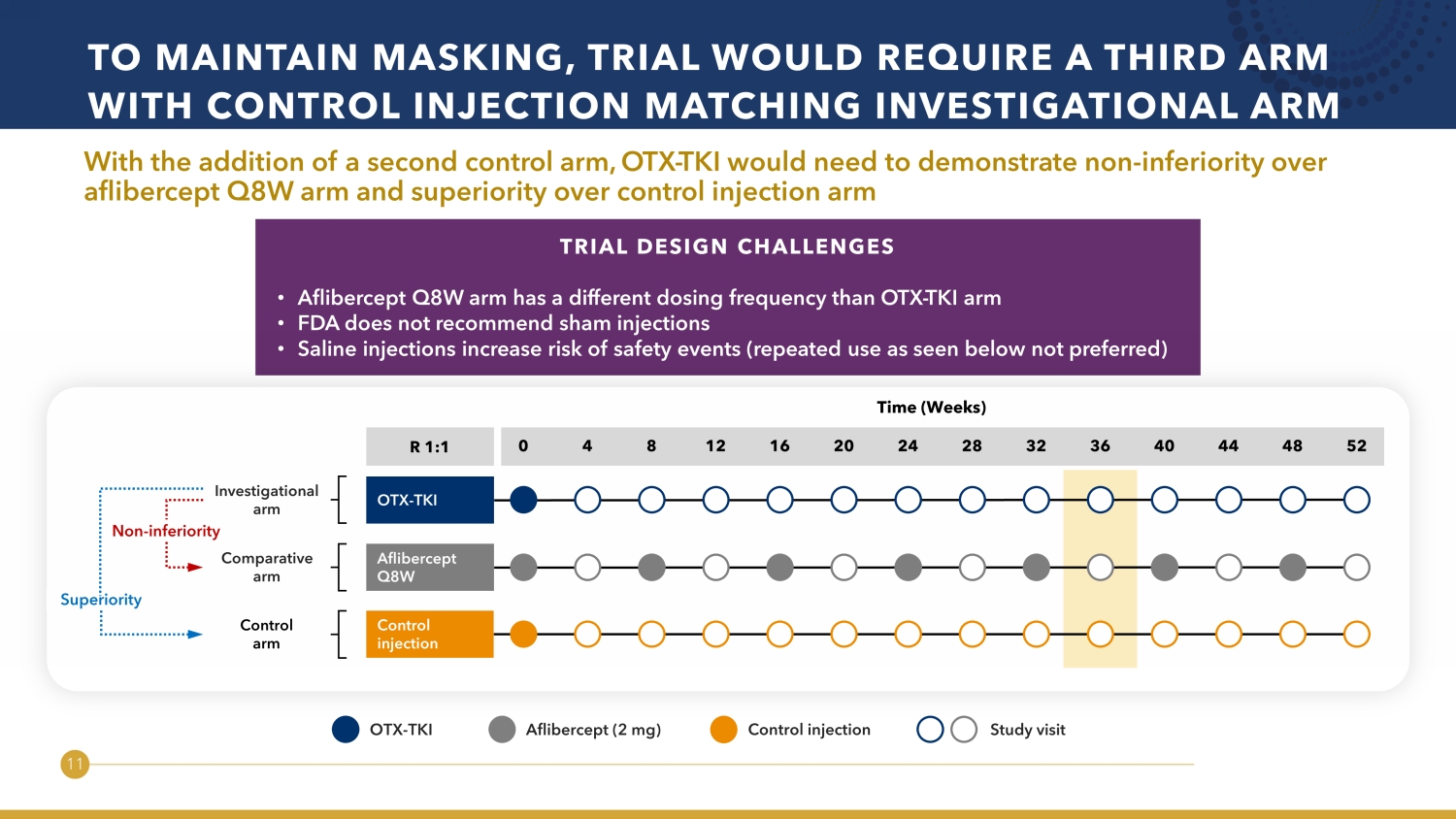 0 4 8 12 16 20 24 28 32 36 40 44 48 52 Time (Weeks) OTX - TKI Aflibercept Q8W R 1:1 OTX - TKI Aflibercept 2 mg Study visit Sham injection 10 Reference: 1. Neovascular Age - Related Macular Degeneration: Developing Drugs for Treatment Guidance for Industry. US Food and Drug Administr ation. Published February 6, 2023. Accessed September 21, 2023. https://www.fda.gov/media/165606/download. WET AMD NONINFERIORITY TRIALS USING SHAM INJECTIONS SEEM NO LONGER ACCEPTABLE TO THE FDA TRIAL DESIGN CHALLENGES • Aflibercept Q8W arm has a different dosing frequency than OTX - TKI arm • FDA does not recommend sham injections • Saline injections increase risk of safety events (repeated use as seen below not preferred) FDA recommends a comparative arm in which “dosing frequency, criterion for dosing adjustments and criterion for interventions are the same” for investigational arm 1