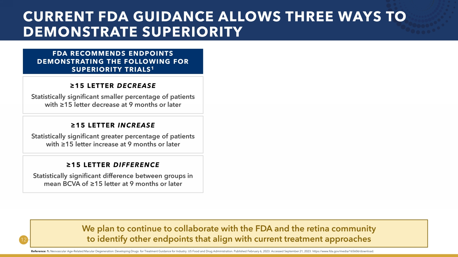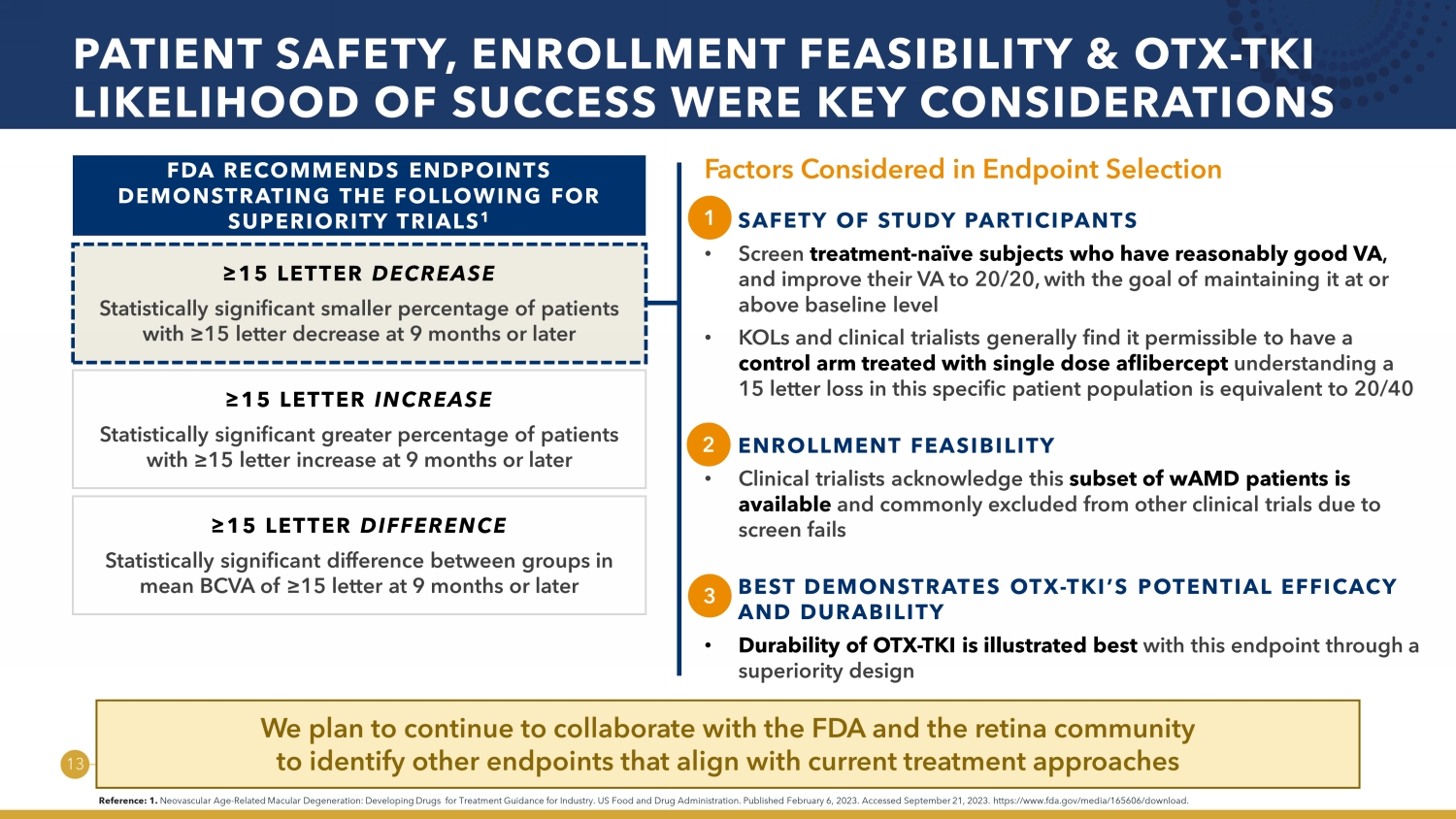12 CURRENT FDA GUIDANCE ALLOWS THREE WAYS TO DEMONSTRATE SUPERIORITY ≥15 LETTER DECREASE Statistically significant smaller percentage of patients with ≥15 letter decrease at 9 months or later ≥15 LETTER INCREASE Statistically significant greater percentage of patients with ≥15 letter increase at 9 months or later ≥15 LETTER DIFFERENCE Statistically significant difference between groups in mean BCVA of ≥15 letter at 9 months or later FDA RECOMMENDS ENDPOINTS DEMONSTRATING THE FOLLOWING FOR SUPERIORITY TRIALS 1 Reference: 1. Neovascular Age - Related Macular Degeneration: Developing Drugs for Treatment Guidance for Industry. US Food and Drug Administr ation. Published February 6, 2023. Accessed September 21, 2023. https://www.fda.gov/media/165606/download. We plan to continue to collaborate with the FDA and the retina community to identify other endpoints that align with current treatment approaches
