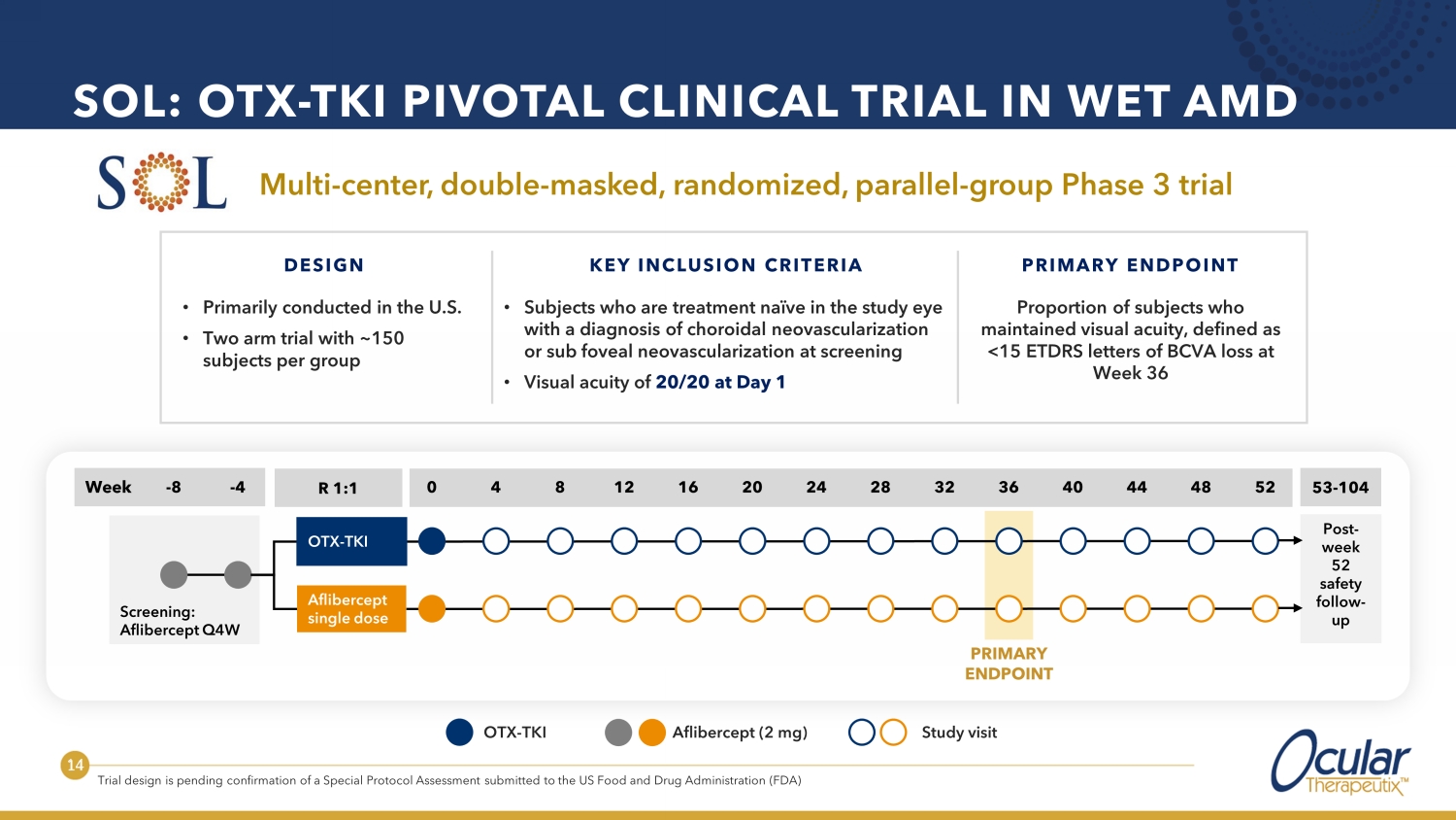 13 PATIENT SAFETY, ENROLLMENT FEASIBILITY & OTX - TKI LIKELIHOOD OF SUCCESS WERE KEY CONSIDERATIONS Factors Considered in Endpoint Selection SAFETY OF STUDY PARTICIPANTS • Screen treatment - naïve subjects who have reasonably good VA , and improve their VA to 20/20, with the goal of maintaining it at or above baseline level • KOLs and clinical trialists generally find it permissible to have a control arm treated with single dose aflibercept understanding a 15 letter loss in this specific patient population is equivalent to 20/40 ENROLLMENT FEASIBILITY • Clinical trialists acknowledge this subset of wAMD patients is available and commonly excluded from other clinical trials due to screen fails BEST DEMONSTRATES OTX - TKI’S POTENTIAL EFFICACY AND DURABILITY • Durability of OTX - TKI is illustrated best with this endpoint through a superiority design 1 2 3 ≥15 LETTER DECREASE Statistically significant smaller percentage of patients with ≥15 letter decrease at 9 months or later ≥15 LETTER INCREASE Statistically significant greater percentage of patients with ≥15 letter increase at 9 months or later ≥15 LETTER DIFFERENCE Statistically significant difference between groups in mean BCVA of ≥15 letter at 9 months or later Reference: 1. Neovascular Age - Related Macular Degeneration: Developing Drugs for Treatment Guidance for Industry. US Food and Drug Administr ation. Published February 6, 2023. Accessed September 21, 2023. https://www.fda.gov/media/165606/download. FDA RECOMMENDS ENDPOINTS DEMONSTRATING THE FOLLOWING FOR SUPERIORITY TRIALS 1 We plan to continue to collaborate with the FDA and the retina community to identify other endpoints that align with current treatment approaches