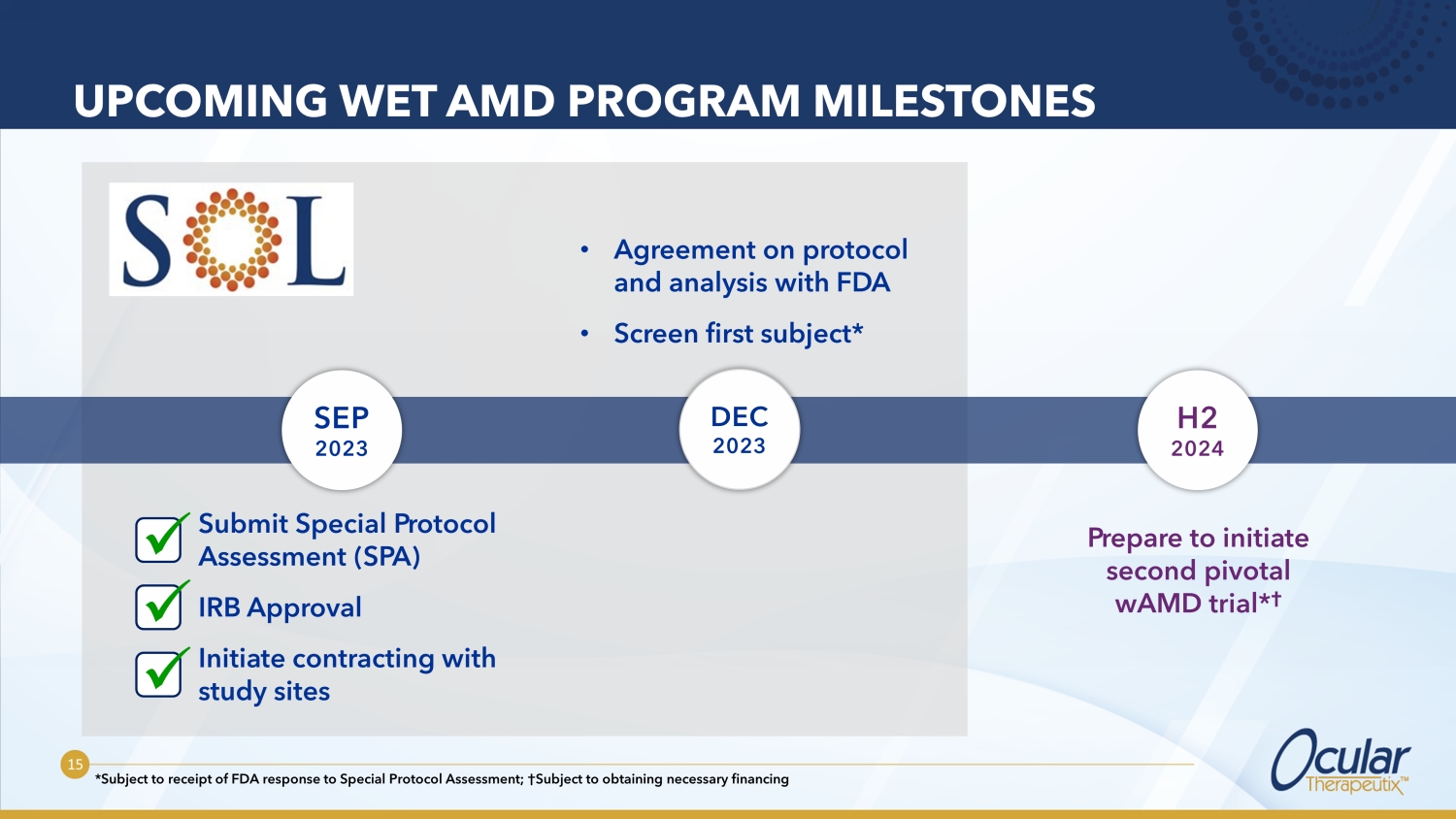 14 SOL: OTX - TKI PIVOTAL CLINICAL TRIAL IN WET AMD Multi - center, double - masked, randomized, parallel - group Phase 3 trial KEY INCLUSION CRITERIA • Subjects who are treatment naïve in the study eye with a diagnosis of choroidal neovascularization or sub foveal neovascularization at screening • Visual acuity of 20/20 at Day 1 PRIMARY ENDPOINT Proportion of subjects who maintained visual acuity, defined as <15 ETDRS letters of BCVA loss at Week 36 DESIGN • Primarily conducted in the U.S. • Two arm trial with ~150 subjects per group Post - week 52 safety follow - up Screening: Aflibercept Q4W 0 4 8 12 16 20 24 28 32 36 40 44 48 52 - 4 - 8 Week OTX - TKI Aflibercept single dose R 1:1 PRIMARY ENDPOINT 53 - 104 OTX - TKI Aflibercept (2 mg) Study visit Trial design is pending confirmation of a Special Protocol Assessment submitted to the US Food and Drug Administration (FDA) 14