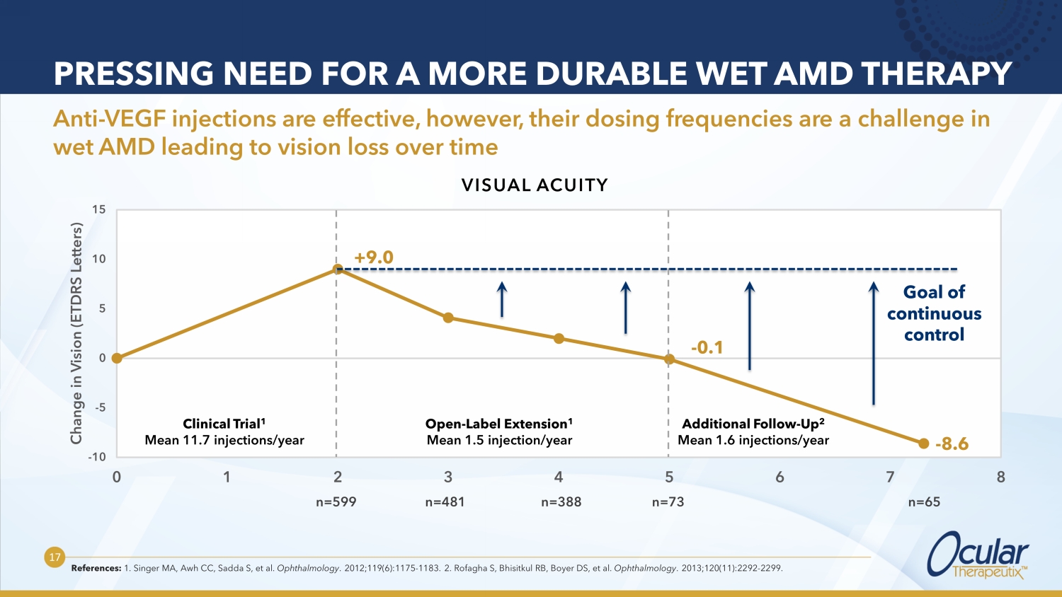 + 9.0 - 0.1 - 8.6 -10 -5 0 5 10 15 0 1 2 3 4 5 6 7 8 Change in Vision (ETDRS Letters) VISUAL ACUITY PRESSING NEED FOR A MORE DURABLE WET AMD THERAPY Anti - VEGF injections are effective, however, their dosing frequencies are a challenge in wet AMD leading to vision loss over time 16 n=599 n=388 n=65 n=73 n=481 References: 1. Singer MA, Awh CC, Sadda S, et al. Ophthalmology . 2012;119(6):1175 - 1183. 2. Rofagha S, Bhisitkul RB, Boyer DS, et al. Ophthalmology . 2013;120(11):2292 - 2299. Clinical Trial 1 Mean 11.7 injections/year Open - Label Extension 1 Mean 1.5 injection/year Additional Follow - Up 2 Mean 1.6 injections/year