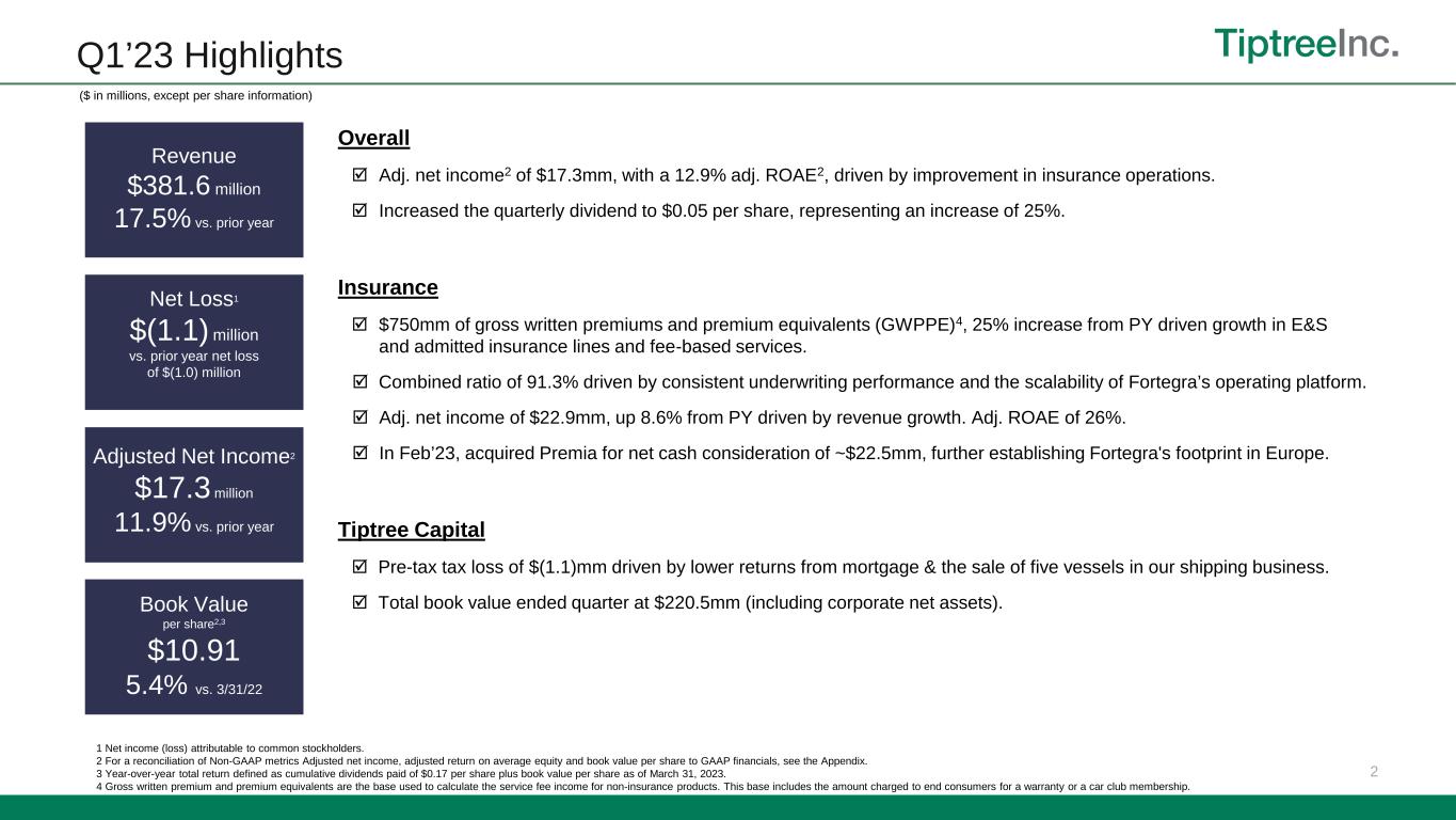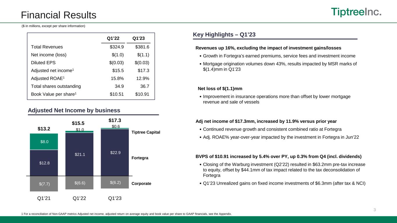 2 Q1’23 Highlights Revenue $381.6 million 17.5% vs. prior year Adjusted Net Income2 $17.3 million 11.9% vs. prior year Book Value per share2,3 $10.91 5.4% vs. 3/31/22 Net Loss1 $(1.1) million vs. prior year net loss of $(1.0) million Overall  Adj. net income2 of $17.3mm, with a 12.9% adj. ROAE2, driven by improvement in insurance operations.  Increased the quarterly dividend to $0.05 per share, representing an increase of 25%. Insurance  $750mm of gross written premiums and premium equivalents (GWPPE)4, 25% increase from PY driven growth in E&S and admitted insurance lines and fee-based services.  Combined ratio of 91.3% driven by consistent underwriting performance and the scalability of Fortegra’s operating platform.  Adj. net income of $22.9mm, up 8.6% from PY driven by revenue growth. Adj. ROAE of 26%.  In Feb’23, acquired Premia for net cash consideration of ~$22.5mm, further establishing Fortegra's footprint in Europe. Tiptree Capital  Pre-tax tax loss of $(1.1)mm driven by lower returns from mortgage & the sale of five vessels in our shipping business.  Total book value ended quarter at $220.5mm (including corporate net assets). ($ in millions, except per share information) 1 Net income (loss) attributable to common stockholders. 2 For a reconciliation of Non-GAAP metrics Adjusted net income, adjusted return on average equity and book value per share to GAAP financials, see the Appendix. 3 Year-over-year total return defined as cumulative dividends paid of $0.17 per share plus book value per share as of March 31, 2023. 4 Gross written premium and premium equivalents are the base used to calculate the service fee income for non-insurance products. This base includes the amount charged to end consumers for a warranty or a car club membership.