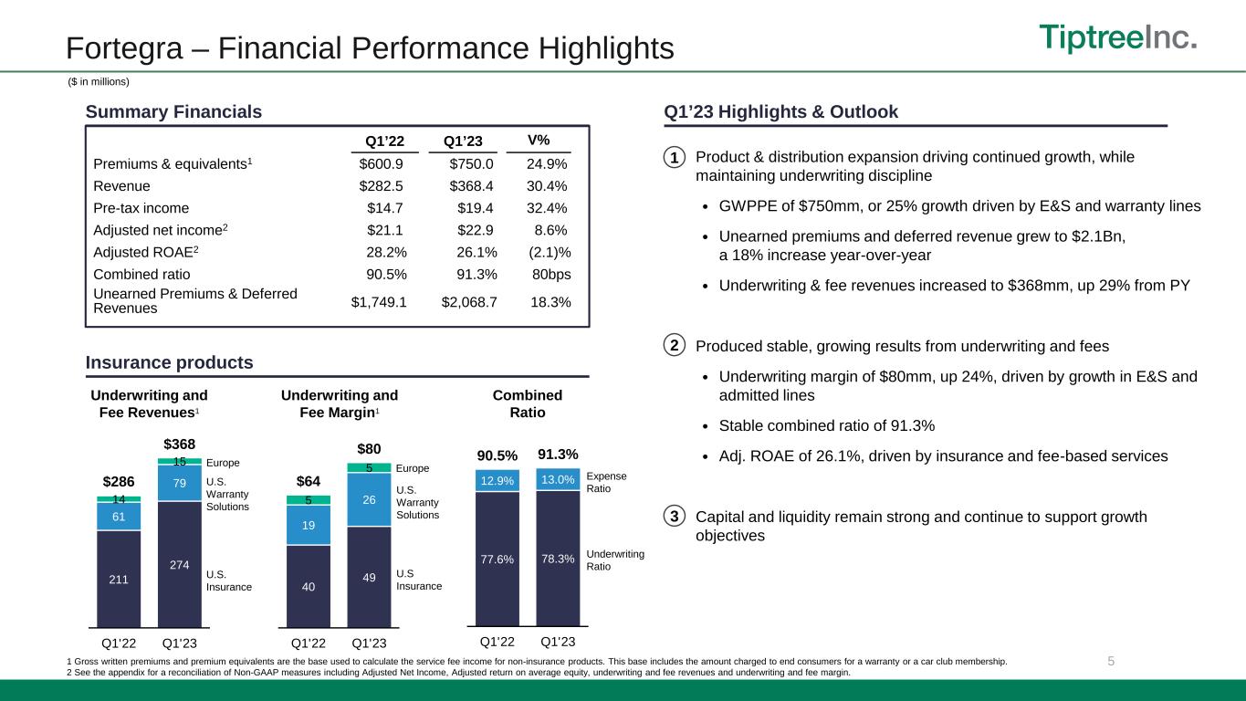 Financial Results Q1’22 Q1'23 Total Revenues $324.9 $381.6 Net income (loss) $(1.0) $(1.1) Diluted EPS $(0.03) $(0.03) Adjusted net income1 $15.5 $17.3 Adjusted ROAE1 15.8% 12.9% Total shares outstanding 34.9 36.7 Book Value per share1 $10.51 $10.91 3 1 For a reconciliation of Non-GAAP metrics Adjusted net income, adjusted return on average equity and book value per share to GAAP financials, see the Appendix. ($ in millions, except per share information) $12.8 $21.1 $22.9 $8.0 $1.0 $0.6 $(7.7) $(6.6) $(6.2) $13.2 $15.5 $17.3 Q1'21 Q1'22 Q1'23 Corporate Fortegra Tiptree Capital Key Highlights – Q1’23 Adjusted Net Income by business Revenues up 16%, excluding the impact of investment gains/losses • Growth in Fortegra’s earned premiums, service fees and investment income • Mortgage origination volumes down 43%, results impacted by MSR marks of $(1.4)mm in Q1’23 •Net loss of $(1.1)mm • Improvement in insurance operations more than offset by lower mortgage revenue and sale of vessels Adj net income of $17.3mm, increased by 11.9% versus prior year • Continued revenue growth and consistent combined ratio at Fortegra • Adj. ROAE% year-over-year impacted by the investment in Fortegra in Jun’22 BVPS of $10.91 increased by 5.4% over PY, up 0.3% from Q4 (incl. dividends) • Closing of the Warburg investment (Q2’22) resulted in $63.2mm pre-tax increase to equity, offset by $44.1mm of tax impact related to the tax deconsolidation of Fortegra • Q1’23 Unrealized gains on fixed income investments of $6.3mm (after tax & NCI)