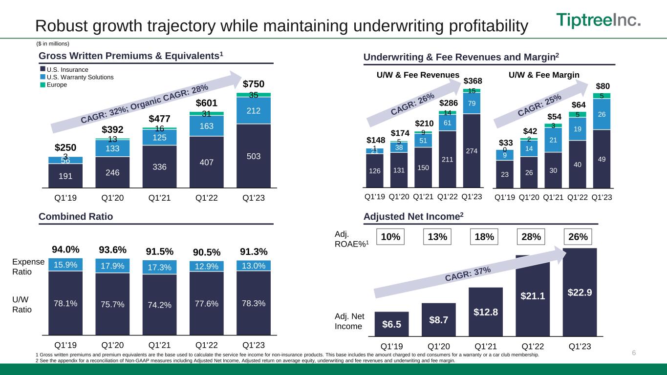 5 Fortegra – Financial Performance Highlights Product & distribution expansion driving continued growth, while maintaining underwriting discipline • GWPPE of $750mm, or 25% growth driven by E&S and warranty lines • Unearned premiums and deferred revenue grew to $2.1Bn, a 18% increase year-over-year • Underwriting & fee revenues increased to $368mm, up 29% from PY Produced stable, growing results from underwriting and fees • Underwriting margin of $80mm, up 24%, driven by growth in E&S and admitted lines • Stable combined ratio of 91.3% • Adj. ROAE of 26.1%, driven by insurance and fee-based services Capital and liquidity remain strong and continue to support growth objectives Underwriting and Fee Margin1 Underwriting and Fee Revenues1 Combined Ratio 1 2 3 Summary Financials Insurance products Q1’23 Highlights & Outlook 40 49 19 265 5 $64 $80 Q1'22 Q1'23 211 274 61 79 14 15 $286 $368 Q1'22 Q1'23 77.6% 78.3% 12.9% 13.0% 90.5% 91.3% Q1'22 Q1'23 ($ in millions) U.S. Warranty Solutions U.S Insurance Europe Expense Ratio Underwriting Ratio Europe U.S. Warranty Solutions U.S. Insurance 1 Gross written premiums and premium equivalents are the base used to calculate the service fee income for non-insurance products. This base includes the amount charged to end consumers for a warranty or a car club membership. 2 See the appendix for a reconciliation of Non-GAAP measures including Adjusted Net Income, Adjusted return on average equity, underwriting and fee revenues and underwriting and fee margin. Q1’22 Q1’23 V% Premiums & equivalents1 $600.9 $750.0 24.9% Revenue $282.5 $368.4 30.4% Pre-tax income $14.7 $19.4 32.4% Adjusted net income2 $21.1 $22.9 8.6% Adjusted ROAE2 28.2% 26.1% (2.1)% Combined ratio 90.5% 91.3% 80bps Unearned Premiums & Deferred Revenues $1,749.1 $2,068.7 18.3%