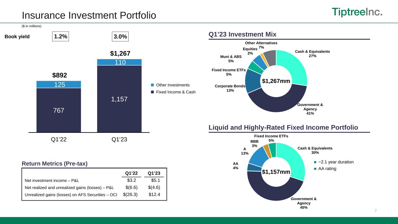 Robust growth trajectory while maintaining underwriting profitability 78.1% 75.7% 74.2% 77.6% 78.3% 15.9% 17.9% 17.3% 12.9% 13.0% 94.0% 93.6% 91.5% 90.5% 91.3% Q1'19 Q1'20 Q1'21 Q1'22 Q1'23 $6.5 $8.7 $12.8 $21.1 $22.9 Q1'19 Q1'20 Q1'21 Q1'22 Q1'23 6 ($ in millions) Gross Written Premiums & Equivalents1 Underwriting & Fee Revenues and Margin2 Adjusted Net Income2 191 246 336 407 503 56 133 125 163 212 3 13 16 31 35 $250 $392 $477 $601 $750 Q1'19 Q1'20 Q1'21 Q1'22 Q1'23 Combined Ratio Adj. ROAE%1 Adj. Net Income U/W Ratio Expense Ratio U.S. Insurance U.S. Warranty Solutions Europe 1 Gross written premiums and premium equivalents are the base used to calculate the service fee income for non-insurance products. This base includes the amount charged to end consumers for a warranty or a car club membership. 2 See the appendix for a reconciliation of Non-GAAP measures including Adjusted Net Income, Adjusted return on average equity, underwriting and fee revenues and underwriting and fee margin. 10% 18% U/W & Fee Revenues U/W & Fee Margin 26%13% 23 26 30 40 49 9 14 21 19 26 0 2 3 5 5 $33 $42 $54 $64 $80 Q1'19 Q1'20 Q1'21 Q1'22 Q1'23 28% 126 131 150 211 27421 38 51 61 79 1 5 9 14 15 $148 $174 $210 $286 $368 Q1'19 Q1'20 Q1'21 Q1'22 Q1'23