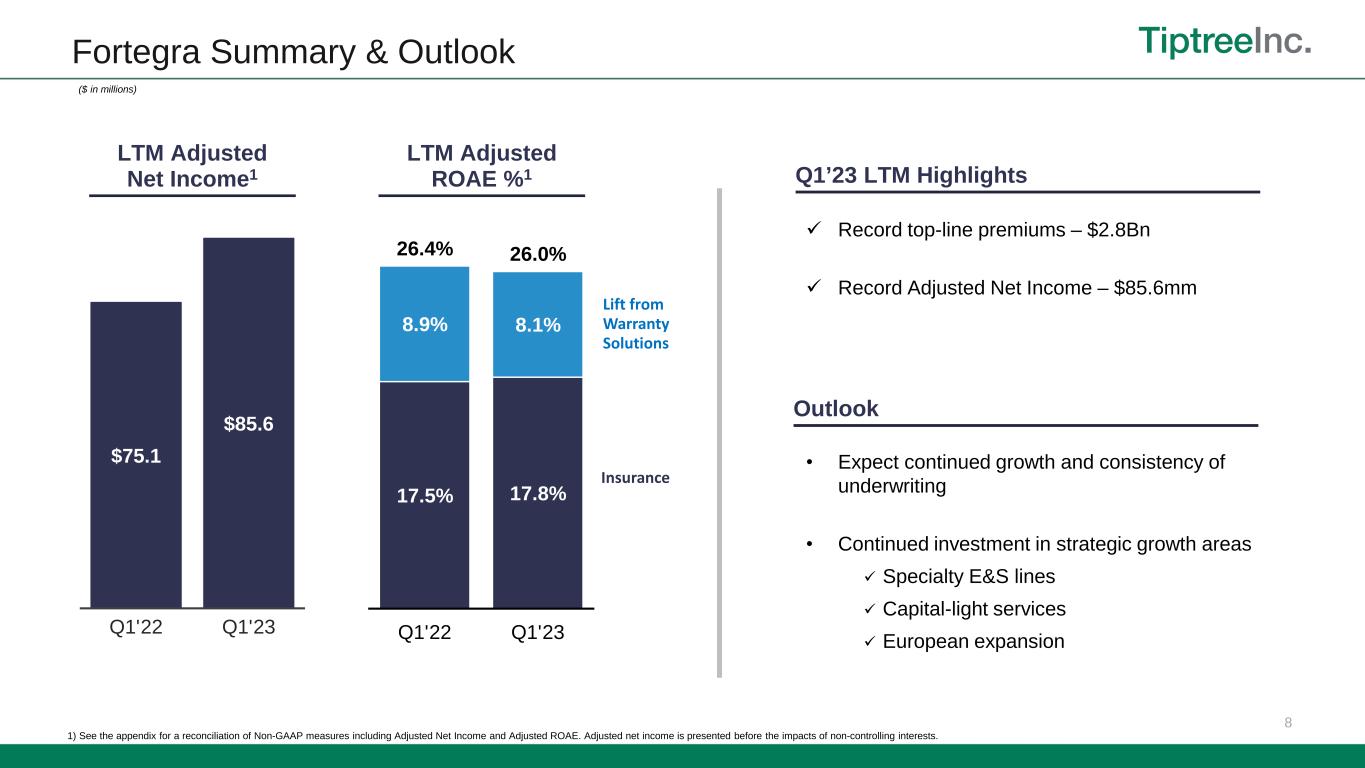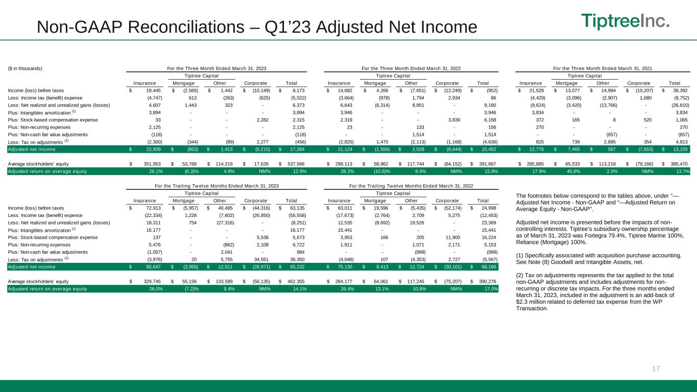 17 Non-GAAP Reconciliations – Q1’23 Adjusted Net Income The footnotes below correspond to the tables above, under “— Adjusted Net Income - Non-GAAP and “—Adjusted Return on Average Equity - Non-GAAP”. Adjusted net income is presented before the impacts of non- controlling interests. Tiptree’s subsidiary ownership percentage as of March 31, 2023 was Fortegra 79.4%, Tiptree Marine 100%, Reliance (Mortgage) 100%. (1) Specifically associated with acquisition purchase accounting. See Note (8) Goodwill and Intangible Assets, net. (2) Tax on adjustments represents the tax applied to the total non-GAAP adjustments and includes adjustments for non- recurring or discrete tax impacts. For the three months ended March 31, 2023, included in the adjustment is an add-back of $2.3 million related to deferred tax expense from the WP Transaction. ($ in thousands) Insurance Mortgage Other Corporate Total Insurance Mortgage Other Corporate Total Insurance Mortgage Other Corporate Total Income (loss) before taxes 19,445$ (2,565)$ 1,442$ (10,149)$ 8,173$ 14,682$ 4,266$ (7,651)$ (12,249)$ (952)$ 21,528$ 13,077$ 14,994$ (10,207)$ 39,392$ Less: Income tax (benefit) expense (4,747) 613 (263) (625) (5,022) (3,664) (978) 1,794 2,934 86 (4,429) (3,096) (2,907) 1,680 (8,752) Less: Net realized and unrealized gains (losses) 4,607 1,443 323 - 6,373 6,643 (6,314) 8,851 - 9,180 (9,624) (3,420) (13,766) - (26,810) Plus: Intangibles amortization (1) 3,894 - - - 3,894 3,946 - - - 3,946 3,834 - - - 3,834 Plus: Stock-based compensation expense 33 - - 2,282 2,315 2,319 - - 3,839 6,158 372 165 8 520 1,065 Plus: Non-recurring expenses 2,125 - - - 2,125 23 - 133 - 156 270 - - - 270 Plus: Non-cash fair value adjustments (118) - - - (118) - - 1,514 - 1,514 - - (657) - (657) Less: Tax on adjustments (2) (2,300) (344) (89) 2,277 (456) (2,825) 1,470 (2,113) (1,168) (4,636) 825 739 2,895 354 4,813 Adjusted net income 22,939$ (853)$ 1,413$ (6,215)$ 17,284$ 21,124$ (1,556)$ 2,528$ (6,644)$ 15,452$ 12,776$ 7,465$ 567$ (7,653)$ 13,155$ Average stockholders’ equity 351,953$ 53,768$ 114,219$ 17,626$ 537,566$ 299,113$ 58,962$ 117,744$ (84,152)$ 391,667$ 285,885$ 65,533$ 113,218$ (79,166)$ 385,470$ Adjusted return on average equity 26.1% (6.3)% 4.9% NM% 12.9% 28.2% (10.6)% 8.6% NM% 15.8% 17.9% 45.6% 2.0% NM% 13.7% Insurance Mortgage Other Corporate Total Insurance Mortgage Other Corporate Total Income (loss) before taxes 72,913$ (5,957)$ 40,495$ (44,316)$ 63,135$ 63,011$ 19,596$ (5,435)$ (52,174)$ 24,998$ Less: Income tax (benefit) expense (22,334) 1,228 (7,602) (26,850) (55,558) (17,673) (2,764) 2,709 5,275 (12,453) Less: Net realized and unrealized gains (losses) 18,311 754 (27,316) - (8,251) 12,535 (8,692) 19,526 - 23,369 Plus: Intangibles amortization (1) 16,177 - - - 16,177 15,441 - - - 15,441 Plus: Stock-based compensation expense 137 - - 5,536 5,673 3,953 166 205 11,900 16,224 Plus: Non-recurring expenses 5,476 - (862) 2,108 6,722 1,911 - 1,071 2,171 5,153 Plus: Non-cash fair value adjustments (1,057) - 2,041 - 984 - - (999) - (999) Less: Tax on adjustments (2) (3,976) 20 5,755 34,551 36,350 (4,048) 107 (4,353) 2,727 (5,567) Adjusted net income 85,647$ (3,955)$ 12,511$ (28,971)$ 65,232$ 75,130$ 8,413$ 12,724$ (30,101)$ 66,166$ Average stockholders’ equity 329,745$ 55,156$ 133,589$ (56,135)$ 462,355$ 284,177$ 64,061$ 117,245$ (75,207)$ 390,276$ Adjusted return on average equity 26.0% (7.2)% 9.4% NM% 14.1% 26.4% 13.1% 10.9% NM% 17.0% For the Three Month Ended March 31, 2022 For the Three Month Ended March 31, 2021 Tiptree CapitalTiptree Capital For the Three Month Ended March 31, 2023 Tiptree Capital For the Trailing Twelve Months Ended March 31, 2023 For the Trailing Twelve Months Ended March 31, 2022 Tiptree Capital Tiptree Capital