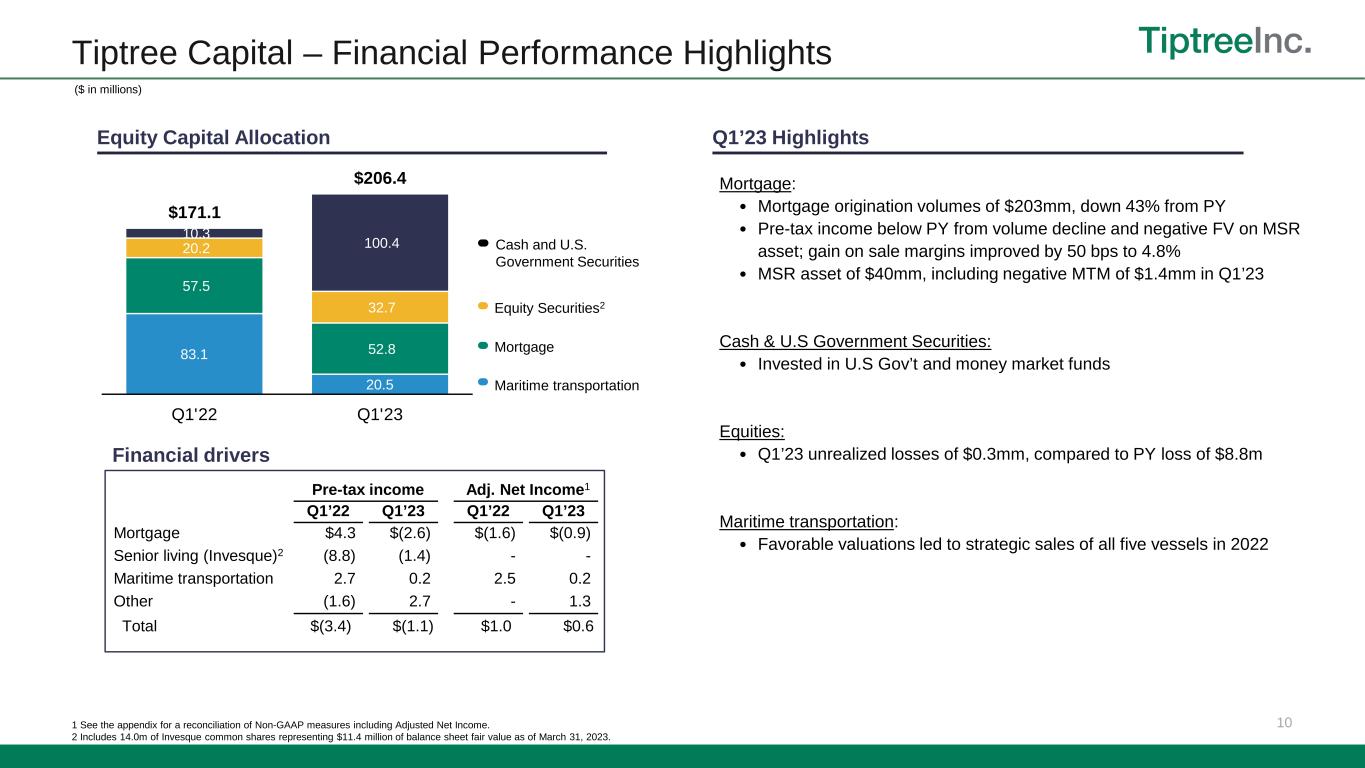 83.1 20.5 57.5 52.8 20.2 32.7 10.3 100.4 $171.1 $206.4 Q1'22 Q1'23 Financial drivers Pre-tax income Adj. Net Income1 Q1’22 Q1’23 Q1’22 Q1’23 Mortgage $4.3 $(2.6) $(1.6) $(0.9) Senior living (Invesque)2 (8.8) (1.4) - - Maritime transportation 2.7 0.2 2.5 0.2 Other (1.6) 2.7 - 1.3 Total $(3.4) $(1.1) $1.0 $0.6 10 Tiptree Capital – Financial Performance Highlights Mortgage: • Mortgage origination volumes of $203mm, down 43% from PY • Pre-tax income below PY from volume decline and negative FV on MSR asset; gain on sale margins improved by 50 bps to 4.8% • MSR asset of $40mm, including negative MTM of $1.4mm in Q1’23 Cash & U.S Government Securities: • Invested in U.S Gov’t and money market funds Equities: • Q1’23 unrealized losses of $0.3mm, compared to PY loss of $8.8m Maritime transportation: • Favorable valuations led to strategic sales of all five vessels in 2022 Mortgage Maritime transportation Equity Securities2 1 See the appendix for a reconciliation of Non-GAAP measures including Adjusted Net Income. 2 Includes 14.0m of Invesque common shares representing $11.4 million of balance sheet fair value as of March 31, 2023. Equity Capital Allocation Q1’23 Highlights ($ in millions) Cash and U.S. Government Securities