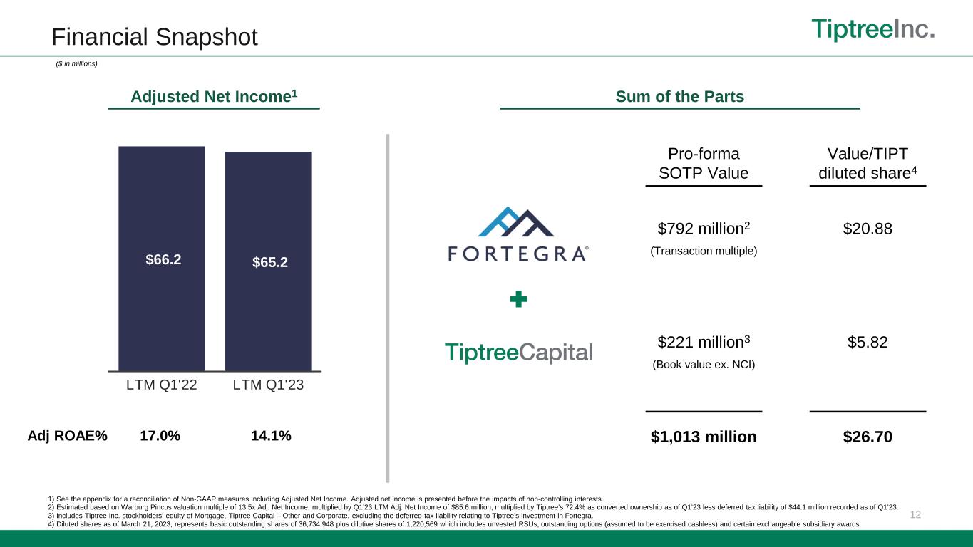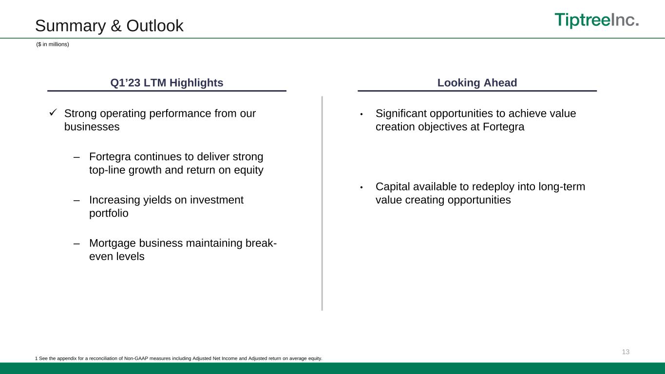 Financial Snapshot 12 ($ in millions) Adjusted Net Income1 1) See the appendix for a reconciliation of Non-GAAP measures including Adjusted Net Income. Adjusted net income is presented before the impacts of non-controlling interests. 2) Estimated based on Warburg Pincus valuation multiple of 13.5x Adj. Net Income, multiplied by Q1’23 LTM Adj. Net Income of $85.6 million, multiplied by Tiptree’s 72.4% as converted ownership as of Q1’23 less deferred tax liability of $44.1 million recorded as of Q1’23. 3) Includes Tiptree Inc. stockholders’ equity of Mortgage, Tiptree Capital – Other and Corporate, excluding the deferred tax liability relating to Tiptree’s investment in Fortegra. 4) Diluted shares as of March 21, 2023, represents basic outstanding shares of 36,734,948 plus dilutive shares of 1,220,569 which includes unvested RSUs, outstanding options (assumed to be exercised cashless) and certain exchangeable subsidiary awards. Adj ROAE% 17.0% 14.1% Sum of the Parts $66.2 $65.2 LTM Q1'22 LTM Q1'23 $792 million2 (Transaction multiple) $221 million3 (Book value ex. NCI) $1,013 million $20.88 Value/TIPT diluted share4 Pro-forma SOTP Value $5.82 $26.70