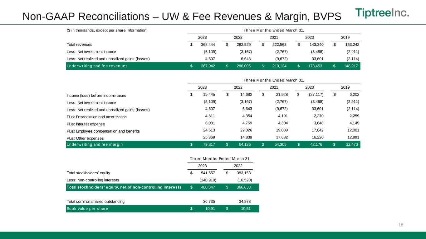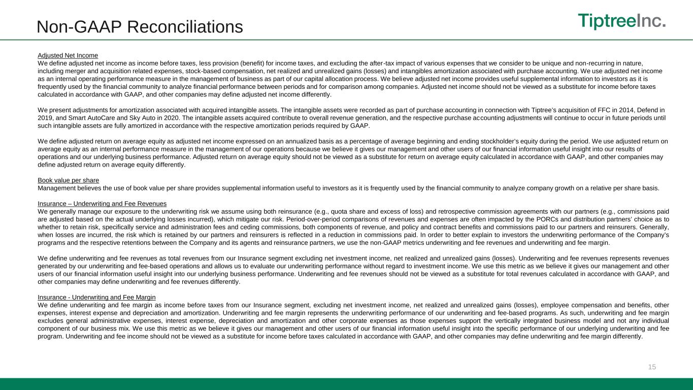 Non-GAAP Reconciliations 15 Adjusted Net Income We define adjusted net income as income before taxes, less provision (benefit) for income taxes, and excluding the after-tax impact of various expenses that we consider to be unique and non-recurring in nature, including merger and acquisition related expenses, stock-based compensation, net realized and unrealized gains (losses) and intangibles amortization associated with purchase accounting. We use adjusted net income as an internal operating performance measure in the management of business as part of our capital allocation process. We believe adjusted net income provides useful supplemental information to investors as it is frequently used by the financial community to analyze financial performance between periods and for comparison among companies. Adjusted net income should not be viewed as a substitute for income before taxes calculated in accordance with GAAP, and other companies may define adjusted net income differently. We present adjustments for amortization associated with acquired intangible assets. The intangible assets were recorded as part of purchase accounting in connection with Tiptree’s acquisition of FFC in 2014, Defend in 2019, and Smart AutoCare and Sky Auto in 2020. The intangible assets acquired contribute to overall revenue generation, and the respective purchase accounting adjustments will continue to occur in future periods until such intangible assets are fully amortized in accordance with the respective amortization periods required by GAAP. We define adjusted return on average equity as adjusted net income expressed on an annualized basis as a percentage of average beginning and ending stockholder’s equity during the period. We use adjusted return on average equity as an internal performance measure in the management of our operations because we believe it gives our management and other users of our financial information useful insight into our results of operations and our underlying business performance. Adjusted return on average equity should not be viewed as a substitute for return on average equity calculated in accordance with GAAP, and other companies may define adjusted return on average equity differently. Book value per share Management believes the use of book value per share provides supplemental information useful to investors as it is frequently used by the financial community to analyze company growth on a relative per share basis. Insurance – Underwriting and Fee Revenues We generally manage our exposure to the underwriting risk we assume using both reinsurance (e.g., quota share and excess of loss) and retrospective commission agreements with our partners (e.g., commissions paid are adjusted based on the actual underlying losses incurred), which mitigate our risk. Period-over-period comparisons of revenues and expenses are often impacted by the PORCs and distribution partners’ choice as to whether to retain risk, specifically service and administration fees and ceding commissions, both components of revenue, and policy and contract benefits and commissions paid to our partners and reinsurers. Generally, when losses are incurred, the risk which is retained by our partners and reinsurers is reflected in a reduction in commissions paid. In order to better explain to investors the underwriting performance of the Company’s programs and the respective retentions between the Company and its agents and reinsurance partners, we use the non-GAAP metrics underwriting and fee revenues and underwriting and fee margin. We define underwriting and fee revenues as total revenues from our Insurance segment excluding net investment income, net realized and unrealized gains (losses). Underwriting and fee revenues represents revenues generated by our underwriting and fee-based operations and allows us to evaluate our underwriting performance without regard to investment income. We use this metric as we believe it gives our management and other users of our financial information useful insight into our underlying business performance. Underwriting and fee revenues should not be viewed as a substitute for total revenues calculated in accordance with GAAP, and other companies may define underwriting and fee revenues differently. Insurance - Underwriting and Fee Margin We define underwriting and fee margin as income before taxes from our Insurance segment, excluding net investment income, net realized and unrealized gains (losses), employee compensation and benefits, other expenses, interest expense and depreciation and amortization. Underwriting and fee margin represents the underwriting performance of our underwriting and fee-based programs. As such, underwriting and fee margin excludes general administrative expenses, interest expense, depreciation and amortization and other corporate expenses as those expenses support the vertically integrated business model and not any individual component of our business mix. We use this metric as we believe it gives our management and other users of our financial information useful insight into the specific performance of our underlying underwriting and fee program. Underwriting and fee income should not be viewed as a substitute for income before taxes calculated in accordance with GAAP, and other companies may define underwriting and fee margin differently.