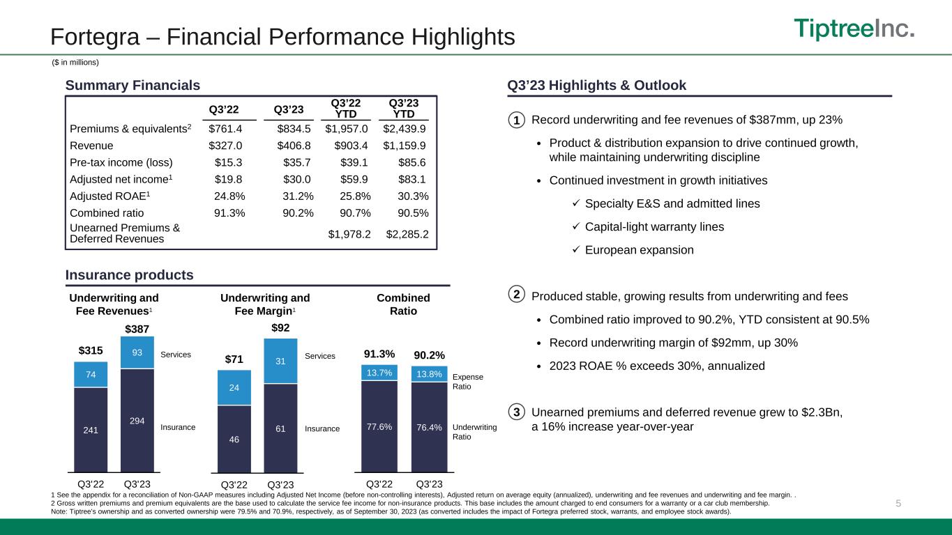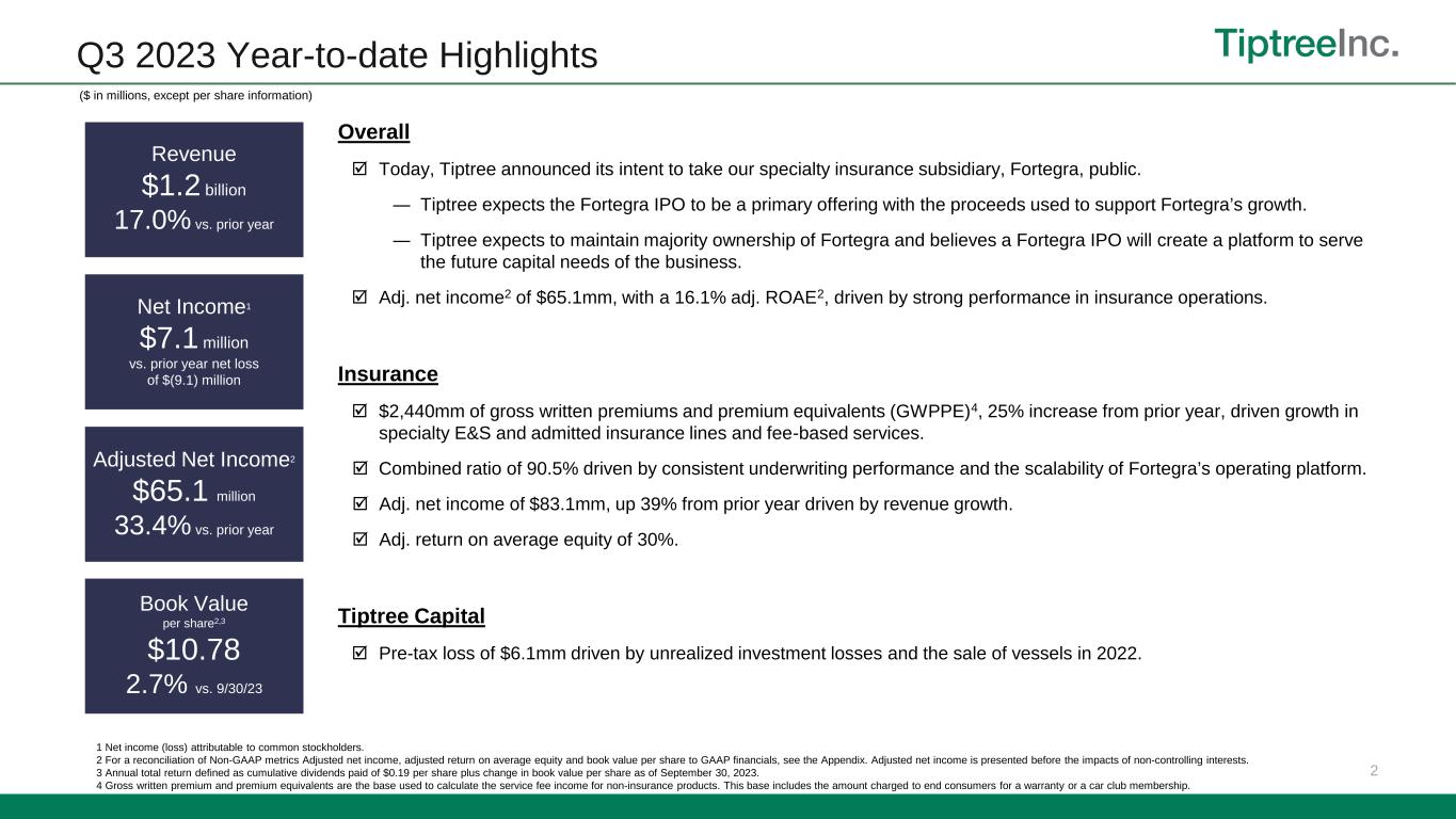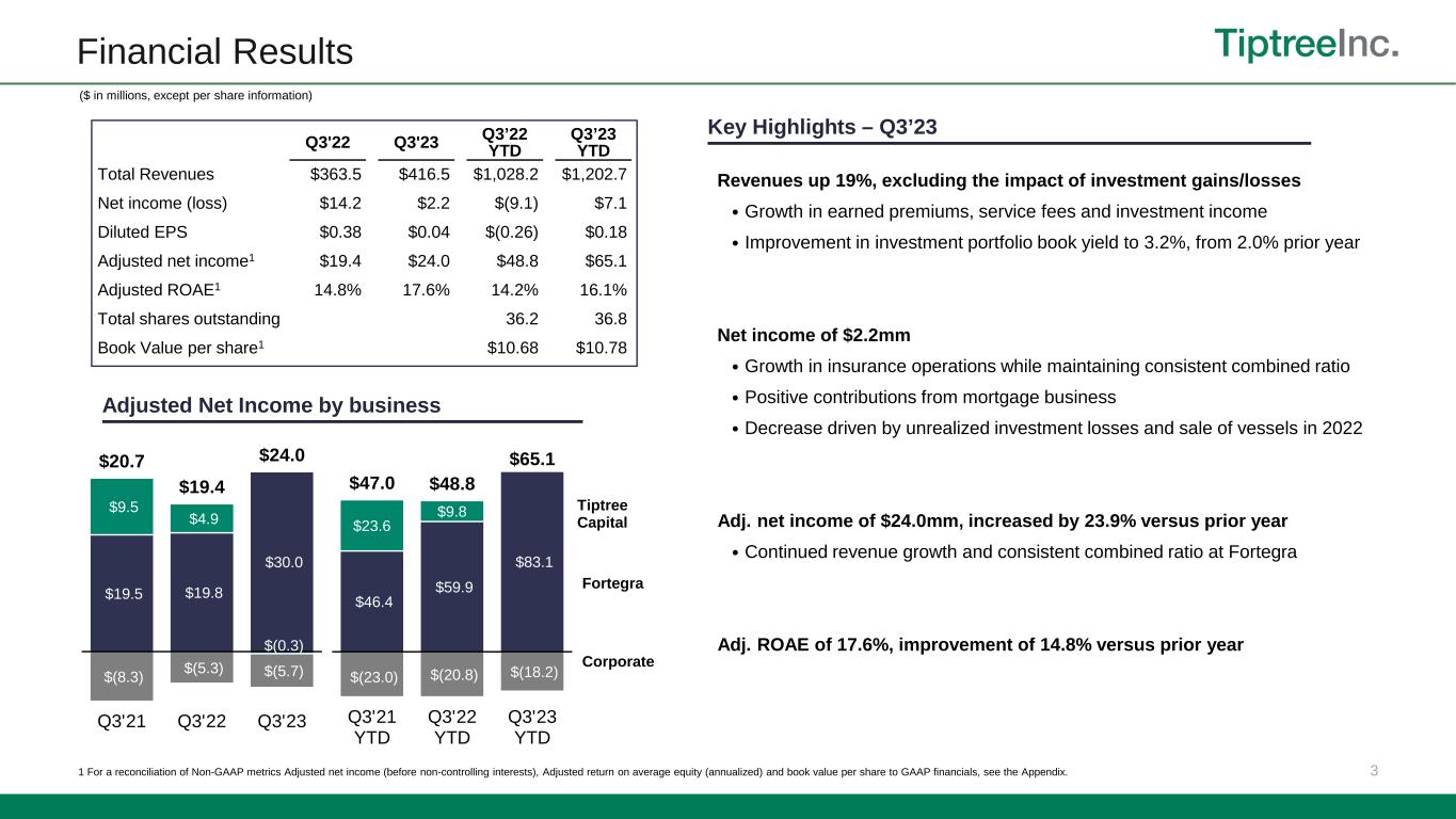 2 Q3 2023 Year-to-date Highlights Revenue $1.2 billion 17.0% vs. prior year Adjusted Net Income2 $65.1 million 33.4% vs. prior year Book Value per share2,3 $10.78 2.7% vs. 9/30/23 Net Income1 $7.1 million vs. prior year net loss of $(9.1) million Overall  Today, Tiptree announced its intent to take our specialty insurance subsidiary, Fortegra, public. ― Tiptree expects the Fortegra IPO to be a primary offering with the proceeds used to support Fortegra’s growth. ― Tiptree expects to maintain majority ownership of Fortegra and believes a Fortegra IPO will create a platform to serve the future capital needs of the business.  Adj. net income2 of $65.1mm, with a 16.1% adj. ROAE2, driven by strong performance in insurance operations. Insurance  $2,440mm of gross written premiums and premium equivalents (GWPPE)4, 25% increase from prior year, driven growth in specialty E&S and admitted insurance lines and fee-based services.  Combined ratio of 90.5% driven by consistent underwriting performance and the scalability of Fortegra’s operating platform.  Adj. net income of $83.1mm, up 39% from prior year driven by revenue growth.  Adj. return on average equity of 30%. Tiptree Capital  Pre-tax loss of $6.1mm driven by unrealized investment losses and the sale of vessels in 2022. ($ in millions, except per share information) 1 Net income (loss) attributable to common stockholders. 2 For a reconciliation of Non-GAAP metrics Adjusted net income, adjusted return on average equity and book value per share to GAAP financials, see the Appendix. Adjusted net income is presented before the impacts of non-controlling interests. 3 Annual total return defined as cumulative dividends paid of $0.19 per share plus change in book value per share as of September 30, 2023. 4 Gross written premium and premium equivalents are the base used to calculate the service fee income for non-insurance products. This base includes the amount charged to end consumers for a warranty or a car club membership.