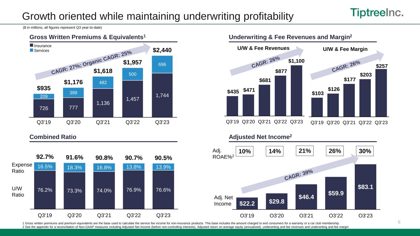 5 Fortegra – Financial Performance Highlights Record underwriting and fee revenues of $387mm, up 23% • Product & distribution expansion to drive continued growth, while maintaining underwriting discipline • Continued investment in growth initiatives ✓ Specialty E&S and admitted lines ✓ Capital-light warranty lines ✓ European expansion Produced stable, growing results from underwriting and fees • Combined ratio improved to 90.2%, YTD consistent at 90.5% • Record underwriting margin of $92mm, up 30% • 2023 ROAE % exceeds 30%, annualized Unearned premiums and deferred revenue grew to $2.3Bn, a 16% increase year-over-year Underwriting and Fee Margin1 Underwriting and Fee Revenues1 Combined Ratio 1 2 3 Summary Financials Insurance products Q3’23 Highlights & Outlook 77.6% 76.4% 13.7% 13.8% 91.3% 90.2% Q3'22 Q3'23 ($ in millions) Expense Ratio Underwriting Ratio Services Insurance 1 See the appendix for a reconciliation of Non-GAAP measures including Adjusted Net Income (before non-controlling interests), Adjusted return on average equity (annualized), underwriting and fee revenues and underwriting and fee margin. . 2 Gross written premiums and premium equivalents are the base used to calculate the service fee income for non-insurance products. This base includes the amount charged to end consumers for a warranty or a car club membership. Note: Tiptree’s ownership and as converted ownership were 79.5% and 70.9%, respectively, as of September 30, 2023 (as converted includes the impact of Fortegra preferred stock, warrants, and employee stock awards). Q3’22 Q3’23 Q3’22 YTD Q3’23 YTD Premiums & equivalents2 $761.4 $834.5 $1,957.0 $2,439.9 Revenue $327.0 $406.8 $903.4 $1,159.9 Pre-tax income (loss) $15.3 $35.7 $39.1 $85.6 Adjusted net income1 $19.8 $30.0 $59.9 $83.1 Adjusted ROAE1 24.8% 31.2% 25.8% 30.3% Combined ratio 91.3% 90.2% 90.7% 90.5% Unearned Premiums & Deferred Revenues $1,978.2 $2,285.2 Services Insurance241 294 74 93$315 $387 Q3'22 Q3'23 46 61 24 31$71 $92 Q3'22 Q3'23