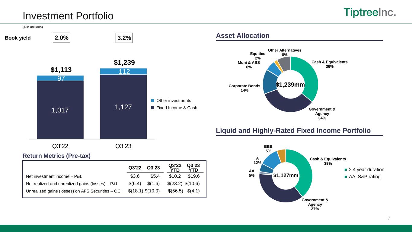 Growth oriented while maintaining underwriting profitability 76.2% 73.3% 74.0% 76.9% 76.6% 16.5% 18.3% 16.8% 13.8% 13.9% 92.7% 91.6% 90.8% 90.7% 90.5% Q3'19 Q3'20 Q3'21 Q3'22 Q3'23 $22.2 $29.8 $46.4 $59.9 $83.1 Q3'19 Q3'20 Q3'21 Q3'22 Q3'23 6 ($ in millions, all figures represent Q3 year-to-date) Gross Written Premiums & Equivalents1 Underwriting & Fee Revenues and Margin2 Adjusted Net Income2 726 777 1,136 1,457 1,744 209 399 482 500 696 $935 $1,176 $1,618 $1,957 $2,440 Q3'19 Q3'20 Q3'21 Q3'22 Q3'23 Combined Ratio Adj. ROAE%2 Adj. Net Income U/W Ratio Expense Ratio Insurance Services 1 Gross written premiums and premium equivalents are the base used to calculate the service fee income for non-insurance products. This base includes the amount charged to end consumers for a warranty or a car club membership. 2 See the appendix for a reconciliation of Non-GAAP measures including Adjusted Net Income (before non-controlling interests), Adjusted return on average equity (annualized), underwriting and fee revenues and underwriting and fee margin 10% U/W & Fee Revenues 26% U/W & Fee Margin 30%21%14% $103 $126 $177 $203 $257 Q3'19 Q3'20 Q3'21 Q3'22 Q3'23 $435 $471 $681 $877 $1,100 Q3'19 Q3'20 Q3'21 Q3'22 Q3'23