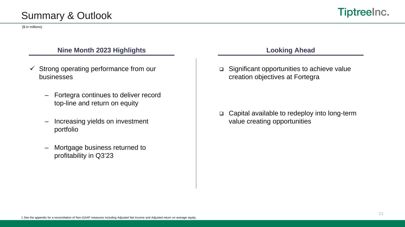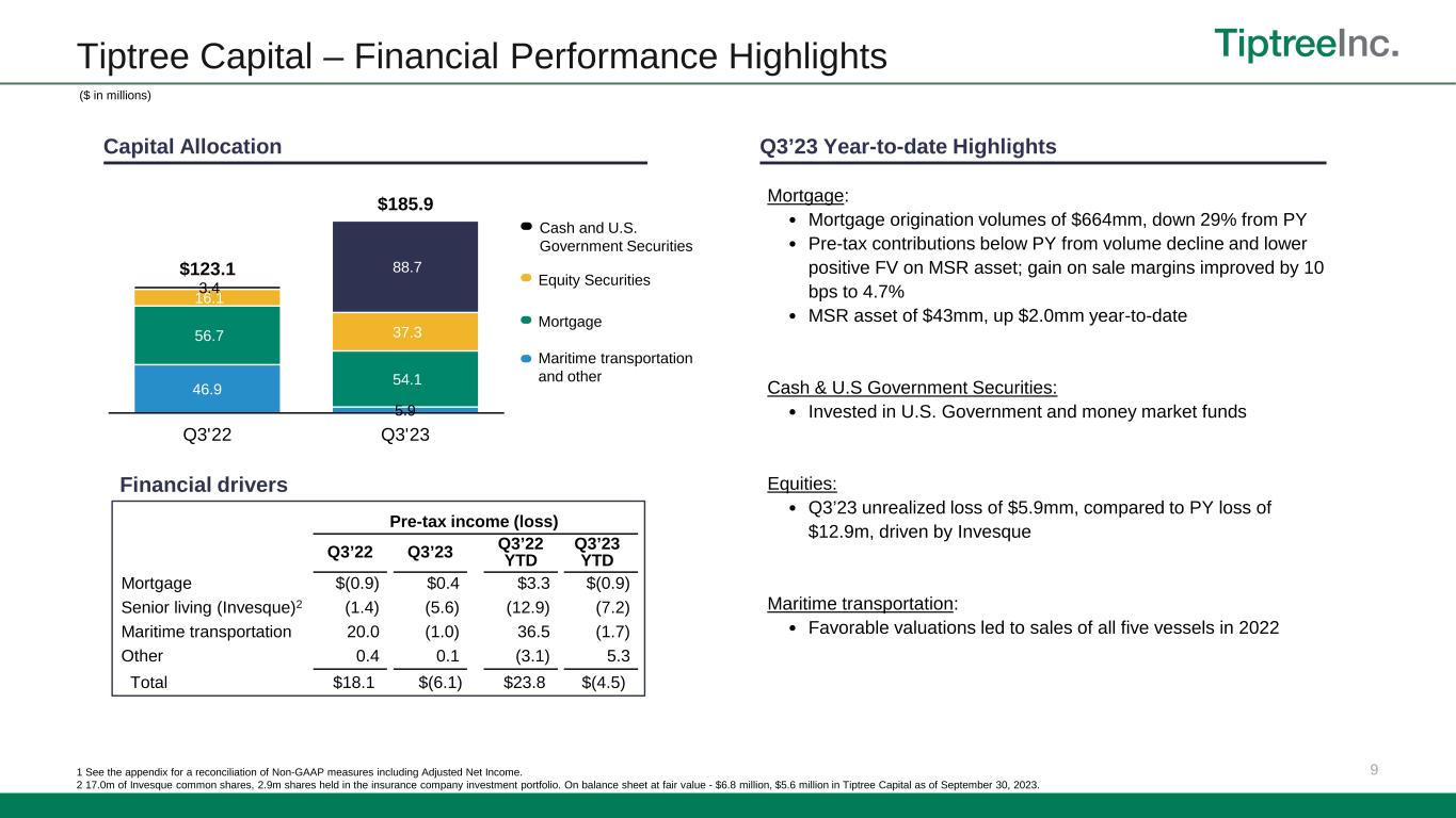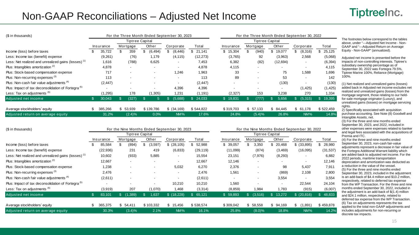 15 Non-GAAP Reconciliations – Adjusted Net Income The footnotes below correspond to the tables above, under “—Adjusted Net Income - Non- GAAP and “—Adjusted Return on Average Equity - Non-GAAP” (annualized). Adjusted net income is presented before the impacts of non-controlling interests. Tiptree’s subsidiary ownership percentage as of September 30, 2022 was Fortegra 79.5%, Tiptree Marine 100%, Reliance (Mortgage) 100%. (1) Net realized and unrealized gains (losses) added back in Adjusted net income excludes net realized and unrealized gains (losses) from the mortgage segment, those relating to our held- for-sale mortgage originator (Luxury), and unrealized gains (losses) on mortgage servicing rights. 2) Specifically associated with acquisition purchase accounting. See Note (8) Goodwill and Intangible Assets, net. (3) For the three and nine months ended September 30, 2023, and 2022, included in other expenses were expenses related to banker and legal fees associated with the acquisitions of Premia and ITC. (4) For the three and nine months ended September 30, 2023, non-cash fair-value adjustments represent a decrease in fair value of the Fortegra Additional Warrant liability which are added-back to adjusted net income. For the 2022 periods, maritime transportation depreciation and amortization was deducted as a reduction in the value of the vessel. (5) For the three and nine months ended September 30, 2023, included in the adjustment is an add-back of $4.4 million and $10.2 million, respectively, related to deferred tax expense from the WP Transaction. For the three and nine months ended September 30, 2022, included in the adjustment is an add-back of $(1.4) million and $24.1 million, respectively, related to deferred tax expense from the WP Transaction. (6) Tax on adjustments represents the tax applied to the total non-GAAP adjustments and includes adjustments for non-recurring or discrete tax impacts. ($ in thousands) Insurance Mortgage Other Corporate Total Insurance Mortgage Other Corporate Total Income (loss) before taxes 35,722$ 359$ (6,494)$ (8,446)$ 21,141$ 15,304$ (940)$ 19,077$ (8,316)$ 25,125$ Less: Income tax (benefit) expense (9,261) (76) 1,179 (4,115) (12,273) (3,765) 92 (3,963) 2,568 (5,068) Less: Net realized and unrealized gains (losses) (1) 1,616 (788) 6,625 - 7,453 6,382 (82) (12,694) - (6,394) Plus: Intangibles amortization (2) 4,878 - - - 4,878 4,115 - - - 4,115 Plus: Stock-based compensation expense 717 - - 1,246 1,963 33 - 75 1,588 1,696 Plus: Non-recurring expenses (3) 113 - - - 113 89 - 53 - 142 Plus: Non-cash fair value adjustments (4) (2,447) - - - (2,447) - - (130) - (130) Plus: Impact of tax deconsolidation of Fortegra (5) - - - 4,396 4,396 - - - (1,425) (1,425) Less: Tax on adjustments (6) (1,295) 178 (1,305) 1,231 (1,191) (2,327) 153 3,238 270 1,334 Adjusted net income 30,043$ (327)$ 5$ (5,688)$ 24,033$ 19,831$ (777)$ 5,656$ (5,315)$ 19,395$ Average stockholders’ equity 385,266$ 53,939$ 139,786$ (34,169)$ 544,822$ 319,703$ 57,133$ 84,445$ 61,178$ 522,459$ Adjusted return on average equity 31.2% (2.4)% 0.0% NM% 17.6% 24.8% (5.4)% 26.8% NM% 14.8% ($ in thousands) Insurance Mortgage Other Corporate Total Insurance Mortgage Other Corporate Total Income (loss) before taxes 85,584$ (894)$ (3,597)$ (28,105)$ 52,988$ 39,057$ 3,350$ 20,468$ (33,895)$ 28,980$ Less: Income tax (benefit) expense (22,936) 231 419 (6,833) (29,119) (11,099) (874) (3,469) (16,095) (31,537) Less: Net realized and unrealized gains (losses) (1) 10,602 (933) 5,885 - 15,554 23,151 (7,976) (8,293) - 6,882 Plus: Intangibles amortization (2) 12,667 - - - 12,667 12,146 - - - 12,146 Plus: Stock-based compensation expense 1,238 - - 5,032 6,270 2,376 - 98 5,437 7,911 Plus: Non-recurring expenses (3) 2,476 - - - 2,476 1,561 - (869) 2,108 2,800 Plus: Non-cash fair value adjustments (4) (2,611) - - - (2,611) - - 3,554 - 3,554 Plus: Impact of tax deconsolidation of Fortegra (5) - - - 10,210 10,210 1,560 - - 22,544 24,104 Less: Tax on adjustments (6) (3,919) 207 (1,070) 1,468 (3,314) (8,859) 1,984 1,783 (915) (6,007) Adjusted net income 83,101$ (1,389)$ 1,637$ (18,228)$ 65,121$ 59,893$ (3,516)$ 13,272$ (20,816)$ 48,833$ Average stockholders’ equity 365,375$ 54,411$ 103,332$ 15,456$ 538,574$ 309,042$ 58,558$ 94,169$ (1,891)$ 459,878$ Adjusted return on average equity 30.3% (3.4)% 2.1% NM% 16.1% 25.8% (8.0)% 18.8% NM% 14.2% For the Nine Months Ended September 30, 2022 Tiptree Capital Tiptree Capital For the Three Month Ended September 30, 2022 Tiptree Capital For the Three Month Ended September 30, 2023 Tiptree Capital For the Nine Months Ended September 30, 2023
