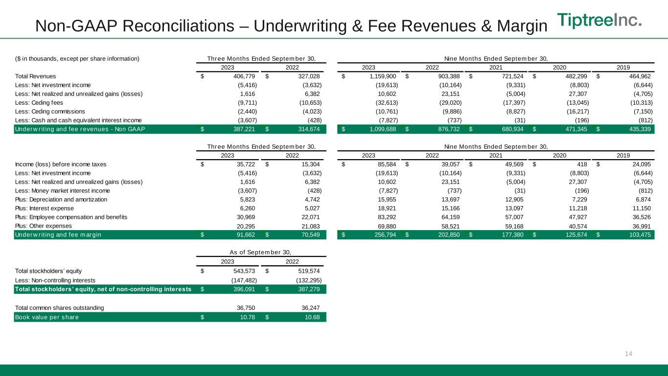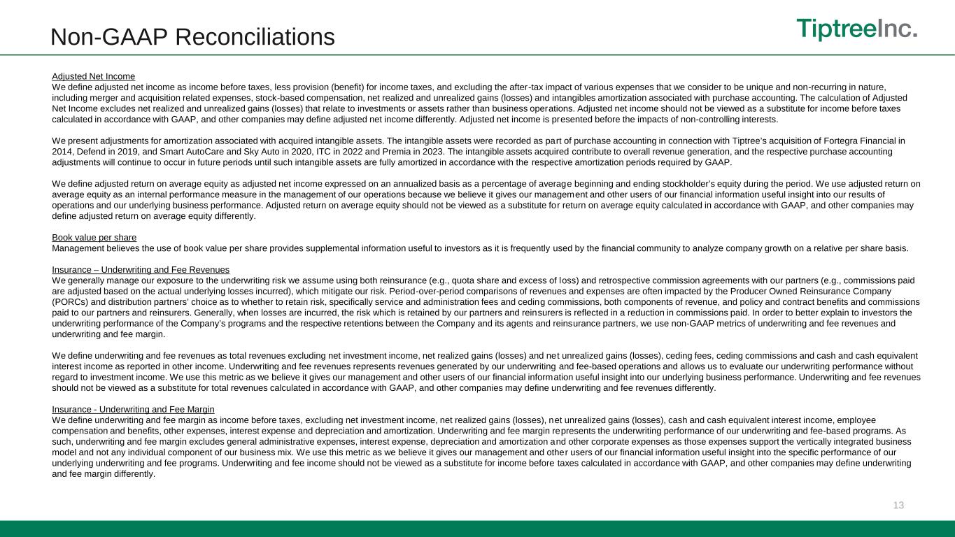 Non-GAAP Reconciliations 13 Adjusted Net Income We define adjusted net income as income before taxes, less provision (benefit) for income taxes, and excluding the after-tax impact of various expenses that we consider to be unique and non-recurring in nature, including merger and acquisition related expenses, stock-based compensation, net realized and unrealized gains (losses) and intangibles amortization associated with purchase accounting. The calculation of Adjusted Net Income excludes net realized and unrealized gains (losses) that relate to investments or assets rather than business operations. Adjusted net income should not be viewed as a substitute for income before taxes calculated in accordance with GAAP, and other companies may define adjusted net income differently. Adjusted net income is presented before the impacts of non-controlling interests. We present adjustments for amortization associated with acquired intangible assets. The intangible assets were recorded as part of purchase accounting in connection with Tiptree’s acquisition of Fortegra Financial in 2014, Defend in 2019, and Smart AutoCare and Sky Auto in 2020, ITC in 2022 and Premia in 2023. The intangible assets acquired contribute to overall revenue generation, and the respective purchase accounting adjustments will continue to occur in future periods until such intangible assets are fully amortized in accordance with the respective amortization periods required by GAAP. We define adjusted return on average equity as adjusted net income expressed on an annualized basis as a percentage of average beginning and ending stockholder’s equity during the period. We use adjusted return on average equity as an internal performance measure in the management of our operations because we believe it gives our management and other users of our financial information useful insight into our results of operations and our underlying business performance. Adjusted return on average equity should not be viewed as a substitute for return on average equity calculated in accordance with GAAP, and other companies may define adjusted return on average equity differently. Book value per share Management believes the use of book value per share provides supplemental information useful to investors as it is frequently used by the financial community to analyze company growth on a relative per share basis. Insurance – Underwriting and Fee Revenues We generally manage our exposure to the underwriting risk we assume using both reinsurance (e.g., quota share and excess of loss) and retrospective commission agreements with our partners (e.g., commissions paid are adjusted based on the actual underlying losses incurred), which mitigate our risk. Period-over-period comparisons of revenues and expenses are often impacted by the Producer Owned Reinsurance Company (PORCs) and distribution partners’ choice as to whether to retain risk, specifically service and administration fees and ceding commissions, both components of revenue, and policy and contract benefits and commissions paid to our partners and reinsurers. Generally, when losses are incurred, the risk which is retained by our partners and reinsurers is reflected in a reduction in commissions paid. In order to better explain to investors the underwriting performance of the Company’s programs and the respective retentions between the Company and its agents and reinsurance partners, we use non-GAAP metrics of underwriting and fee revenues and underwriting and fee margin. We define underwriting and fee revenues as total revenues excluding net investment income, net realized gains (losses) and net unrealized gains (losses), ceding fees, ceding commissions and cash and cash equivalent interest income as reported in other income. Underwriting and fee revenues represents revenues generated by our underwriting and fee-based operations and allows us to evaluate our underwriting performance without regard to investment income. We use this metric as we believe it gives our management and other users of our financial information useful insight into our underlying business performance. Underwriting and fee revenues should not be viewed as a substitute for total revenues calculated in accordance with GAAP, and other companies may define underwriting and fee revenues differently. Insurance - Underwriting and Fee Margin We define underwriting and fee margin as income before taxes, excluding net investment income, net realized gains (losses), net unrealized gains (losses), cash and cash equivalent interest income, employee compensation and benefits, other expenses, interest expense and depreciation and amortization. Underwriting and fee margin represents the underwriting performance of our underwriting and fee-based programs. As such, underwriting and fee margin excludes general administrative expenses, interest expense, depreciation and amortization and other corporate expenses as those expenses support the vertically integrated business model and not any individual component of our business mix. We use this metric as we believe it gives our management and other users of our financial information useful insight into the specific performance of our underlying underwriting and fee programs. Underwriting and fee income should not be viewed as a substitute for income before taxes calculated in accordance with GAAP, and other companies may define underwriting and fee margin differently.