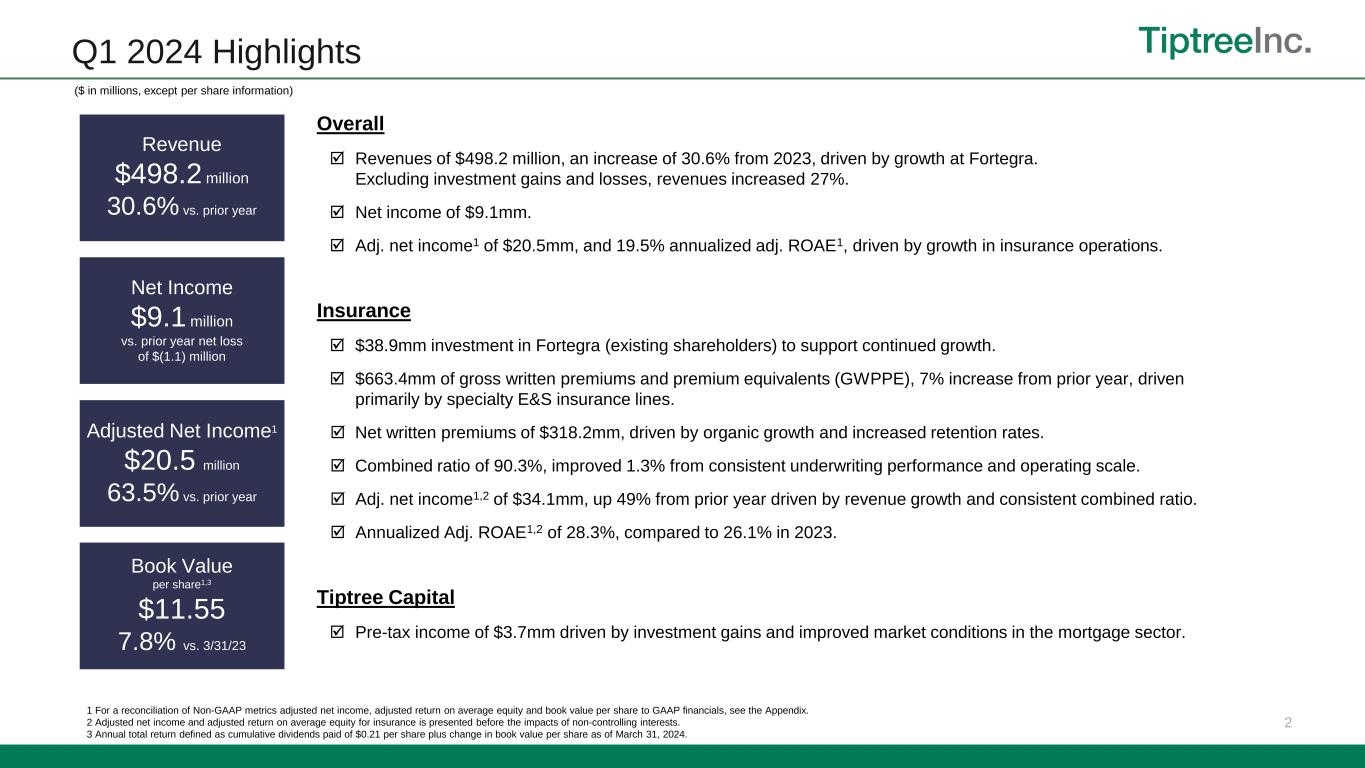 1 Disclaimers LIMITATIONS ON THE USE OF INFORMATION This presentation has been prepared by Tiptree Inc. and its consolidated subsidiaries (“Tiptree", "the Company" or "we”) solely for informational purposes, and not for the purpose of updating any information or forecast with respect to Tiptree, its subsidiaries or any of its affiliates or any other purpose. Tiptree reports a non-controlling interest in certain operating subsidiaries that are not wholly owned. Unless otherwise noted, all information is of Tiptree on a consolidated basis before non-controlling interest. Neither Tiptree nor any of its affiliates makes any representation or warranty, express or implied, as to the accuracy or completeness of the information contained herein and no such party shall have any liability for such information. These materials and any related oral statements are not all-inclusive and shall not be construed as legal, tax, investment or any other advice. You should consult your own counsel, accountant or business advisors. Performance information is historical and is not indicative of, nor does it guarantee future results. There can be no assurance that similar performance may be experienced in the future. SPECIAL NOTE REGARDING FORWARD-LOOKING STATEMENTS This document contains "forward-looking statements" which involve risks, uncertainties and contingencies, many of which are beyond Tiptree's control, which may cause actual results, performance, or achievements to differ materially from anticipated results, performance, or achievements. All statements contained herein that are not clearly historical in nature are forward-looking, and the words "anticipate," "believe," "estimate," "expect,“ “intend,” “may,” “might,” "plan," “project,” “should,” "target,“ “will,” "view," “confident,” or similar expressions are intended to identify forward-looking statements. Such forward-looking statements include, but are not limited to, statements about Tiptree's plans, objectives, expectations and intentions. The forward-looking statements are not guarantees of future performance and are subject to risks, uncertainties and other factors, many of which are beyond our control, are difficult to predict and could cause actual results to differ materially from those expressed or forecast in the forward-looking statements. Our actual results could differ materially from those anticipated in these forward-looking statements as a result of various factors, including, but not limited to those described in the section entitled “Risk Factors” in Tiptree’s Annual Report on Form 10-K, and as described in the Tiptree’s other filings with the SEC. Readers are cautioned not to place undue reliance on these forward-looking statements, which speak only as to the date of this release. The factors described therein are not necessarily all of the important factors that could cause actual results or developments to differ materially from those expressed in any of our forward-looking statements. Other unknown or unpredictable factors also could affect our forward-looking statements. Consequently, our actual performance could be materially different from the results described or anticipated by our forward-looking statements. Given these uncertainties, you should not place undue reliance on these forward-looking statements. Except as required by the federal securities laws, we undertake no obligation to update any forward- looking statements. MARKET AND INDUSTRY DATA Certain market data and industry data used in this presentation were obtained from reports of governmental agencies and industry publications and surveys. We believe the data from third-party sources to be reliable based upon our management’s knowledge of the industry, but have not independently verified such data and as such, make no guarantees as to its accuracy, completeness or timeliness. NOT AN OFFER OR A SOLICIATION This document does not constitute an offer or invitation for the sale or purchase of securities or to engage in any other transaction with Tiptree, its subsidiaries or its affiliates. The information in this document is not targeted at the residents of any particular country or jurisdiction and is not intended for distribution to, or use by, any person in any jurisdiction or country where such distribution or use would be contrary to local law or regulation. NON-GAAP MEASURES In this document, we sometimes use financial measures derived from consolidated financial data but not presented in our financial statements prepared in accordance with U.S. generally accepted accounting principles ("GAAP"). Certain of these data are considered “non-GAAP financial measures” under the SEC rules. These non-GAAP financial measures supplement our GAAP disclosures and should not be considered an alternative to the GAAP measure. Management's reasons for using these non-GAAP financial measures and the reconciliations to their most directly comparable GAAP financial measures are posted in the Appendix.