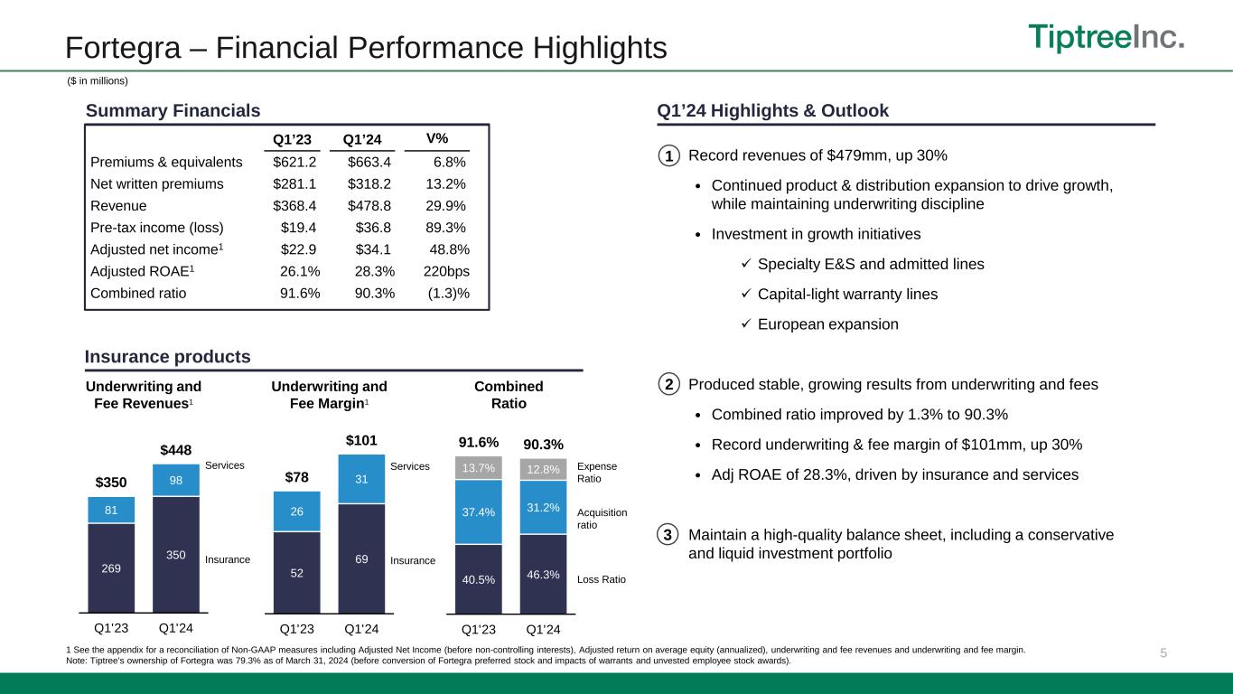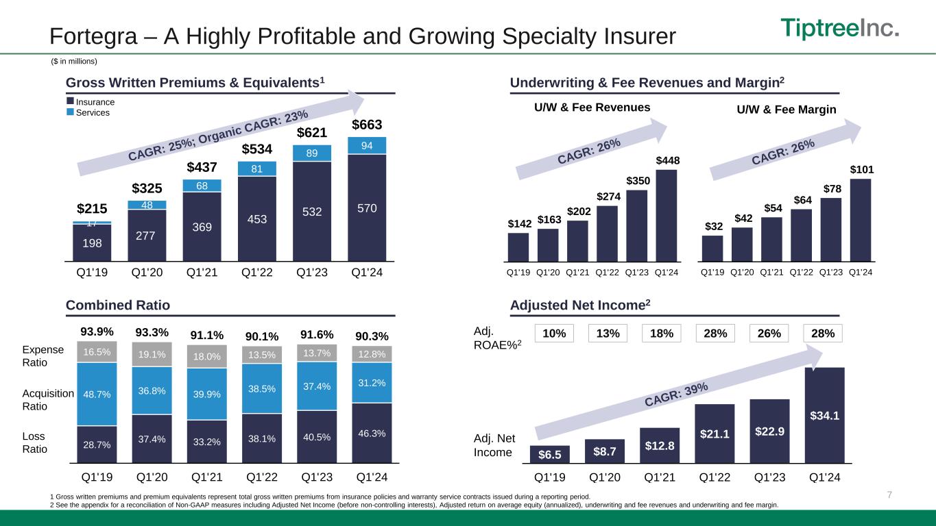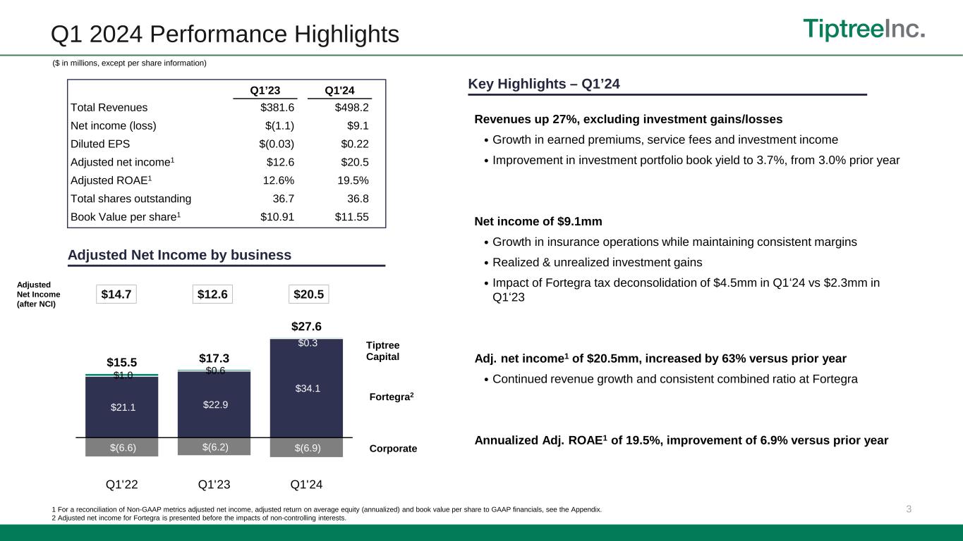 2 Q1 2024 Highlights Revenue $498.2 million 30.6% vs. prior year Adjusted Net Income1 $20.5 million 63.5% vs. prior year Book Value per share1,3 $11.55 7.8% vs. 3/31/23 Net Income $9.1 million vs. prior year net loss of $(1.1) million Overall  Revenues of $498.2 million, an increase of 30.6% from 2023, driven by growth at Fortegra. Excluding investment gains and losses, revenues increased 27%.  Net income of $9.1mm.  Adj. net income1 of $20.5mm, and 19.5% annualized adj. ROAE1, driven by growth in insurance operations. Insurance  $38.9mm investment in Fortegra (existing shareholders) to support continued growth.  $663.4mm of gross written premiums and premium equivalents (GWPPE), 7% increase from prior year, driven primarily by specialty E&S insurance lines.  Net written premiums of $318.2mm, driven by organic growth and increased retention rates.  Combined ratio of 90.3%, improved 1.3% from consistent underwriting performance and operating scale.  Adj. net income1,2 of $34.1mm, up 49% from prior year driven by revenue growth and consistent combined ratio.  Annualized Adj. ROAE1,2 of 28.3%, compared to 26.1% in 2023. Tiptree Capital  Pre-tax income of $3.7mm driven by investment gains and improved market conditions in the mortgage sector. ($ in millions, except per share information) 1 For a reconciliation of Non-GAAP metrics adjusted net income, adjusted return on average equity and book value per share to GAAP financials, see the Appendix. 2 Adjusted net income and adjusted return on average equity for insurance is presented before the impacts of non-controlling interests. 3 Annual total return defined as cumulative dividends paid of $0.21 per share plus change in book value per share as of March 31, 2024.