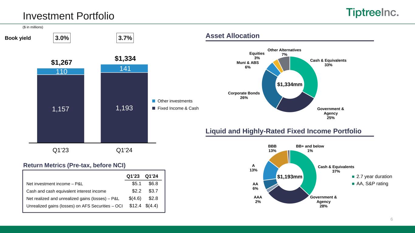 5 Fortegra – Financial Performance Highlights Record revenues of $479mm, up 30% • Continued product & distribution expansion to drive growth, while maintaining underwriting discipline • Investment in growth initiatives ✓ Specialty E&S and admitted lines ✓ Capital-light warranty lines ✓ European expansion Produced stable, growing results from underwriting and fees • Combined ratio improved by 1.3% to 90.3% • Record underwriting & fee margin of $101mm, up 30% • Adj ROAE of 28.3%, driven by insurance and services Maintain a high-quality balance sheet, including a conservative and liquid investment portfolio Underwriting and Fee Margin1 Underwriting and Fee Revenues1 Combined Ratio 1 2 3 Summary Financials Insurance products Q1’24 Highlights & Outlook ($ in millions) Expense Ratio Loss Ratio Services Insurance 1 See the appendix for a reconciliation of Non-GAAP measures including Adjusted Net Income (before non-controlling interests), Adjusted return on average equity (annualized), underwriting and fee revenues and underwriting and fee margin. Note: Tiptree’s ownership of Fortegra was 79.3% as of March 31, 2024 (before conversion of Fortegra preferred stock and impacts of warrants and unvested employee stock awards). Q1’23 Q1’24 V% Premiums & equivalents $621.2 $663.4 6.8% Net written premiums $281.1 $318.2 13.2% Revenue $368.4 $478.8 29.9% Pre-tax income (loss) $19.4 $36.8 89.3% Adjusted net income1 $22.9 $34.1 48.8% Adjusted ROAE1 26.1% 28.3% 220bps Combined ratio 91.6% 90.3% (1.3)% Services Insurance 269 350 81 98$350 $448 Q1'23 Q1'24 52 69 26 31$78 $101 Q1'23 Q1'24 40.5% 46.3% 37.4% 31.2% 13.7% 12.8% 91.6% 90.3% Q1'23 Q1'24 Acquisition ratio