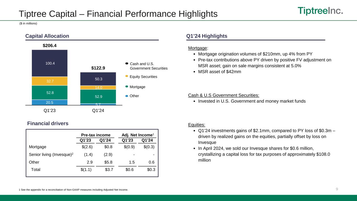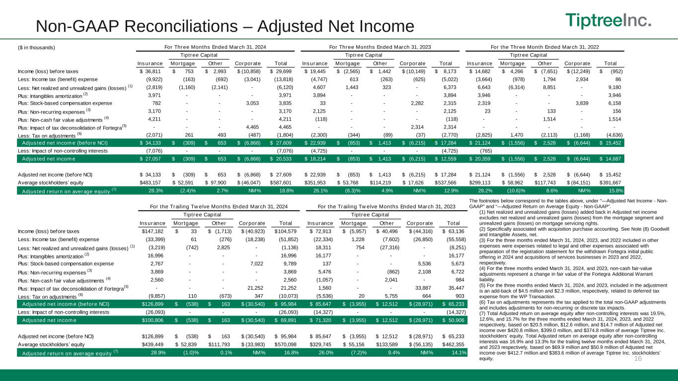 16 Non-GAAP Reconciliations – Adjusted Net Income The footnotes below correspond to the tables above, under “—Adjusted Net Income - Non- GAAP” and “—Adjusted Return on Average Equity - Non-GAAP”. (1) Net realized and unrealized gains (losses) added back in Adjusted net income excludes net realized and unrealized gains (losses) from the mortgage segment and unrealized gains (losses) on mortgage servicing rights. (2) Specifically associated with acquisition purchase accounting. See Note (8) Goodwill and Intangible Assets, net. (3) For the three months ended March 31, 2024, 2023, and 2022 included in other expenses were expenses related to legal and other expenses associated with preparation of the registration statement for the withdrawn Fortegra initial public offering in 2024 and acquisitions of services businesses in 2023 and 2022, respectively. (4) For the three months ended March 31, 2024, and 2023, non-cash fair-value adjustments represent a change in fair value of the Fortegra Additional Warrant liability. (5) For the three months ended March 31, 2024, and 2023, included in the adjustment is an add-back of $4.5 million and $2.3 million, respectively, related to deferred tax expense from the WP Transaction. (6) Tax on adjustments represents the tax applied to the total non-GAAP adjustments and includes adjustments for non-recurring or discrete tax impacts. (7) Total Adjusted return on average equity after non-controlling interests was 19.5%, 12.6%, and 15.7% for the three months ended March 31, 2024, 2023, and 2022 respectively, based on $20.5 million, $12.6 million, and $14.7 million of Adjusted net income over $420.8 million, $399.0 million, and $374.8 million of average Tiptree Inc. stockholders’ equity. Total Adjusted return on average equity after non-controlling interests was 16.9% and 13.3% for the trailing twelve months ended March 31, 2024, and 2023 respectively, based on $69.9 million and $50.9 million of Adjusted net income over $412.7 million and $383.6 million of average Tiptree Inc. stockholders’ equity. ($ in thousands) Insurance Mortgage Other Corporate Total Insurance Mortgage Other Corporate Total Insurance Mortgage Other Corporate Total Income (loss) before taxes 36,811$ 753$ 2,993$ (10,858)$ 29,699$ 19,445$ (2,565)$ 1,442$ (10,149)$ 8,173$ 14,682$ 4,266$ (7,651)$ (12,249)$ (952)$ Less: Income tax (benefit) expense (9,922) (163) (692) (3,041) (13,818) (4,747) 613 (263) (625) (5,022) (3,664) (978) 1,794 2,934 86 Less: Net realized and unrealized gains (losses) (1) (2,819) (1,160) (2,141) - (6,120) 4,607 1,443 323 - 6,373 6,643 (6,314) 8,851 - 9,180 Plus: Intangibles amortization (2) 3,971 - - - 3,971 3,894 - - - 3,894 3,946 - - - 3,946 Plus: Stock-based compensation expense 782 - - 3,053 3,835 33 - - 2,282 2,315 2,319 - - 3,839 6,158 Plus: Non-recurring expenses (3) 3,170 - - - 3,170 2,125 - - - 2,125 23 - 133 - 156 Plus: Non-cash fair value adjustments (4) 4,211 - - - 4,211 (118) - - - (118) - - 1,514 - 1,514 Plus: Impact of tax deconsolidation of Fortegra (5) - - - 4,465 4,465 - - - 2,314 2,314 - - - - - Less: Tax on adjustments (6) (2,071) 261 493 (487) (1,804) (2,300) (344) (89) (37) (2,770) (2,825) 1,470 (2,113) (1,168) (4,636) Adjusted net income (before NCI) 34,133$ (309)$ 653$ (6,868)$ 27,609$ 22,939$ (853)$ 1,413$ (6,215)$ 17,284$ 21,124$ (1,556)$ 2,528$ (6,644)$ 15,452$ Less: Impact of non-controlling interests (7,076) - - - (7,076) (4,725) - - - (4,725) (765) Adjusted net income 27,057$ (309)$ 653$ (6,868)$ 20,533$ 18,214$ (853)$ 1,413$ (6,215)$ 12,559$ 20,359$ (1,556)$ 2,528$ (6,644)$ 14,687$ Adjusted net income (before NCI) 34,133$ (309)$ 653$ (6,868)$ 27,609$ 22,939$ (853)$ 1,413$ (6,215)$ 17,284$ 21,124$ (1,556)$ 2,528$ (6,644)$ 15,452$ Average stockholders’ equity 483,157$ 52,591$ 97,900$ (46,047)$ 587,601$ 351,953$ 53,768$ 114,219$ 17,626$ 537,566$ 299,113$ 58,962$ 117,743$ (84,151)$ 391,667$ Adjusted return on average equity (7) 28.3% (2.4)% 2.7% NM% 18.8% 26.1% (6.3)% 4.9% NM% 12.9% 28.2% (10.6)% 8.6% NM% 15.8% For Three Months Ended March 31, 2023 For the Three Month Ended March 31, 2022 Tiptree CapitalTiptree Capital For Three Months Ended March 31, 2024 Tiptree Capital Insurance Mortgage Other Corporate Total Insurance Mortgage Other Corporate Total Income (loss) before taxes 147,182$ 33$ (1,713)$ (40,923)$ 104,579$ 72,913$ (5,957)$ 40,496$ (44,316)$ 63,136$ Less: Income tax (benefit) expense (33,399) 61 (276) (18,238) (51,852) (22,334) 1,228 (7,602) (26,850) (55,558) Less: Net realized and unrealized gains (losses) (1) (3,219) (742) 2,825 - (1,136) 18,311 754 (27,316) - (8,251) Plus: Intangibles amortization (2) 16,996 - - - 16,996 16,177 - - - 16,177 Plus: Stock-based compensation expense 2,767 - - 7,022 9,789 137 - - 5,536 5,673 Plus: Non-recurring expenses (3) 3,869 - - - 3,869 5,476 - (862) 2,108 6,722 Plus: Non-cash fair value adjustments (4) 2,560 - - - 2,560 (1,057) - 2,041 - 984 Plus: Impact of tax deconsolidation of Fortegra (5) - - - 21,252 21,252 1,560 - - 33,887 35,447 Less: Tax on adjustments (6) (9,857) 110 (673) 347 (10,073) (5,536) 20 5,755 664 903 Adjusted net income (before NCI) 126,899$ (538)$ 163$ (30,540)$ 95,984$ 85,647$ (3,955)$ 12,512$ (28,971)$ 65,233$ Less: Impact of non-controlling interests (26,093) - - - (26,093) (14,327) - - - (14,327) Adjusted net income 100,806$ (538)$ 163$ (30,540)$ 69,891$ 71,320$ (3,955)$ 12,512$ (28,971)$ 50,906$ Adjusted net income (before NCI) 126,899$ (538)$ 163$ (30,540)$ 95,984$ 85,647$ (3,955)$ 12,512$ (28,971)$ 65,233$ Average stockholders’ equity 439,449$ 52,839$ 111,793$ (33,983)$ 570,098$ 329,745$ 55,156$ 133,589$ (56,135)$ 462,355$ Adjusted return on average equity (7) 28.9% (1.0)% 0.1% NM% 16.8% 26.0% (7.2)% 9.4% NM% 14.1% For the Trailing Twelve Months Ended March 31, 2024 For the Trailing Twelve Months Ended March 31, 2023 Tiptree Capital Tiptree Capital