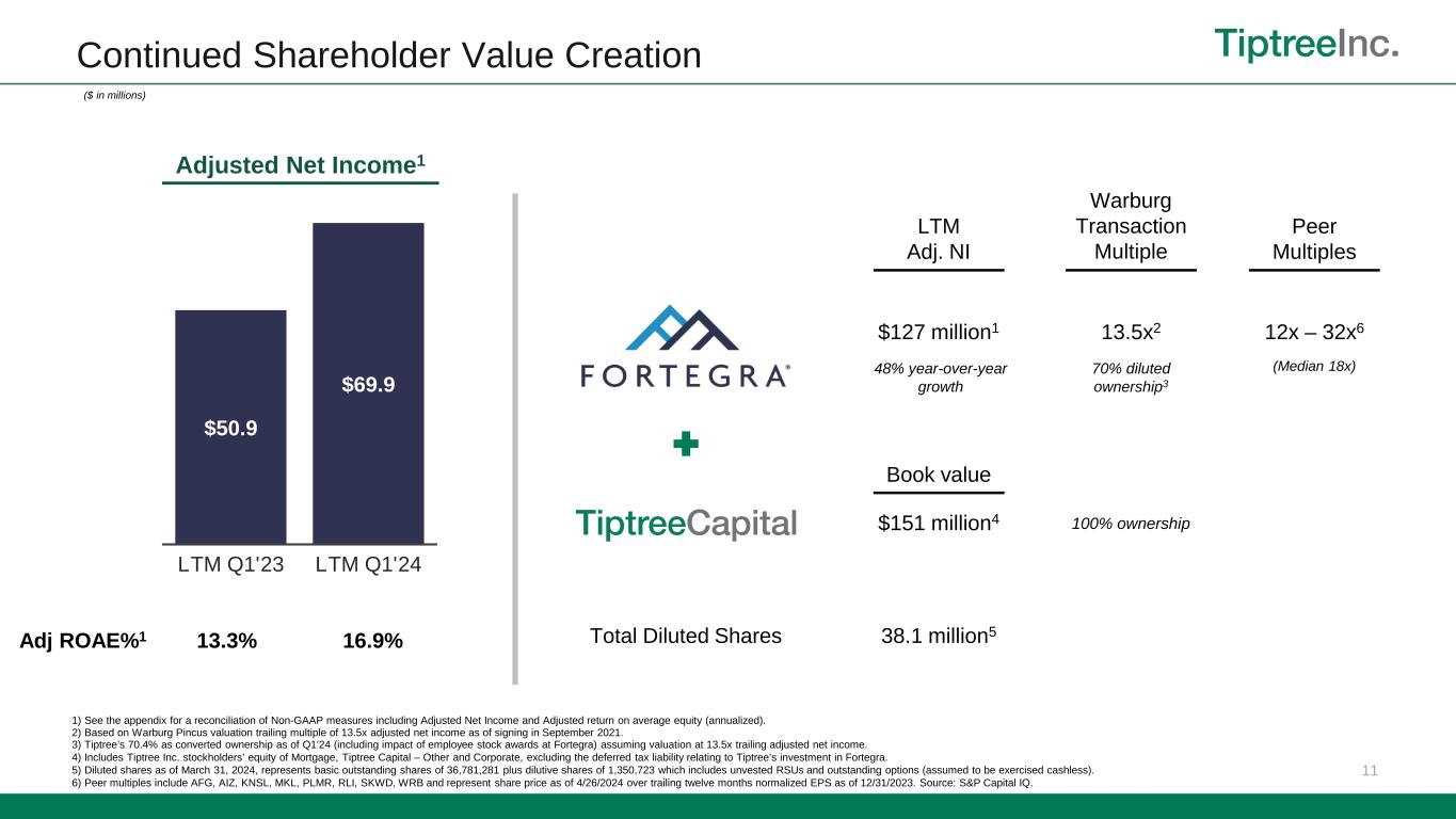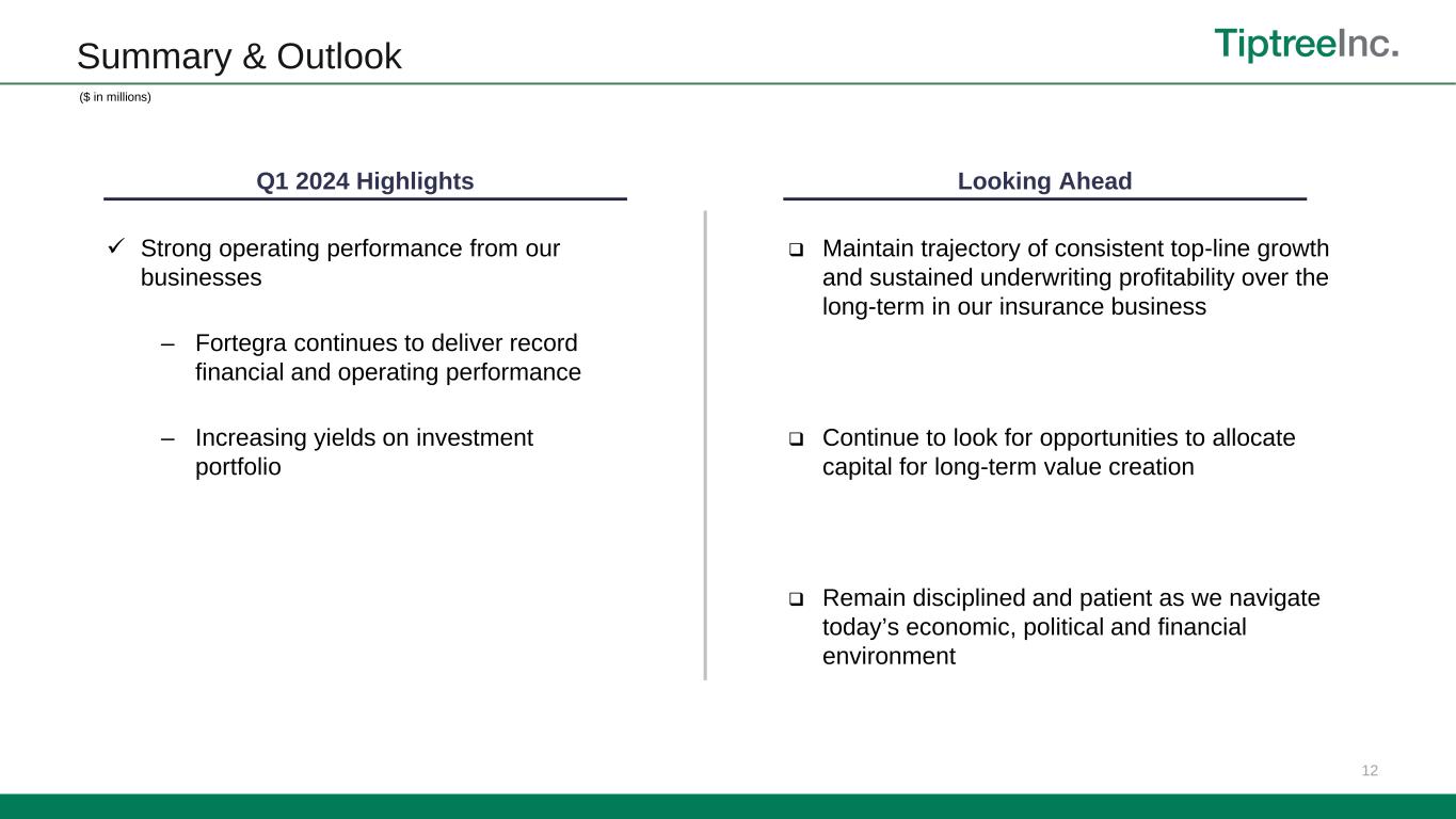 Continued Shareholder Value Creation 11 ($ in millions) Adjusted Net Income1 Adj ROAE%1 13.3% 16.9% $50.9 $69.9 LTM Q1'23 LTM Q1'24 $127 million1 $151 million4 12x – 32x6 (Median 18x) Peer Multiples LTM Adj. NI Warburg Transaction Multiple Total Diluted Shares 38.1 million5 13.5x2 1) See the appendix for a reconciliation of Non-GAAP measures including Adjusted Net Income and Adjusted return on average equity (annualized). 2) Based on Warburg Pincus valuation trailing multiple of 13.5x adjusted net income as of signing in September 2021. 3) Tiptree’s 70.4% as converted ownership as of Q1’24 (including impact of employee stock awards at Fortegra) assuming valuation at 13.5x trailing adjusted net income. 4) Includes Tiptree Inc. stockholders’ equity of Mortgage, Tiptree Capital – Other and Corporate, excluding the deferred tax liability relating to Tiptree’s investment in Fortegra. 5) Diluted shares as of March 31, 2024, represents basic outstanding shares of 36,781,281 plus dilutive shares of 1,350,723 which includes unvested RSUs and outstanding options (assumed to be exercised cashless). 6) Peer multiples include AFG, AIZ, KNSL, MKL, PLMR, RLI, SKWD, WRB and represent share price as of 4/26/2024 over trailing twelve months normalized EPS as of 12/31/2023. Source: S&P Capital IQ. 70% diluted ownership3 100% ownership Book value 48% year-over-year growth