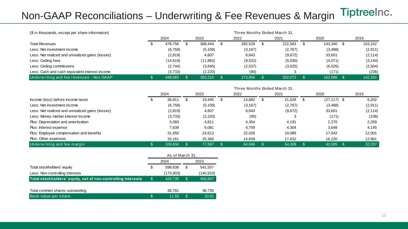 Non-GAAP Reconciliations 14 Adjusted Net Income We define adjusted net income as income before taxes, less provision (benefit) for income taxes, and excluding the after-tax impact of various expenses that we consider to be unique and non-recurring in nature, including merger and acquisition related expenses, stock-based compensation, net realized and unrealized gains (losses) and intangibles amortization associated with purchase accounting, all of which is reduced for non- controlling interests. The calculation of adjusted net income excludes net realized and unrealized gains (losses) that relate to investments or assets rather than business operations. Adjusted net income should not be viewed as a substitute for income before taxes calculated in accordance with GAAP, and other companies may define adjusted net income differently. Adjusted net income (before NCI) is presented before the impacts of non-controlling interests. We present adjustments for amortization associated with acquired intangible assets. The intangible assets were recorded as part of purchase accounting in connection with Tiptree’s acquisition of Fortegra Financial in 2014, Defend in 2019, and Smart AutoCare and Sky Auto in 2020, ITC in 2022 and Premia in 2023. The intangible assets acquired contribute to overall revenue generation, and the respective purchase accounting adjustments will continue to occur in future periods until such intangible assets are fully amortized in accordance with the respective amortization periods required by GAAP. We define adjusted return on average equity as adjusted net income expressed on an annualized basis as a percentage of average beginning and ending stockholder’s equity during the period. We use adjusted return on average equity as an internal performance measure in the management of our operations because we believe it gives our management and other users of our financial information useful insight into our results of operations and our underlying business performance. Adjusted return on average equity should not be viewed as a substitute for return on average equity calculated in accordance with GAAP, and other companies may define adjusted return on average equity differently. Book value per share Management believes the use of book value per share provides supplemental information useful to investors as it is frequently used by the financial community to analyze company growth on a relative per share basis. Insurance – Underwriting and Fee Revenues We generally manage our exposure to the underwriting risk we assume using both reinsurance (e.g., quota share and excess of loss) and retrospective commission agreements with our partners (e.g., commissions paid are adjusted based on the actual underlying losses incurred), which mitigate our risk. Period-over-period comparisons of revenues and expenses are often impacted by the Producer Owned Reinsurance Company (PORCs) and distribution partners’ choice as to whether to retain risk, specifically service and administration fees and ceding commissions, both components of revenue, and policy and contract benefits and commissions paid to our partners and reinsurers. Generally, when losses are incurred, the risk which is retained by our partners and reinsurers is reflected in a reduction in commissions paid. In order to better explain to investors the underwriting performance of the Company’s programs and the respective retentions between the Company and its agents and reinsurance partners, we use non-GAAP metrics of underwriting and fee revenues and underwriting and fee margin. We define underwriting and fee revenues as total revenues excluding net investment income, net realized gains (losses) and net unrealized gains (losses), ceding fees, ceding commissions and cash and cash equivalent interest income as reported in other income. Underwriting and fee revenues represents revenues generated by our underwriting and fee-based operations and allows us to evaluate our underwriting performance without regard to investment income. We use this metric as we believe it gives our management and other users of our financial information useful insight into our underlying business performance. Underwriting and fee revenues should not be viewed as a substitute for total revenues calculated in accordance with GAAP, and other companies may define underwriting and fee revenues differently. Insurance - Underwriting and Fee Margin We define underwriting and fee margin as income before taxes, excluding net investment income, net realized gains (losses), net unrealized gains (losses), cash and cash equivalent interest income, employee compensation and benefits, other expenses, interest expense and depreciation and amortization. Underwriting and fee margin represents the underwriting performance of our underwriting and fee-based programs. As such, underwriting and fee margin excludes general administrative expenses, interest expense, depreciation and amortization and other corporate expenses as those expenses support the vertically integrated business model and not any individual component of our business mix. We use this metric as we believe it gives our management and other users of our financial information useful insight into the specific performance of our underlying underwriting and fee programs. Underwriting and fee income should not be viewed as a substitute for income before taxes calculated in accordance with GAAP, and other companies may define underwriting and fee margin differently.
