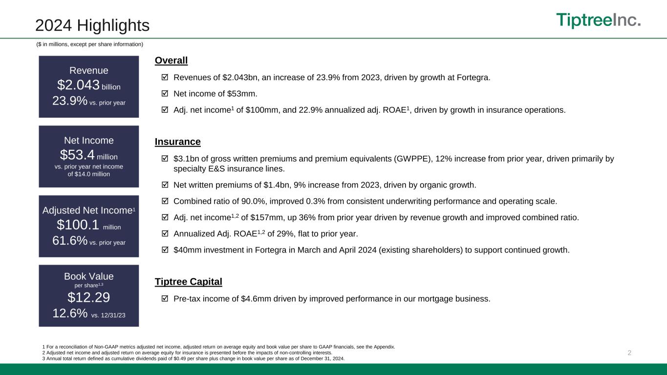 1 Disclaimers LIMITATIONS ON THE USE OF INFORMATION This presentation has been prepared by Tiptree Inc. and its consolidated subsidiaries (“Tiptree", "the Company" or "we”) solely for informational purposes, and not for the purpose of updating any information or forecast with respect to Tiptree, its subsidiaries or any of its affiliates or any other purpose. Tiptree reports a non-controlling interest in certain operating subsidiaries that are not wholly owned. Unless otherwise noted, all information is of Tiptree on a consolidated basis before non-controlling interest. Neither Tiptree nor any of its affiliates makes any representation or warranty, express or implied, as to the accuracy or completeness of the information contained herein and no such party shall have any liability for such information. These materials and any related oral statements are not all-inclusive and shall not be construed as legal, tax, investment or any other advice. You should consult your own counsel, accountant or business advisors. Performance information is historical and is not indicative of, nor does it guarantee future results. There can be no assurance that similar performance may be experienced in the future. SPECIAL NOTE REGARDING FORWARD-LOOKING STATEMENTS This document contains "forward-looking statements" which involve risks, uncertainties and contingencies, many of which are beyond Tiptree's control, which may cause actual results, performance, or achievements to differ materially from anticipated results, performance, or achievements. All statements contained herein that are not clearly historical in nature are forward-looking, and the words "anticipate," "believe," "estimate," "expect,“ “intend,” “may,” “might,” "plan," “project,” “should,” "target,“ “will,” "view," “confident,” or similar expressions are intended to identify forward-looking statements. Such forward-looking statements include, but are not limited to, statements about Tiptree's plans, objectives, expectations and intentions. The forward-looking statements are not guarantees of future performance and are subject to risks, uncertainties and other factors, many of which are beyond our control, are difficult to predict and could cause actual results to differ materially from those expressed or forecast in the forward-looking statements. Our actual results could differ materially from those anticipated in these forward-looking statements as a result of various factors, including, but not limited to those described in the section entitled “Risk Factors” in Tiptree’s Annual Report on Form 10-K, and as described in the Tiptree’s other filings with the SEC. Readers are cautioned not to place undue reliance on these forward-looking statements, which speak only as to the date of this release. The factors described therein are not necessarily all of the important factors that could cause actual results or developments to differ materially from those expressed in any of our forward-looking statements. Other unknown or unpredictable factors also could affect our forward-looking statements. Consequently, our actual performance could be materially different from the results described or anticipated by our forward-looking statements. Given these uncertainties, you should not place undue reliance on these forward-looking statements. Except as required by the federal securities laws, we undertake no obligation to update any forward- looking statements. MARKET AND INDUSTRY DATA Certain market data and industry data used in this presentation were obtained from reports of governmental agencies and industry publications and surveys. We believe the data from third-party sources to be reliable based upon our management’s knowledge of the industry, but have not independently verified such data and as such, make no guarantees as to its accuracy, completeness or timeliness. NOT AN OFFER OR A SOLICIATION This document does not constitute an offer or invitation for the sale or purchase of securities or to engage in any other transaction with Tiptree, its subsidiaries or its affiliates. The information in this document is not targeted at the residents of any particular country or jurisdiction and is not intended for distribution to, or use by, any person in any jurisdiction or country where such distribution or use would be contrary to local law or regulation. NON-GAAP MEASURES In this document, we sometimes use financial measures derived from consolidated financial data but not presented in our financial statements prepared in accordance with U.S. generally accepted accounting principles ("GAAP"). Certain of these data are considered “non-GAAP financial measures” under the SEC rules. These non-GAAP financial measures supplement our GAAP disclosures and should not be considered an alternative to the GAAP measure. Management's reasons for using these non-GAAP financial measures and the reconciliations to their most directly comparable GAAP financial measures are posted in the Appendix.