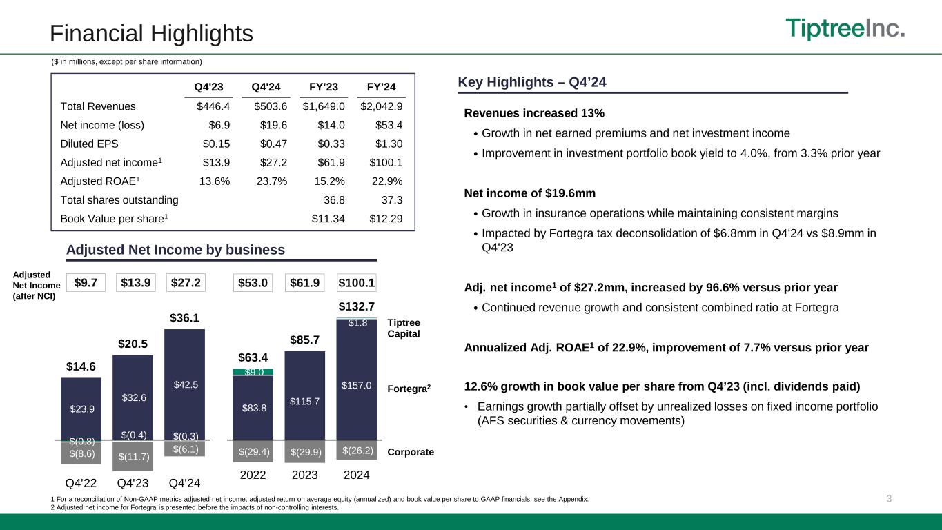 2 2024 Highlights Revenue $2.043 billion 23.9% vs. prior year Adjusted Net Income1 $100.1 million 61.6% vs. prior year Book Value per share1,3 $12.29 12.6% vs. 12/31/23 Net Income $53.4 million vs. prior year net income of $14.0 million Overall  Revenues of $2.043bn, an increase of 23.9% from 2023, driven by growth at Fortegra.  Net income of $53mm.  Adj. net income1 of $100mm, and 22.9% annualized adj. ROAE1, driven by growth in insurance operations. Insurance  $3.1bn of gross written premiums and premium equivalents (GWPPE), 12% increase from prior year, driven primarily by specialty E&S insurance lines.  Net written premiums of $1.4bn, 9% increase from 2023, driven by organic growth.  Combined ratio of 90.0%, improved 0.3% from consistent underwriting performance and operating scale.  Adj. net income1,2 of $157mm, up 36% from prior year driven by revenue growth and improved combined ratio.  Annualized Adj. ROAE1,2 of 29%, flat to prior year.  $40mm investment in Fortegra in March and April 2024 (existing shareholders) to support continued growth. Tiptree Capital  Pre-tax income of $4.6mm driven by improved performance in our mortgage business. ($ in millions, except per share information) 1 For a reconciliation of Non-GAAP metrics adjusted net income, adjusted return on average equity and book value per share to GAAP financials, see the Appendix. 2 Adjusted net income and adjusted return on average equity for insurance is presented before the impacts of non-controlling interests. 3 Annual total return defined as cumulative dividends paid of $0.49 per share plus change in book value per share as of December 31, 2024.
