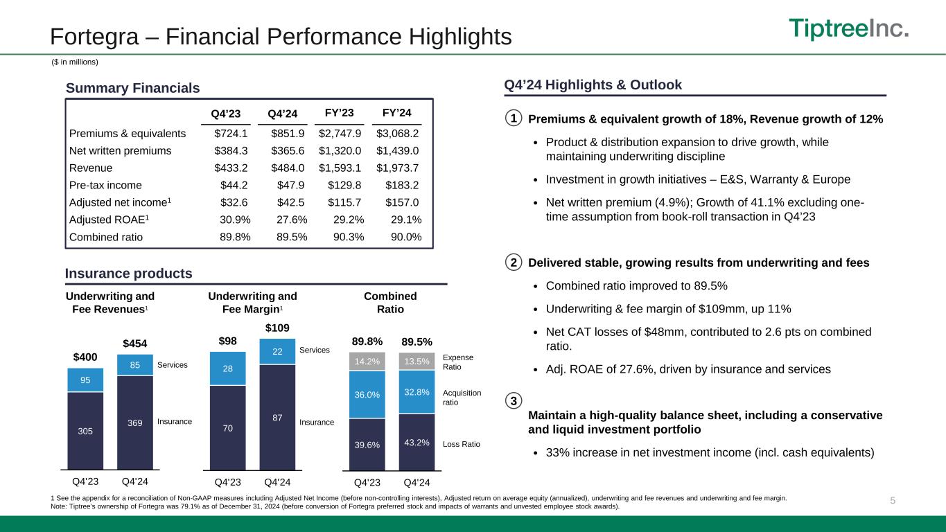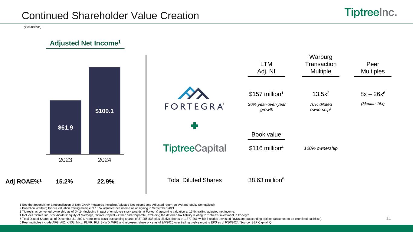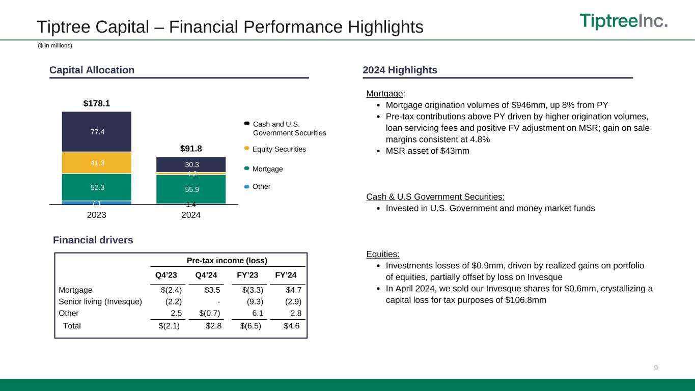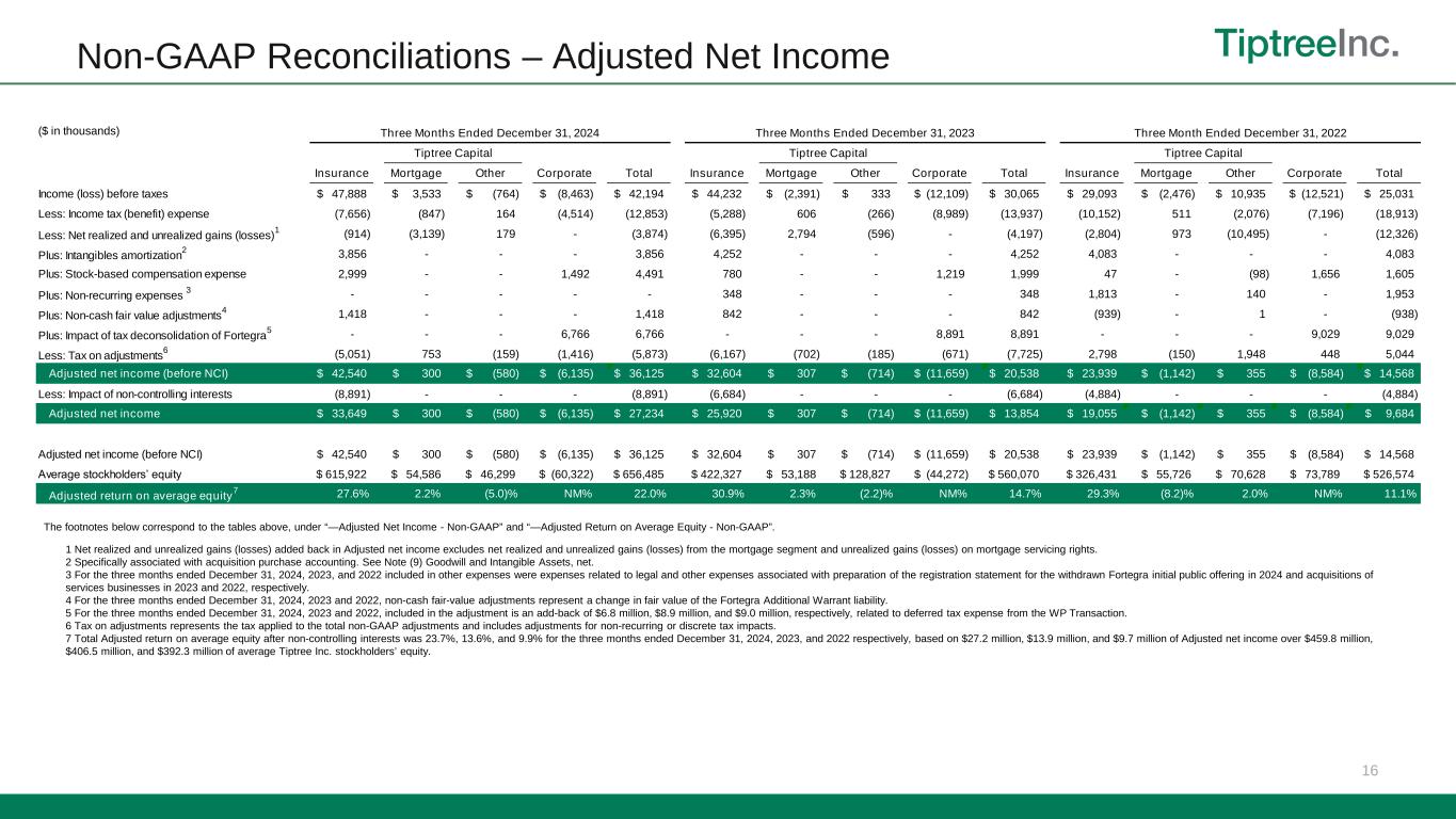 17 Non-GAAP Reconciliations – Adjusted Net Income The footnotes below correspond to the tables above, under “—Adjusted Net Income - Non-GAAP” and “—Adjusted Return on Average Equity - Non-GAAP”. 1 Net realized and unrealized gains (losses) added back in Adjusted net income excludes net realized and unrealized gains (losses) from the mortgage segment and unrealized gains (losses) on mortgage servicing rights. 2 Specifically associated with acquisition purchase accounting. See Note (9) Goodwill and Intangible Assets, net. 3 For the years ended December 31, 2024, 2023, and 2022 included in other expenses were expenses related to legal and other expenses associated with preparation of the registration statement for the withdrawn Fortegra initial public offering in 2024 and acquisitions of services businesses in 2023 and 2022, respectively. 4 For the years ended December 31, 2024, 2023 and 2022, non-cash fair-value adjustments represent a change in fair value of the Fortegra Additional Warrant liability. 5 For the years ended December 31, 2024, 2023 and 2022, included in the adjustment is an add-back of $23.5 million, $19.1 million, and $31.6 million, respectively, related to deferred tax expense from the WP Transaction. 6 Tax on adjustments represents the tax applied to the total non-GAAP adjustments and includes adjustments for non-recurring or discrete tax impacts. 7 Total Adjusted return on average equity after non-controlling interests was 22.9%, 15.2%, and 13.6% for the years ended December 31, 2024, 2023, and 2022 respectively, based on $100.1 million, $61.9 million, and $53.0 million of Adjusted net income over $437.3 million, $407.1 million, and $390.2 million of average Tiptree Inc. stockholders’ equity. ($ in thousands) Insurance Mortgage Other Corporate Total Insurance Mortgage Other Corporate Total Insurance Mortgage Other Corporate Total Income (loss) before taxes 183,158$ 4,725$ (163)$ (38,401)$ 149,319$ 129,816$ (3,285)$ (3,264)$ (40,214)$ 83,053$ 68,150$ 874$ 31,403$ (46,416)$ 54,011$ Less: Income tax (benefit) expense (43,260) (1,091) (540) (16,761) (61,652) (28,224) 837 153 (15,822) (43,056) (21,251) (363) (5,545) (23,291) (50,450) Less: Net realized and unrealized gains (losses) 1 (8,496) (2,711) 905 - (10,302) 4,207 1,861 5,289 - 11,357 20,347 (7,003) (18,788) - (5,444) Plus: Intangibles amortization 2 15,413 - - - 15,413 16,919 - - - 16,919 16,229 - - - 16,229 Plus: Stock-based compensation expense 8,998 - - 8,682 17,680 2,018 - - 6,251 8,269 2,423 - - 7,093 9,516 Plus: Non-recurring expenses 3 3,455 - - - 3,455 2,824 - - - 2,824 3,374 - (729) 2,108 4,753 Plus: Non-cash fair value adjustments 4 7,436 - - - 7,436 (1,769) - - - (1,769) (939) - 3,555 - 2,616 Plus: Impact of tax deconsolidation of Fortegra 5 - - - 23,495 23,495 - - - 19,101 19,101 1,560 - - 31,573 33,133 Less: Tax on adjustments 6 (9,673) 608 87 (3,168) (12,146) (10,086) (495) (1,255) 797 (11,039) (6,061) 1,834 3,731 (467) (963) Adjusted net income (before NCI) 157,031$ 1,531$ 289$ (26,153)$ 132,698$ 115,705$ (1,082)$ 923$ (29,887)$ 85,659$ 83,832$ (4,658)$ 13,627$ (29,400)$ 63,401$ Less: Impact of non-controlling interests (32,638) - - - (32,638) (23,742) - - - (23,742) (10,367) - - - (10,367) Adjusted net income 124,393$ 1,531$ 289$ (26,153)$ 100,060$ 91,963$ (1,082)$ 923$ (29,887)$ 61,917$ 73,465$ (4,658)$ 13,627$ (29,400)$ 53,034$ Adjusted net income (before NCI) 157,031$ 1,531$ 289$ (26,153)$ 132,698$ 115,705$ (1,082)$ 923$ (29,887)$ 85,659$ 83,832$ (4,658)$ 13,627$ (29,400)$ 63,401$ Average stockholders’ equity 539,049$ 54,113$ 80,857$ (57,350)$ 616,669$ 395,661$ 53,520$ 100,325$ 5,564$ 555,070$ 321,320$ 57,575$ 98,373$ (10,390)$ 466,878$ Adjusted return on average equity 7 29.1% 2.8% 0.4% NM% 21.5% 29.2% (2.0)% 0.9% NM% 15.4% 26.1% (8.1)% 13.9% NM% 13.6% Tiptree Capital Tiptree Capital Tiptree Capital Year ended December 31, 2024 Year ended December 31, 2023 Year ended December 31, 2022