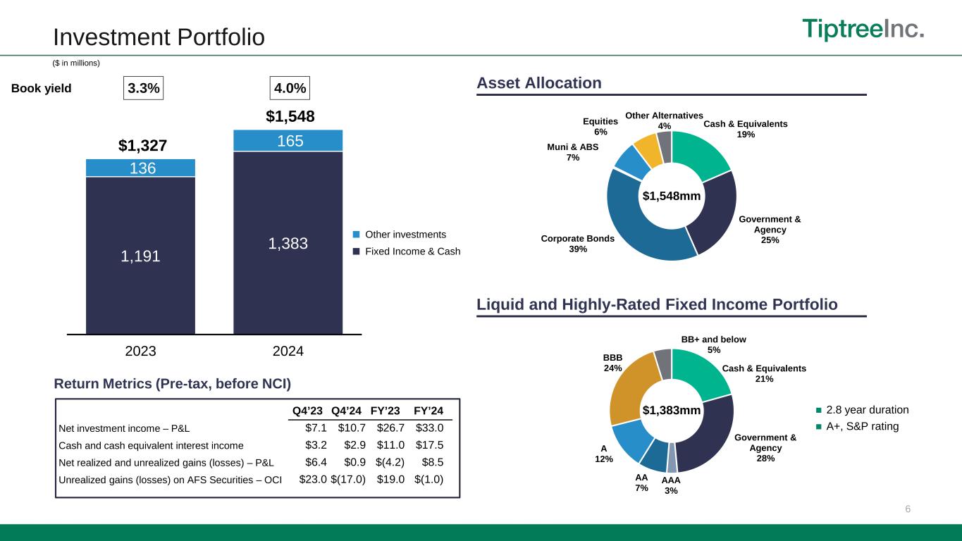 5 Fortegra – Financial Performance Highlights Premiums & equivalent growth of 18%, Revenue growth of 12% • Product & distribution expansion to drive growth, while maintaining underwriting discipline • Investment in growth initiatives – E&S, Warranty & Europe • Net written premium (4.9%); Growth of 41.1% excluding one- time assumption from book-roll transaction in Q4’23 Delivered stable, growing results from underwriting and fees • Combined ratio improved to 89.5% • Underwriting & fee margin of $109mm, up 11% • Net CAT losses of $48mm, contributed to 2.6 pts on combined ratio. • Adj. ROAE of 27.6%, driven by insurance and services Maintain a high-quality balance sheet, including a conservative and liquid investment portfolio • 33% increase in net investment income (incl. cash equivalents) Underwriting and Fee Margin1 Underwriting and Fee Revenues1 Combined Ratio 1 2 3 Summary Financials Insurance products Q4’24 Highlights & Outlook ($ in millions) Expense Ratio Loss Ratio Services Insurance 1 See the appendix for a reconciliation of Non-GAAP measures including Adjusted Net Income (before non-controlling interests), Adjusted return on average equity (annualized), underwriting and fee revenues and underwriting and fee margin. Note: Tiptree’s ownership of Fortegra was 79.1% as of December 31, 2024 (before conversion of Fortegra preferred stock and impacts of warrants and unvested employee stock awards). Services Insurance 305 369 95 85 $400 $454 Q4'23 Q4'24 70 87 28 22 $98 $109 Q4'23 Q4'24 39.6% 43.2% 36.0% 32.8% 14.2% 13.5% 89.8% 89.5% Q4'23 Q4'24 Acquisition ratio Q4’23 Q4’24 FY’23 FY’24 Premiums & equivalents $724.1 $851.9 $2,747.9 $3,068.2 Net written premiums $384.3 $365.6 $1,320.0 $1,439.0 Revenue $433.2 $484.0 $1,593.1 $1,973.7 Pre-tax income $44.2 $47.9 $129.8 $183.2 Adjusted net income1 $32.6 $42.5 $115.7 $157.0 Adjusted ROAE1 30.9% 27.6% 29.2% 29.1% Combined ratio 89.8% 89.5% 90.3% 90.0%