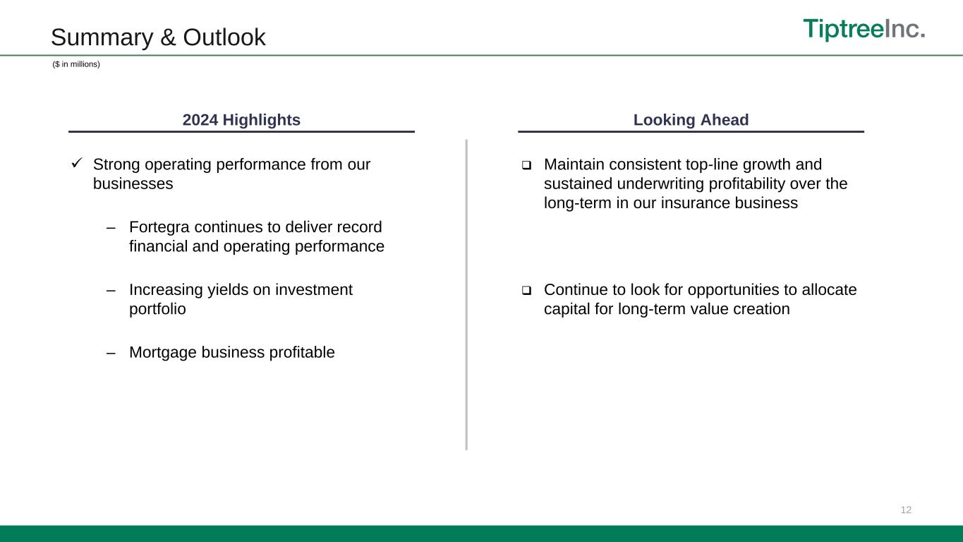 Continued Shareholder Value Creation 11 ($ in millions) Adjusted Net Income1 Adj ROAE%1 15.2% 22.9% $61.9 $100.1 2023 2024 $157 million1 $116 million4 8x – 26x6 (Median 15x) Peer Multiples LTM Adj. NI Warburg Transaction Multiple Total Diluted Shares 38.63 million5 13.5x2 1 See the appendix for a reconciliation of Non-GAAP measures including Adjusted Net Income and Adjusted return on average equity (annualized). 2 Based on Warburg Pincus valuation trailing multiple of 13.5x adjusted net income as of signing in September 2021. 3 Tiptree’s as converted ownership as of Q4’24 (including impact of employee stock awards at Fortegra) assuming valuation at 13.5x trailing adjusted net income. 4 Includes Tiptree Inc. stockholders’ equity of Mortgage, Tiptree Capital – Other and Corporate, excluding the deferred tax liability relating to Tiptree’s investment in Fortegra. 5 Total Diluted Shares as of December 31, 2024, represents basic outstanding shares of 37,255,838 plus dilutive shares of 1,377,261 which includes unvested RSUs and outstanding options (assumed to be exercised cashless). 6 Peer multiples include AFG, AIZ, KNSL, MKL, PLMR, RLI, SKWD, WRB and represent share price as of 2/5/2025 over trailing twelve months EPS as of 9/30/2024. Source: S&P Capital IQ. 70% diluted ownership3 100% ownership Book value 36% year-over-year growth