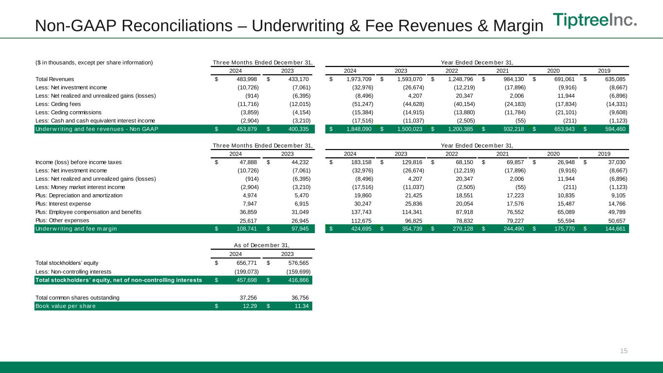 Non-GAAP Reconciliations 14 Adjusted Net Income We define adjusted net income as income before taxes, less provision (benefit) for income taxes, and excluding the after-tax impact of various expenses that we consider to be unique and non-recurring in nature, including merger and acquisition related expenses, stock-based compensation, net realized and unrealized gains (losses) and intangibles amortization associated with purchase accounting, all of which is reduced for non- controlling interests. The calculation of adjusted net income excludes net realized and unrealized gains (losses) that relate to investments or assets rather than business operations. Adjusted net income should not be viewed as a substitute for income before taxes calculated in accordance with GAAP, and other companies may define adjusted net income differently. Adjusted net income (before NCI) is presented before the impacts of non-controlling interests. We present adjustments for amortization associated with acquired intangible assets. The intangible assets were recorded as part of purchase accounting in connection with Tiptree’s acquisition of Fortegra Financial in 2014, Defend in 2019, and Smart AutoCare and Sky Auto in 2020, ITC in 2022 and Premia in 2023. The intangible assets acquired contribute to overall revenue generation, and the respective purchase accounting adjustments will continue to occur in future periods until such intangible assets are fully amortized in accordance with the respective amortization periods required by GAAP. We define adjusted return on average equity as adjusted net income expressed on an annualized basis as a percentage of average beginning and ending stockholder’s equity during the period. We use adjusted return on average equity as an internal performance measure in the management of our operations because we believe it gives our management and other users of our financial information useful insight into our results of operations and our underlying business performance. Adjusted return on average equity should not be viewed as a substitute for return on average equity calculated in accordance with GAAP, and other companies may define adjusted return on average equity differently. Book value per share Management believes the use of book value per share provides supplemental information useful to investors as it is frequently used by the financial community to analyze company growth on a relative per share basis. Insurance – Underwriting and Fee Revenues We generally manage our exposure to the underwriting risk we assume using both reinsurance (e.g., quota share and excess of loss) and retrospective commission agreements with our partners (e.g., commissions paid are adjusted based on the actual underlying losses incurred), which mitigate our risk. Period-over-period comparisons of revenues and expenses are often impacted by the Producer Owned Reinsurance Company (PORCs) and distribution partners’ choice as to whether to retain risk, specifically service and administration fees and ceding commissions, both components of revenue, and policy and contract benefits and commissions paid to our partners and reinsurers. Generally, when losses are incurred, the risk which is retained by our partners and reinsurers is reflected in a reduction in commissions paid. In order to better explain to investors the underwriting performance of the Company’s programs and the respective retentions between the Company and its agents and reinsurance partners, we use non-GAAP metrics of underwriting and fee revenues and underwriting and fee margin. We define underwriting and fee revenues as total revenues excluding net investment income, net realized gains (losses) and net unrealized gains (losses), ceding fees, ceding commissions and cash and cash equivalent interest income as reported in other income. Underwriting and fee revenues represents revenues generated by our underwriting and fee-based operations and allows us to evaluate our underwriting performance without regard to investment income. We use this metric as we believe it gives our management and other users of our financial information useful insight into our underlying business performance. Underwriting and fee revenues should not be viewed as a substitute for total revenues calculated in accordance with GAAP, and other companies may define underwriting and fee revenues differently. Insurance - Underwriting and Fee Margin We define underwriting and fee margin as income before taxes, excluding net investment income, net realized gains (losses), net unrealized gains (losses), cash and cash equivalent interest income, employee compensation and benefits, other expenses, interest expense and depreciation and amortization. Underwriting and fee margin represents the underwriting performance of our underwriting and fee-based programs. As such, underwriting and fee margin excludes general administrative expenses, interest expense, depreciation and amortization and other corporate expenses as those expenses support the vertically integrated business model and not any individual component of our business mix. We use this metric as we believe it gives our management and other users of our financial information useful insight into the specific performance of our underlying underwriting and fee programs. Underwriting and fee income should not be viewed as a substitute for income before taxes calculated in accordance with GAAP, and other companies may define underwriting and fee margin differently.