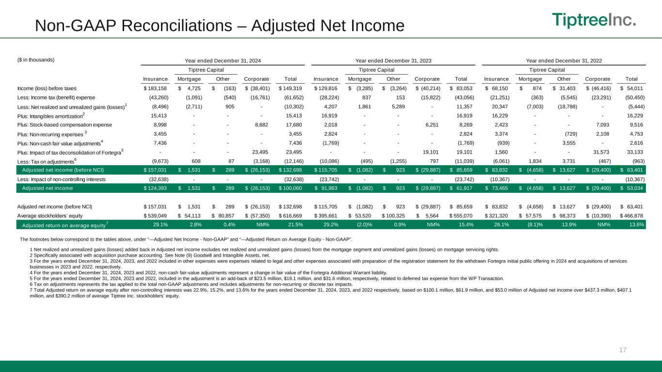 16 Non-GAAP Reconciliations – Adjusted Net Income The footnotes below correspond to the tables above, under “—Adjusted Net Income - Non-GAAP” and “—Adjusted Return on Average Equity - Non-GAAP”. 1 Net realized and unrealized gains (losses) added back in Adjusted net income excludes net realized and unrealized gains (losses) from the mortgage segment and unrealized gains (losses) on mortgage servicing rights. 2 Specifically associated with acquisition purchase accounting. See Note (9) Goodwill and Intangible Assets, net. 3 For the three months ended December 31, 2024, 2023, and 2022 included in other expenses were expenses related to legal and other expenses associated with preparation of the registration statement for the withdrawn Fortegra initial public offering in 2024 and acquisitions of services businesses in 2023 and 2022, respectively. 4 For the three months ended December 31, 2024, 2023 and 2022, non-cash fair-value adjustments represent a change in fair value of the Fortegra Additional Warrant liability. 5 For the three months ended December 31, 2024, 2023 and 2022, included in the adjustment is an add-back of $6.8 million, $8.9 million, and $9.0 million, respectively, related to deferred tax expense from the WP Transaction. 6 Tax on adjustments represents the tax applied to the total non-GAAP adjustments and includes adjustments for non-recurring or discrete tax impacts. 7 Total Adjusted return on average equity after non-controlling interests was 23.7%, 13.6%, and 9.9% for the three months ended December 31, 2024, 2023, and 2022 respectively, based on $27.2 million, $13.9 million, and $9.7 million of Adjusted net income over $459.8 million, $406.5 million, and $392.3 million of average Tiptree Inc. stockholders’ equity. ($ in thousands) Insurance Mortgage Other Corporate Total Insurance Mortgage Other Corporate Total Insurance Mortgage Other Corporate Total Income (loss) before taxes 47,888$ 3,533$ (764)$ (8,463)$ 42,194$ 44,232$ (2,391)$ 333$ (12,109)$ 30,065$ 29,093$ (2,476)$ 10,935$ (12,521)$ 25,031$ Less: Income tax (benefit) expense (7,656) (847) 164 (4,514) (12,853) (5,288) 606 (266) (8,989) (13,937) (10,152) 511 (2,076) (7,196) (18,913) Less: Net realized and unrealized gains (losses) 1 (914) (3,139) 179 - (3,874) (6,395) 2,794 (596) - (4,197) (2,804) 973 (10,495) - (12,326) Plus: Intangibles amortization 2 3,856 - - - 3,856 4,252 - - - 4,252 4,083 - - - 4,083 Plus: Stock-based compensation expense 2,999 - - 1,492 4,491 780 - - 1,219 1,999 47 - (98) 1,656 1,605 Plus: Non-recurring expenses 3 - - - - - 348 - - - 348 1,813 - 140 - 1,953 Plus: Non-cash fair value adjustments 4 1,418 - - - 1,418 842 - - - 842 (939) - 1 - (938) Plus: Impact of tax deconsolidation of Fortegra 5 - - - 6,766 6,766 - - - 8,891 8,891 - - - 9,029 9,029 Less: Tax on adjustments 6 (5,051) 753 (159) (1,416) (5,873) (6,167) (702) (185) (671) (7,725) 2,798 (150) 1,948 448 5,044 Adjusted net income (before NCI) 42,540$ 300$ (580)$ (6,135)$ 36,125$ 32,604$ 307$ (714)$ (11,659)$ 20,538$ 23,939$ (1,142)$ 355$ (8,584)$ 14,568$ Less: Impact of non-controlling interests (8,891) - - - (8,891) (6,684) - - - (6,684) (4,884) - - - (4,884) Adjusted net income 33,649$ 300$ (580)$ (6,135)$ 27,234$ 25,920$ 307$ (714)$ (11,659)$ 13,854$ 19,055$ (1,142)$ 355$ (8,584)$ 9,684$ Adjusted net income (before NCI) 42,540$ 300$ (580)$ (6,135)$ 36,125$ 32,604$ 307$ (714)$ (11,659)$ 20,538$ 23,939$ (1,142)$ 355$ (8,584)$ 14,568$ Average stockholders’ equity 615,922$ 54,586$ 46,299$ (60,322)$ 656,485$ 422,327$ 53,188$ 128,827$ (44,272)$ 560,070$ 326,431$ 55,726$ 70,628$ 73,789$ 526,574$ Adjusted return on average equity 7 27.6% 2.2% (5.0)% NM% 22.0% 30.9% 2.3% (2.2)% NM% 14.7% 29.3% (8.2)% 2.0% NM% 11.1% Three Month Ended December 31, 2022 Tiptree CapitalTiptree Capital Three Months Ended December 31, 2024 Tiptree Capital Three Months Ended December 31, 2023