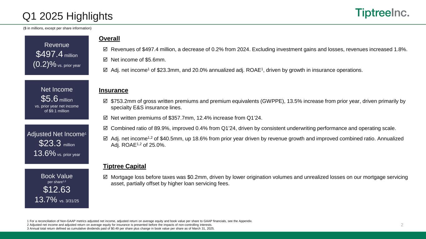 1 Disclaimers LIMITATIONS ON THE USE OF INFORMATION This presentation has been prepared by Tiptree Inc. and its consolidated subsidiaries (“Tiptree", "the Company" or "we”) solely for informational purposes, and not for the purpose of updating any information or forecast with respect to Tiptree, its subsidiaries or any of its affiliates or any other purpose. Tiptree reports a non-controlling interest in certain operating subsidiaries that are not wholly owned. Unless otherwise noted, all information is of Tiptree on a consolidated basis before non-controlling interest. Neither Tiptree nor any of its affiliates makes any representation or warranty, express or implied, as to the accuracy or completeness of the information contained herein and no such party shall have any liability for such information. These materials and any related oral statements are not all-inclusive and shall not be construed as legal, tax, investment or any other advice. You should consult your own counsel, accountant or business advisors. Performance information is historical and is not indicative of, nor does it guarantee future results. There can be no assurance that similar performance may be experienced in the future. SPECIAL NOTE REGARDING FORWARD-LOOKING STATEMENTS This document contains "forward-looking statements" which involve risks, uncertainties and contingencies, many of which are beyond Tiptree's control, which may cause actual results, performance, or achievements to differ materially from anticipated results, performance, or achievements. All statements contained herein that are not clearly historical in nature are forward-looking, and the words "anticipate," "believe," "estimate," "expect,“ “intend,” “may,” “might,” "plan," “project,” “should,” "target,“ “will,” "view," “confident,” or similar expressions are intended to identify forward-looking statements. Such forward-looking statements include, but are not limited to, statements about Tiptree's plans, objectives, expectations and intentions. The forward-looking statements are not guarantees of future performance and are subject to risks, uncertainties and other factors, many of which are beyond our control, are difficult to predict and could cause actual results to differ materially from those expressed or forecast in the forward-looking statements. Our actual results could differ materially from those anticipated in these forward-looking statements as a result of various factors, including, but not limited to those described in the section entitled “Risk Factors” in Tiptree’s Annual Report on Form 10-K, and as described in the Tiptree’s other filings with the SEC. Readers are cautioned not to place undue reliance on these forward-looking statements, which speak only as to the date of this release. The factors described therein are not necessarily all of the important factors that could cause actual results or developments to differ materially from those expressed in any of our forward-looking statements. Other unknown or unpredictable factors also could affect our forward-looking statements. Consequently, our actual performance could be materially different from the results described or anticipated by our forward-looking statements. Given these uncertainties, you should not place undue reliance on these forward-looking statements. Except as required by the federal securities laws, we undertake no obligation to update any forward- looking statements. MARKET AND INDUSTRY DATA Certain market data and industry data used in this presentation were obtained from reports of governmental agencies and industry publications and surveys. We believe the data from third-party sources to be reliable based upon our management’s knowledge of the industry, but have not independently verified such data and as such, make no guarantees as to its accuracy, completeness or timeliness. NOT AN OFFER OR A SOLICIATION This document does not constitute an offer or invitation for the sale or purchase of securities or to engage in any other transaction with Tiptree, its subsidiaries or its affiliates. The information in this document is not targeted at the residents of any particular country or jurisdiction and is not intended for distribution to, or use by, any person in any jurisdiction or country where such distribution or use would be contrary to local law or regulation. NON-GAAP MEASURES In this document, we sometimes use financial measures derived from consolidated financial data but not presented in our financial statements prepared in accordance with U.S. generally accepted accounting principles ("GAAP"). Certain of these data are considered “non-GAAP financial measures” under the SEC rules. These non-GAAP financial measures supplement our GAAP disclosures and should not be considered an alternative to the GAAP measure. Management's reasons for using these non-GAAP financial measures and the reconciliations to their most directly comparable GAAP financial measures are posted in the Appendix.