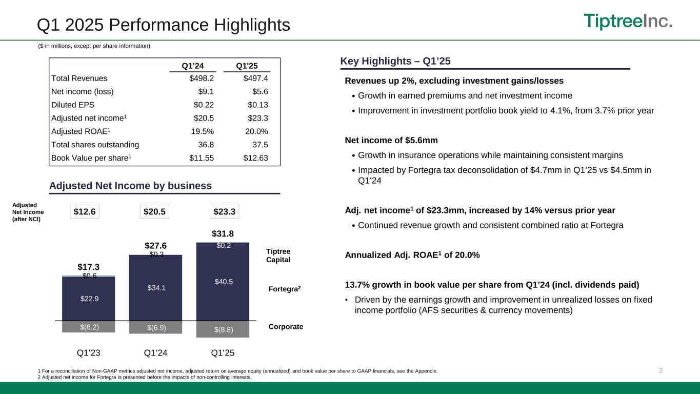 2 Q1 2025 Highlights Revenue $497.4 million (0.2)% vs. prior year Adjusted Net Income1 $23.3 million 13.6% vs. prior year Book Value per share1,3 $12.63 13.7% vs. 3/31/25 Net Income $5.6 million vs. prior year net income of $9.1 million Overall  Revenues of $497.4 million, a decrease of 0.2% from 2024. Excluding investment gains and losses, revenues increased 1.8%.  Net income of $5.6mm.  Adj. net income1 of $23.3mm, and 20.0% annualized adj. ROAE1, driven by growth in insurance operations. Insurance  $753.2mm of gross written premiums and premium equivalents (GWPPE), 13.5% increase from prior year, driven primarily by specialty E&S insurance lines.  Net written premiums of $357.7mm, 12.4% increase from Q1’24.  Combined ratio of 89.9%, improved 0.4% from Q1’24, driven by consistent underwriting performance and operating scale.  Adj. net income1,2 of $40.5mm, up 18.6% from prior year driven by revenue growth and improved combined ratio. Annualized Adj. ROAE1,2 of 25.0%. Tiptree Capital  Mortgage loss before taxes was $0.2mm, driven by lower origination volumes and unrealized losses on our mortgage servicing asset, partially offset by higher loan servicing fees. ($ in millions, except per share information) 1 For a reconciliation of Non-GAAP metrics adjusted net income, adjusted return on average equity and book value per share to GAAP financials, see the Appendix. 2 Adjusted net income and adjusted return on average equity for insurance is presented before the impacts of non-controlling interests. 3 Annual total return defined as cumulative dividends paid of $0.49 per share plus change in book value per share as of March 31, 2025.