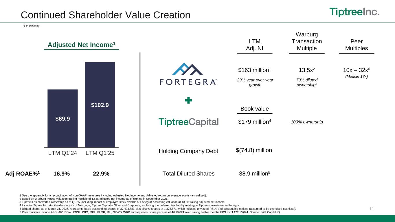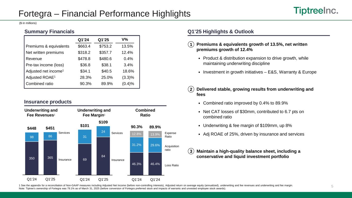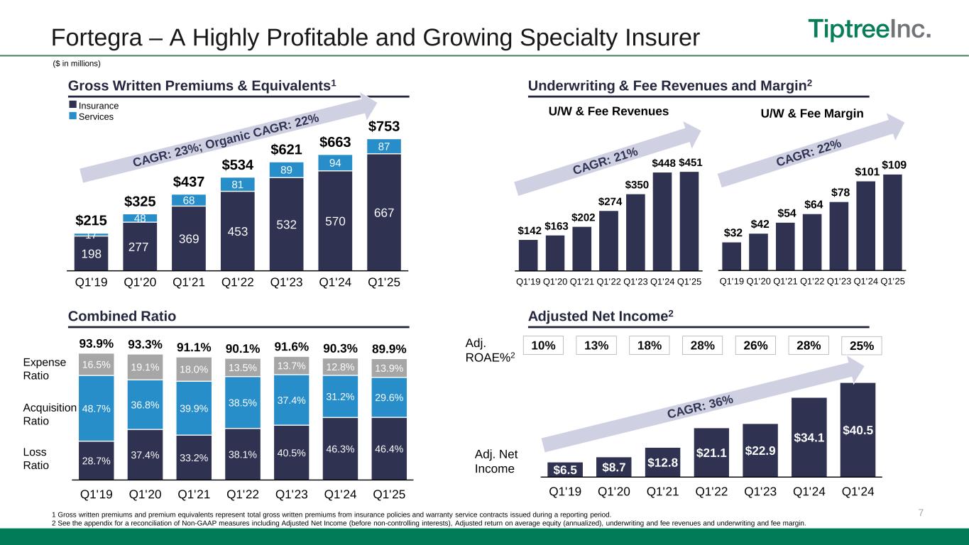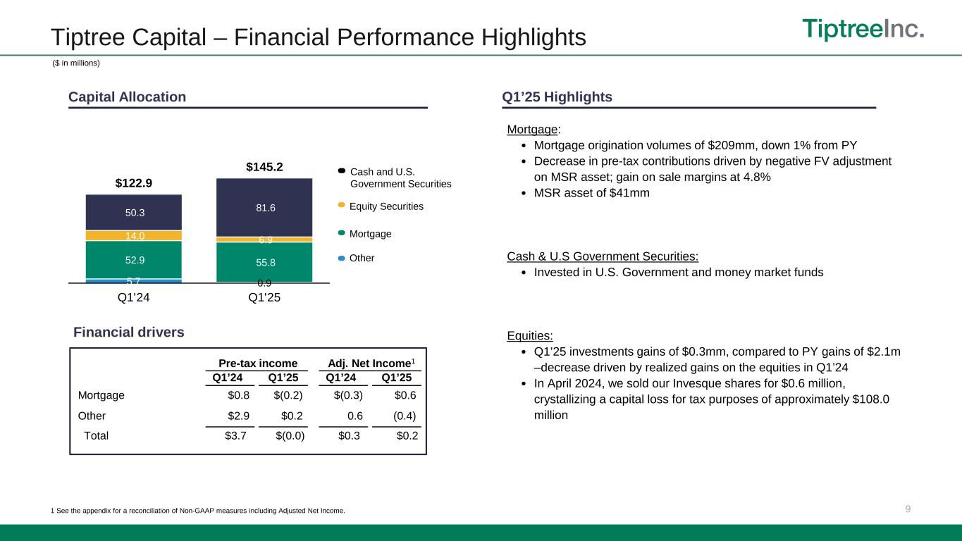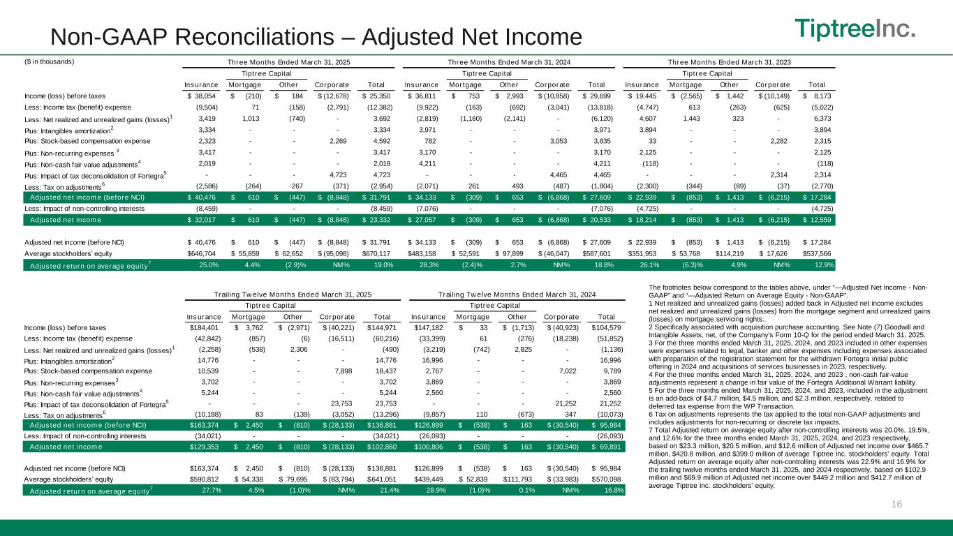 16 Non-GAAP Reconciliations – Adjusted Net Income The footnotes below correspond to the tables above, under “—Adjusted Net Income - Non- GAAP” and “—Adjusted Return on Average Equity - Non-GAAP”. 1 Net realized and unrealized gains (losses) added back in Adjusted net income excludes net realized and unrealized gains (losses) from the mortgage segment and unrealized gains (losses) on mortgage servicing rights.. 2 Specifically associated with acquisition purchase accounting. See Note (7) Goodwill and Intangible Assets, net, of the Company’s Form 10-Q for the period ended March 31, 2025. 3 For the three months ended March 31, 2025, 2024, and 2023 included in other expenses were expenses related to legal, banker and other expenses including expenses associated with preparation of the registration statement for the withdrawn Fortegra initial public offering in 2024 and acquisitions of services businesses in 2023, respectively. 4 For the three months ended March 31, 2025, 2024, and 2023 , non-cash fair-value adjustments represent a change in fair value of the Fortegra Additional Warrant liability. 5 For the three months ended March 31, 2025, 2024, and 2023, included in the adjustment is an add-back of $4.7 million, $4.5 million, and $2.3 million, respectively, related to deferred tax expense from the WP Transaction. 6 Tax on adjustments represents the tax applied to the total non-GAAP adjustments and includes adjustments for non-recurring or discrete tax impacts. 7 Total Adjusted return on average equity after non-controlling interests was 20.0%, 19.5%, and 12.6% for the three months ended March 31, 2025, 2024, and 2023 respectively, based on $23.3 million, $20.5 million, and $12.6 million of Adjusted net income over $465.7 million, $420.8 million, and $399.0 million of average Tiptree Inc. stockholders’ equity. Total Adjusted return on average equity after non-controlling interests was 22.9% and 16.9% for the trailing twelve months ended March 31, 2025, and 2024 respectively, based on $102.9 million and $69.9 million of Adjusted net income over $449.2 million and $412.7 million of average Tiptree Inc. stockholders’ equity. ($ in thousands) Insurance Mortgage Other Corporate Total Insurance Mortgage Other Corporate Total Insurance Mortgage Other Corporate Total Income (loss) before taxes 38,054$ (210)$ 184$ (12,678)$ 25,350$ 36,811$ 753$ 2,993$ (10,858)$ 29,699$ 19,445$ (2,565)$ 1,442$ (10,149)$ 8,173$ Less: Income tax (benefit) expense (9,504) 71 (158) (2,791) (12,382) (9,922) (163) (692) (3,041) (13,818) (4,747) 613 (263) (625) (5,022) Less: Net realized and unrealized gains (losses) 1 3,419 1,013 (740) - 3,692 (2,819) (1,160) (2,141) - (6,120) 4,607 1,443 323 - 6,373 Plus: Intangibles amortization 2 3,334 - - - 3,334 3,971 - - - 3,971 3,894 - - - 3,894 Plus: Stock-based compensation expense 2,323 - - 2,269 4,592 782 - - 3,053 3,835 33 - - 2,282 2,315 Plus: Non-recurring expenses 3 3,417 - - - 3,417 3,170 - - - 3,170 2,125 - - - 2,125 Plus: Non-cash fair value adjustments 4 2,019 - - - 2,019 4,211 - - - 4,211 (118) - - - (118) Plus: Impact of tax deconsolidation of Fortegra 5 - - - 4,723 4,723 - - - 4,465 4,465 - - - 2,314 2,314 Less: Tax on adjustments 6 (2,586) (264) 267 (371) (2,954) (2,071) 261 493 (487) (1,804) (2,300) (344) (89) (37) (2,770) Adjusted net income (before NCI) 40,476$ 610$ (447)$ (8,848)$ 31,791$ 34,133$ (309)$ 653$ (6,868)$ 27,609$ 22,939$ (853)$ 1,413$ (6,215)$ 17,284$ Less: Impact of non-controlling interests (8,459) - - - (8,459) (7,076) - - - (7,076) (4,725) - - - (4,725) Adjusted net income 32,017$ 610$ (447)$ (8,848)$ 23,332$ 27,057$ (309)$ 653$ (6,868)$ 20,533$ 18,214$ (853)$ 1,413$ (6,215)$ 12,559$ Adjusted net income (before NCI) 40,476$ 610$ (447)$ (8,848)$ 31,791$ 34,133$ (309)$ 653$ (6,868)$ 27,609$ 22,939$ (853)$ 1,413$ (6,215)$ 17,284$ Average stockholders’ equity 646,704$ 55,859$ 62,652$ (95,098)$ 670,117$ 483,158$ 52,591$ 97,899$ (46,047)$ 587,601$ 351,953$ 53,768$ 114,219$ 17,626$ 537,566$ Adjusted return on average equity 7 25.0% 4.4% (2.9)% NM% 19.0% 28.3% (2.4)% 2.7% NM% 18.8% 26.1% (6.3)% 4.9% NM% 12.9% Three Months Ended March 31, 2023 Tiptree CapitalTiptree Capital Three Months Ended March 31, 2025 Tiptree Capital Three Months Ended March 31, 2024 Insurance Mortgage Other Corporate Total Insurance Mortgage Other Corporate Total Income (loss) before taxes 184,401$ 3,762$ (2,971)$ (40,221)$ 144,971$ 147,182$ 33$ (1,713)$ (40,923)$ 104,579$ Less: Income tax (benefit) expense (42,842) (857) (6) (16,511) (60,216) (33,399) 61 (276) (18,238) (51,852) Less: Net realized and unrealized gains (losses) 1 (2,258) (538) 2,306 - (490) (3,219) (742) 2,825 - (1,136) Plus: Intangibles amortization 2 14,776 - - - 14,776 16,996 - - - 16,996 Plus: Stock-based compensation expense 10,539 - - 7,898 18,437 2,767 - - 7,022 9,789 Plus: Non-recurring expenses 3 3,702 - - - 3,702 3,869 - - - 3,869 Plus: Non-cash fair value adjustments 4 5,244 - - - 5,244 2,560 - - - 2,560 Plus: Impact of tax deconsolidation of Fortegra 5 - - - 23,753 23,753 - - - 21,252 21,252 Less: Tax on adjustments 6 (10,188) 83 (139) (3,052) (13,296) (9,857) 110 (673) 347 (10,073) Adjusted net income (before NCI) 163,374$ 2,450$ (810)$ (28,133)$ 136,881$ 126,899$ (538)$ 163$ (30,540)$ 95,984$ Less: Impact of non-controlling interests (34,021) - - - (34,021) (26,093) - - - (26,093) Adjusted net income 129,353$ 2,450$ (810)$ (28,133)$ 102,860$ 100,806$ (538)$ 163$ (30,540)$ 69,891$ Adjusted net income (before NCI) 163,374$ 2,450$ (810)$ (28,133)$ 136,881$ 126,899$ (538)$ 163$ (30,540)$ 95,984$ Average stockholders’ equity 590,812$ 54,338$ 79,695$ (83,794)$ 641,051$ 439,449$ 52,839$ 111,793$ (33,983)$ 570,098$ Adjusted return on average equity 7 27.7% 4.5% (1.0)% NM% 21.4% 28.9% (1.0)% 0.1% NM% 16.8% Tiptree Capital Tiptree Capital Trailing Twelve Months Ended March 31, 2025 Trailing Twelve Months Ended March 31, 2024