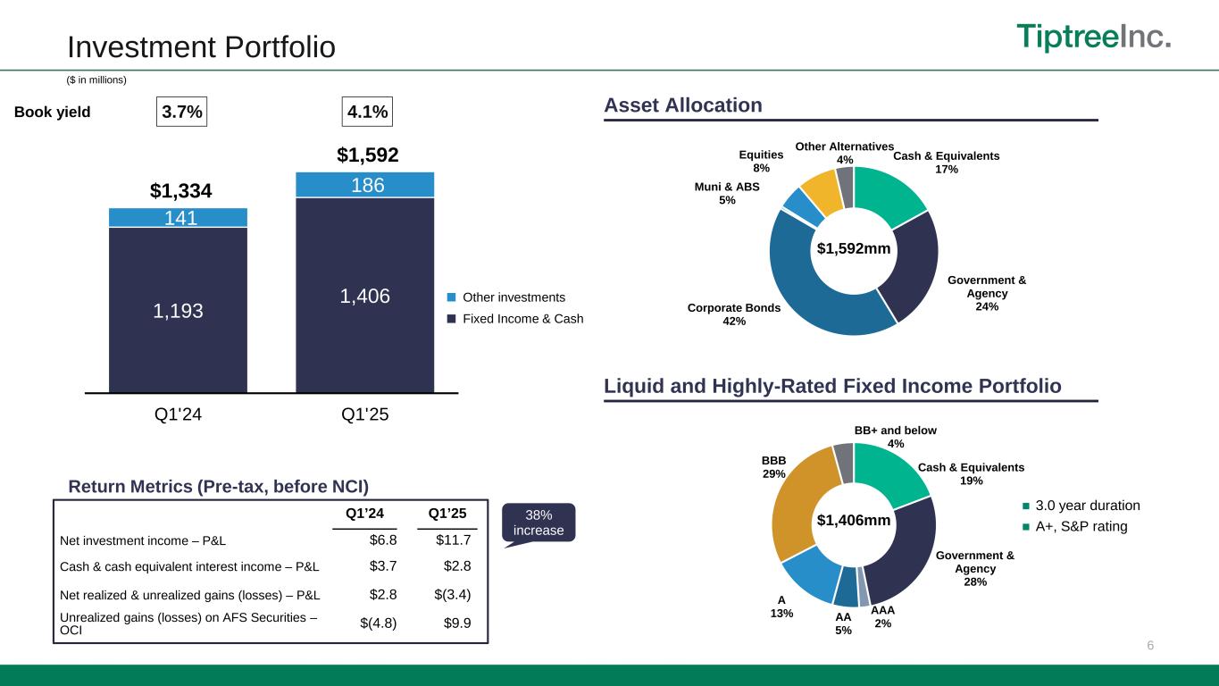 5 Fortegra – Financial Performance Highlights Premiums & equivalents growth of 13.5%, net written premiums growth of 12.4% • Product & distribution expansion to drive growth, while maintaining underwriting discipline • Investment in growth initiatives – E&S, Warranty & Europe Delivered stable, growing results from underwriting and fees • Combined ratio improved by 0.4% to 89.9% • Net CAT losses of $30mm, contributed to 6.7 pts on combined ratio • Underwriting & fee margin of $109mm, up 8% • Adj ROAE of 25%, driven by insurance and services Maintain a high-quality balance sheet, including a conservative and liquid investment portfolio Underwriting and Fee Margin1 Underwriting and Fee Revenues1 Combined Ratio 1 2 3 Summary Financials Insurance products Q1’25 Highlights & Outlook ($ in millions) Expense Ratio Loss Ratio Services Insurance 1 See the appendix for a reconciliation of Non-GAAP measures including Adjusted Net Income (before non-controlling interests), Adjusted return on average equity (annualized), underwriting and fee revenues and underwriting and fee margin. Note: Tiptree’s ownership of Fortegra was 79.1% as of March 31, 2025 (before conversion of Fortegra preferred stock and impacts of warrants and unvested employee stock awards). Q1’24 Q1’25 V% Premiums & equivalents $663.4 $753.2 13.5% Net written premiums $318.2 $357.7 12.4% Revenue $478.8 $480.6 0.4% Pre-tax income (loss) $36.8 $38.1 3.4% Adjusted net income1 $34.1 $40.5 18.6% Adjusted ROAE1 28.3% 25.0% (3.3)% Combined ratio 90.3% 89.9% (0.4)% Services Insurance 350 365 98 86 $448 $451 Q1'24 Q1'25 69 84 31 24 $101 $109 Q1'24 Q1'25 46.3% 46.4% 31.2% 29.6% 12.8% 13.9% 90.3% 89.9% Q1'24 Q1'24 Acquisition ratio