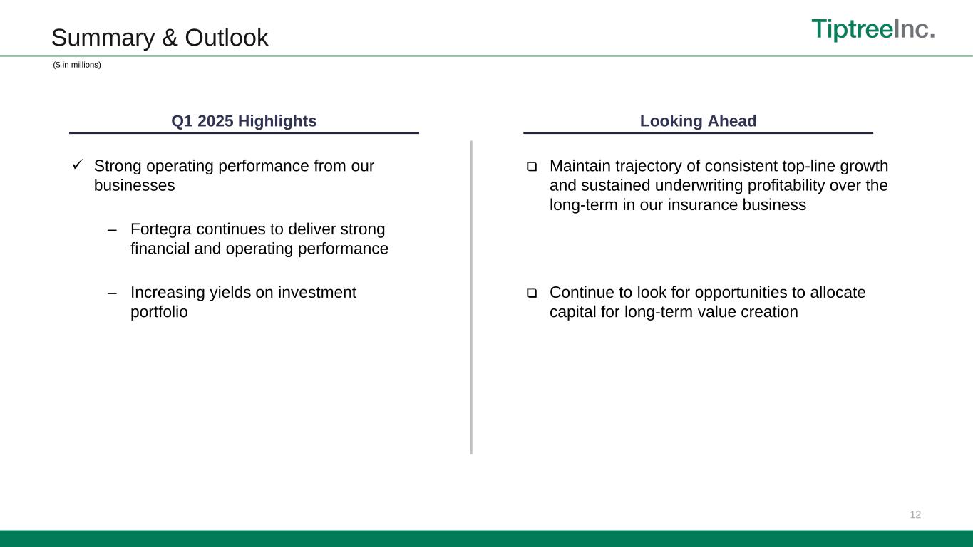 Continued Shareholder Value Creation 11 ($ in millions) Adjusted Net Income1 Adj ROAE%1 16.9% 22.9% $69.9 $102.9 LTM Q1'24 LTM Q1'25 $163 million1 $179 million4 10x – 32x6 (Median 17x) Peer Multiples LTM Adj. NI Warburg Transaction Multiple Total Diluted Shares 38.9 million5 13.5x2 1 See the appendix for a reconciliation of Non-GAAP measures including Adjusted Net Income and Adjusted return on average equity (annualized). 2 Based on Warburg Pincus valuation trailing multiple of 13.5x adjusted net income as of signing in September 2021. 3 Tiptree’s as converted ownership as of Q1’25 (including impact of employee stock awards at Fortegra) assuming valuation at 13.5x trailing adjusted net income 4 Includes Tiptree Inc. stockholders’ equity of Mortgage, Tiptree Capital – Other and Corporate, excluding the deferred tax liability relating to Tiptree’s investment in Fortegra. 5 Diluted shares as of March 31, 2025, represents basic outstanding shares of 37,493,883 plus dilutive shares of 1,373,871 which includes unvested RSUs and outstanding options (assumed to be exercised cashless). 6 Peer multiples include AFG, AIZ, BOW, KNSL, IGIC, MKL, PLMR, RLI, SKWD, WRB and represent share price as of 4/21/2024 over trailing twelve months EPS as of 12/31/2024. Source: S&P Capital IQ. 70% diluted ownership3 100% ownership Book value 29% year-over-year growth $(74.8) million Holding Company Debt