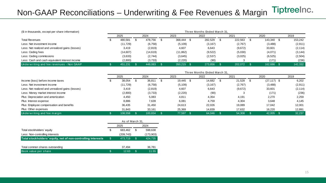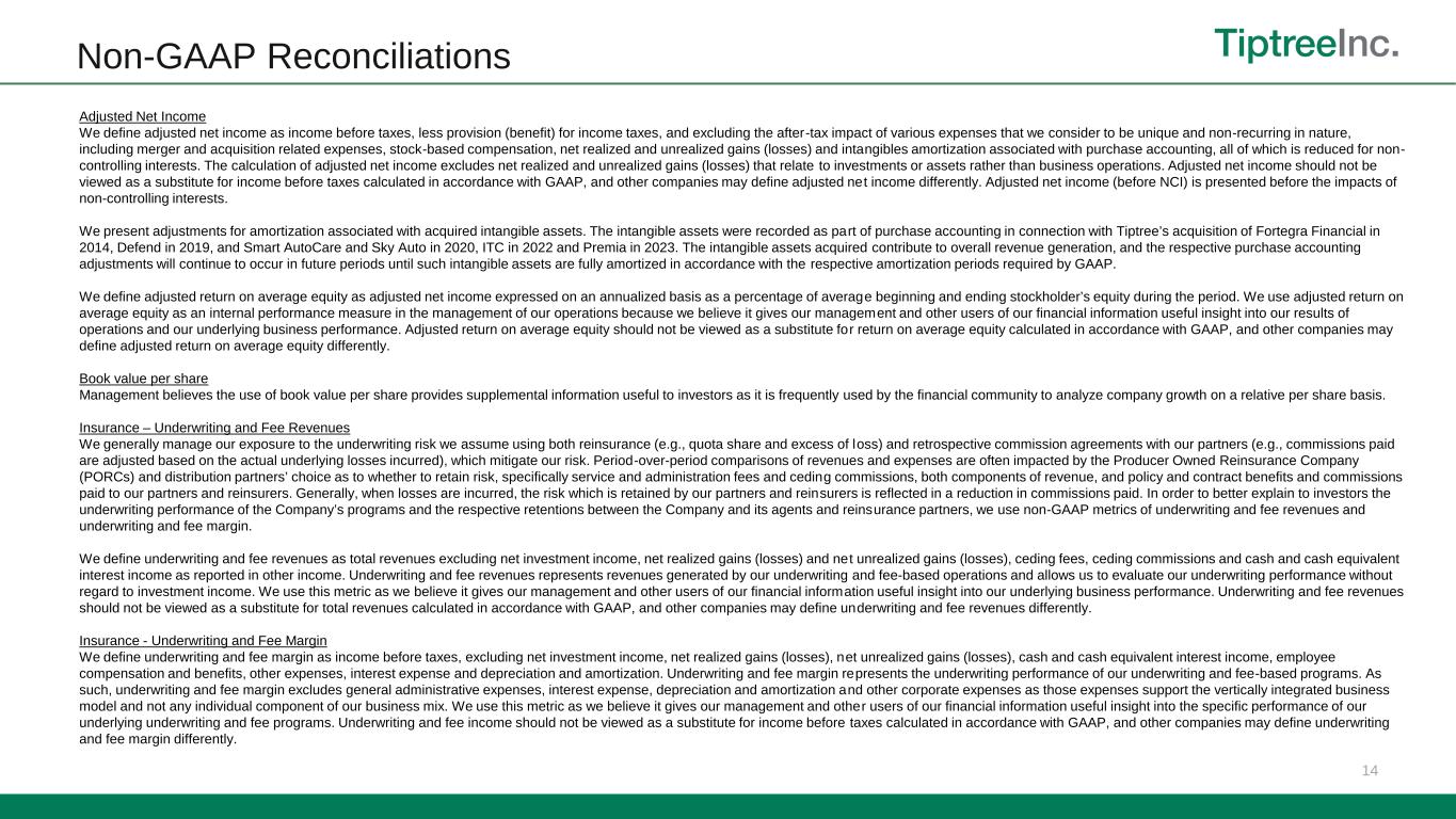 Non-GAAP Reconciliations 14 Adjusted Net Income We define adjusted net income as income before taxes, less provision (benefit) for income taxes, and excluding the after-tax impact of various expenses that we consider to be unique and non-recurring in nature, including merger and acquisition related expenses, stock-based compensation, net realized and unrealized gains (losses) and intangibles amortization associated with purchase accounting, all of which is reduced for non- controlling interests. The calculation of adjusted net income excludes net realized and unrealized gains (losses) that relate to investments or assets rather than business operations. Adjusted net income should not be viewed as a substitute for income before taxes calculated in accordance with GAAP, and other companies may define adjusted net income differently. Adjusted net income (before NCI) is presented before the impacts of non-controlling interests. We present adjustments for amortization associated with acquired intangible assets. The intangible assets were recorded as part of purchase accounting in connection with Tiptree’s acquisition of Fortegra Financial in 2014, Defend in 2019, and Smart AutoCare and Sky Auto in 2020, ITC in 2022 and Premia in 2023. The intangible assets acquired contribute to overall revenue generation, and the respective purchase accounting adjustments will continue to occur in future periods until such intangible assets are fully amortized in accordance with the respective amortization periods required by GAAP. We define adjusted return on average equity as adjusted net income expressed on an annualized basis as a percentage of average beginning and ending stockholder’s equity during the period. We use adjusted return on average equity as an internal performance measure in the management of our operations because we believe it gives our management and other users of our financial information useful insight into our results of operations and our underlying business performance. Adjusted return on average equity should not be viewed as a substitute for return on average equity calculated in accordance with GAAP, and other companies may define adjusted return on average equity differently. Book value per share Management believes the use of book value per share provides supplemental information useful to investors as it is frequently used by the financial community to analyze company growth on a relative per share basis. Insurance – Underwriting and Fee Revenues We generally manage our exposure to the underwriting risk we assume using both reinsurance (e.g., quota share and excess of loss) and retrospective commission agreements with our partners (e.g., commissions paid are adjusted based on the actual underlying losses incurred), which mitigate our risk. Period-over-period comparisons of revenues and expenses are often impacted by the Producer Owned Reinsurance Company (PORCs) and distribution partners’ choice as to whether to retain risk, specifically service and administration fees and ceding commissions, both components of revenue, and policy and contract benefits and commissions paid to our partners and reinsurers. Generally, when losses are incurred, the risk which is retained by our partners and reinsurers is reflected in a reduction in commissions paid. In order to better explain to investors the underwriting performance of the Company’s programs and the respective retentions between the Company and its agents and reinsurance partners, we use non-GAAP metrics of underwriting and fee revenues and underwriting and fee margin. We define underwriting and fee revenues as total revenues excluding net investment income, net realized gains (losses) and net unrealized gains (losses), ceding fees, ceding commissions and cash and cash equivalent interest income as reported in other income. Underwriting and fee revenues represents revenues generated by our underwriting and fee-based operations and allows us to evaluate our underwriting performance without regard to investment income. We use this metric as we believe it gives our management and other users of our financial information useful insight into our underlying business performance. Underwriting and fee revenues should not be viewed as a substitute for total revenues calculated in accordance with GAAP, and other companies may define underwriting and fee revenues differently. Insurance - Underwriting and Fee Margin We define underwriting and fee margin as income before taxes, excluding net investment income, net realized gains (losses), net unrealized gains (losses), cash and cash equivalent interest income, employee compensation and benefits, other expenses, interest expense and depreciation and amortization. Underwriting and fee margin represents the underwriting performance of our underwriting and fee-based programs. As such, underwriting and fee margin excludes general administrative expenses, interest expense, depreciation and amortization and other corporate expenses as those expenses support the vertically integrated business model and not any individual component of our business mix. We use this metric as we believe it gives our management and other users of our financial information useful insight into the specific performance of our underlying underwriting and fee programs. Underwriting and fee income should not be viewed as a substitute for income before taxes calculated in accordance with GAAP, and other companies may define underwriting and fee margin differently.