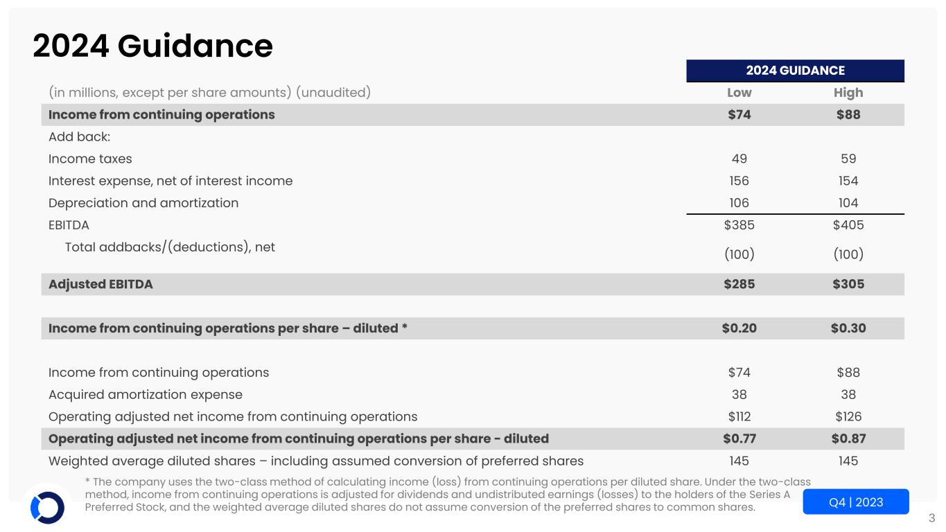 3 Q4 | 2023 2024 Guidance 2024 GUIDANCE (in millions, except per share amounts) (unaudited) Low High Income from continuing operations $74 $88 Add back: Income taxes 49 59 Interest expense, net of interest income 156 154 Depreciation and amortization 106 104 EBITDA $385 $405 Total addbacks/(deductions), net (100) (100) Adjusted EBITDA $285 $305 Income from continuing operations per share – diluted * $0.20 $0.30 Income from continuing operations $74 $88 Acquired amortization expense 38 38 Operating adjusted net income from continuing operations $112 $126 Operating adjusted net income from continuing operations per share - diluted $0.77 $0.87 Weighted average diluted shares – including assumed conversion of preferred shares 145 145 * The company uses the two-class method of calculating income (loss) from continuing operations per diluted share. Under the two-class method, income from continuing operations is adjusted for dividends and undistributed earnings (losses) to the holders of the Series A Preferred Stock, and the weighted average diluted shares do not assume conversion of the preferred shares to common shares.